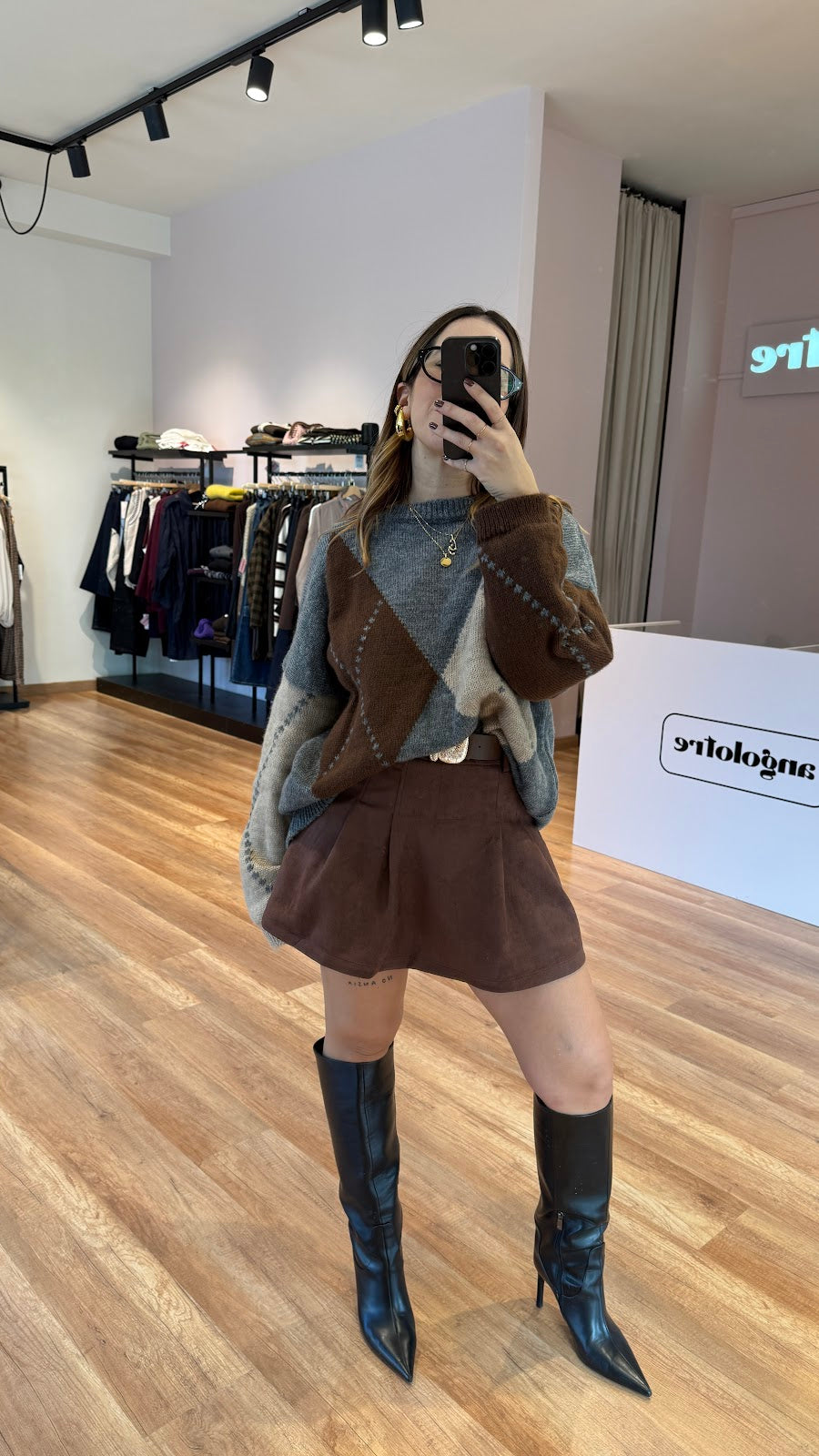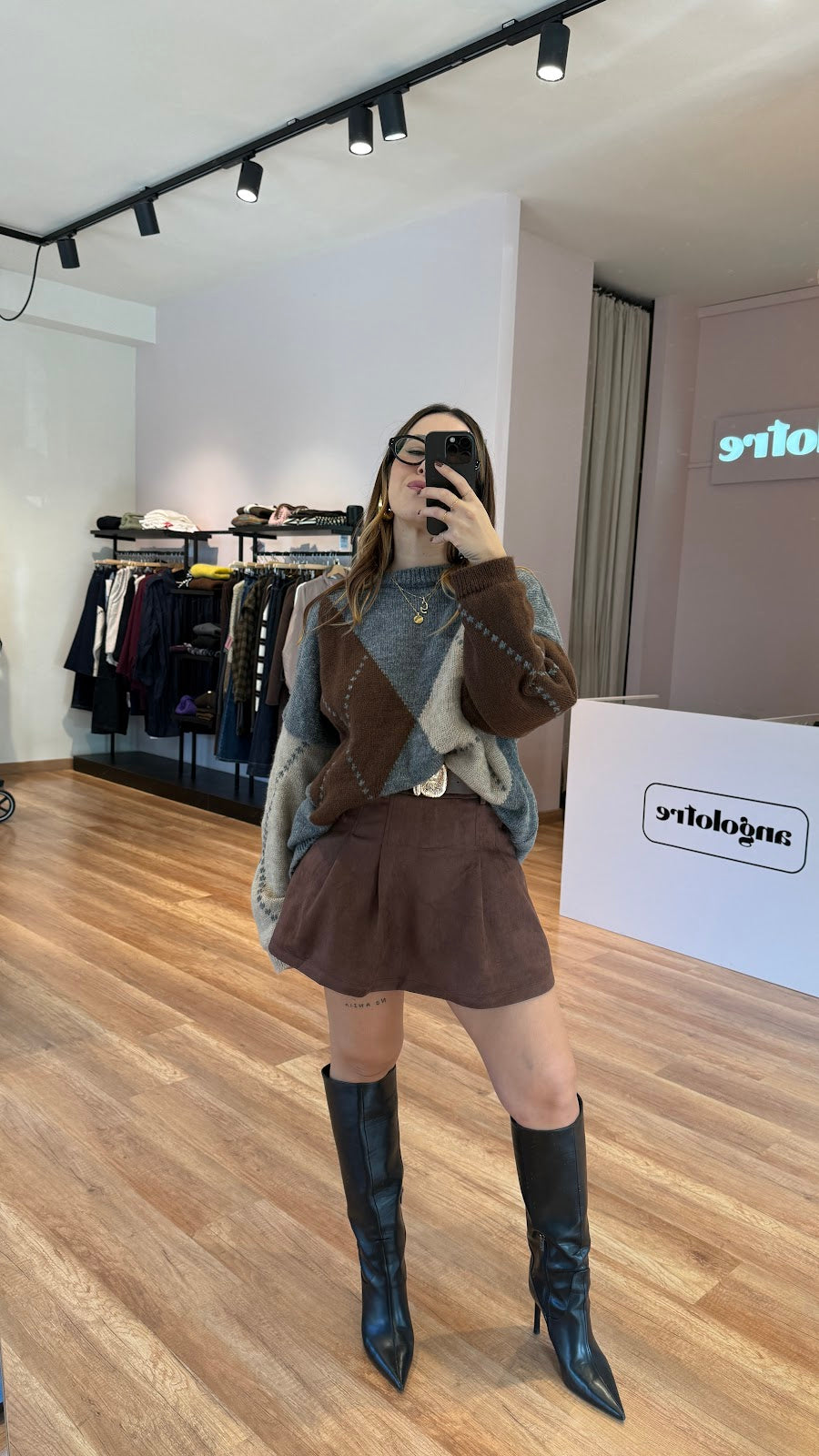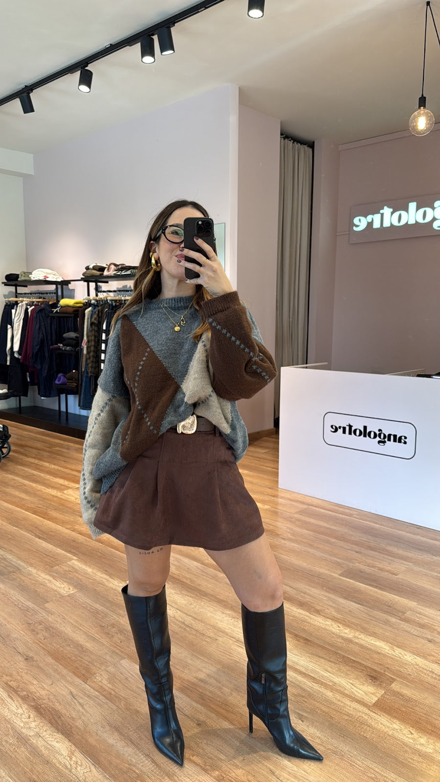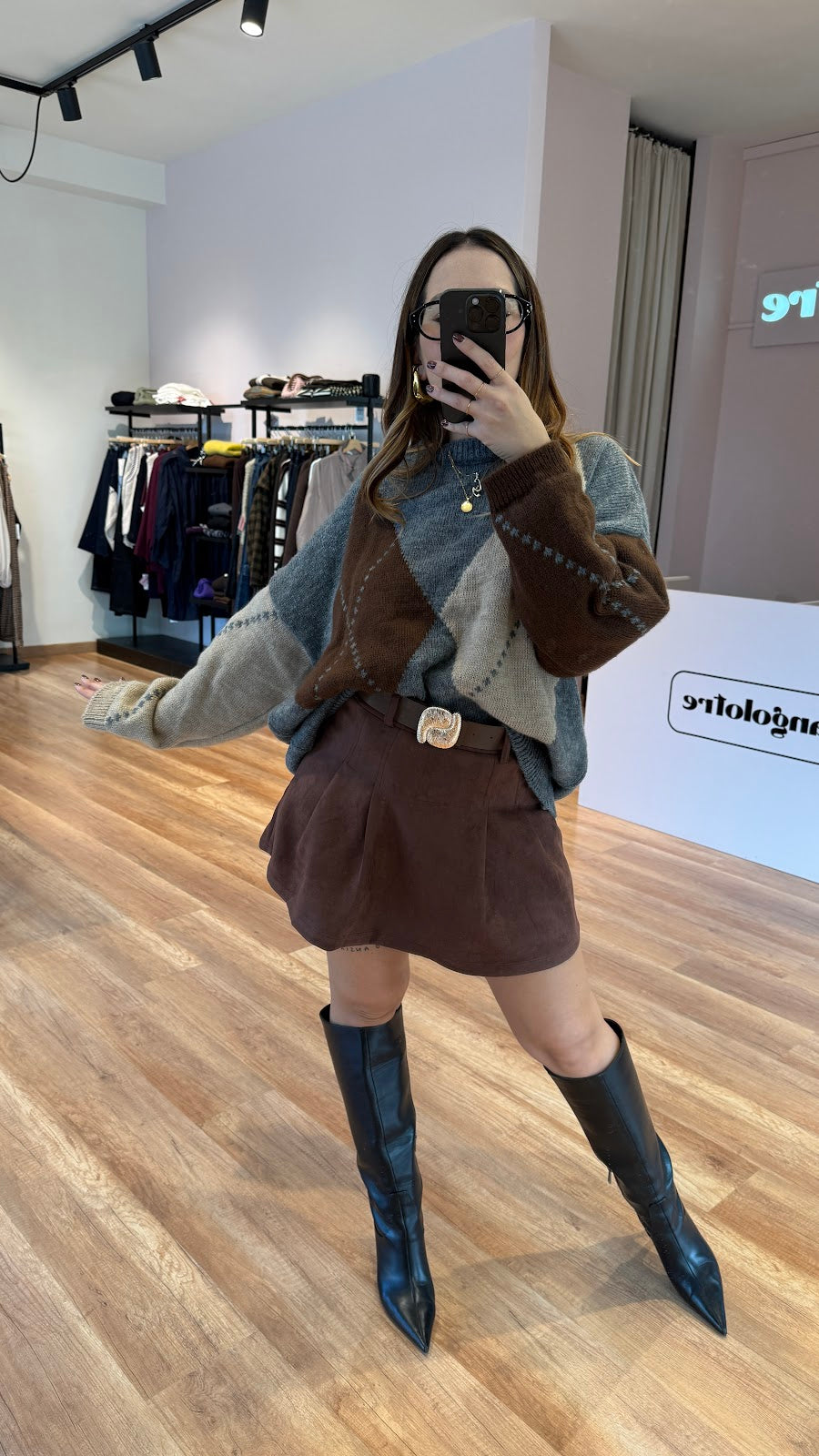 Mini gonna a campana in camoscio, con pantaloncino. Cintina compresa. Greta indossa la taglia S.