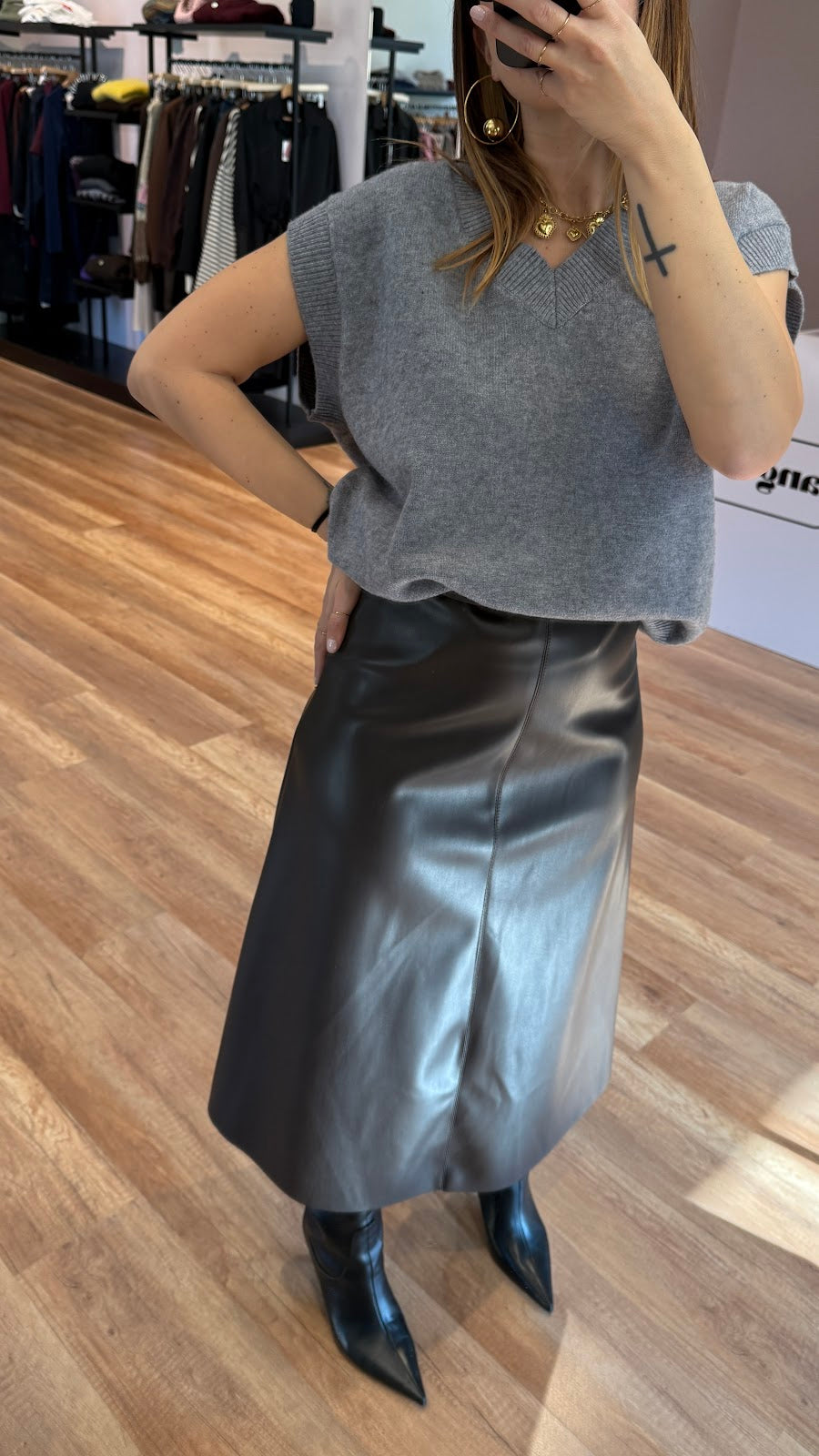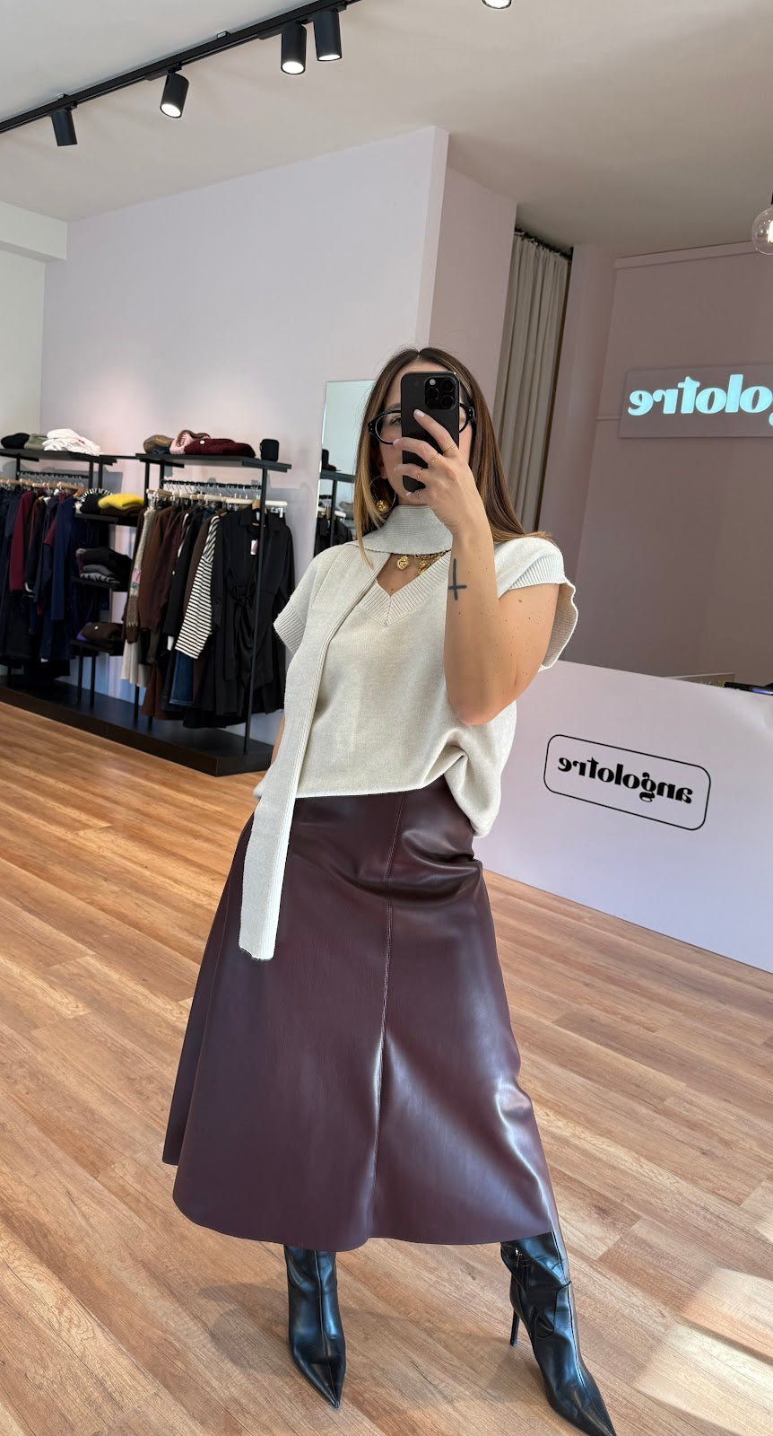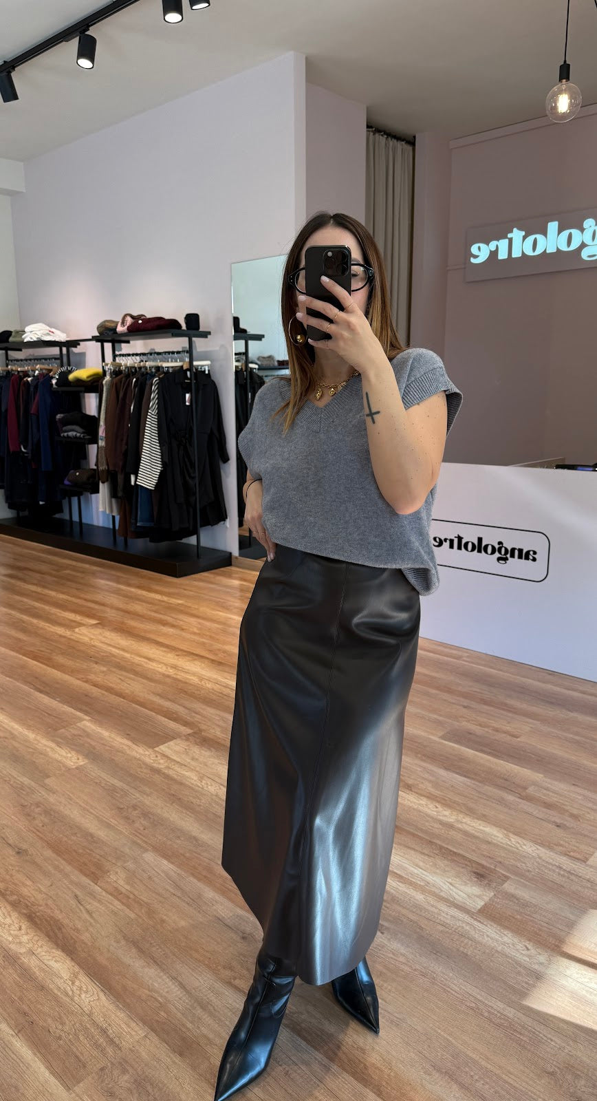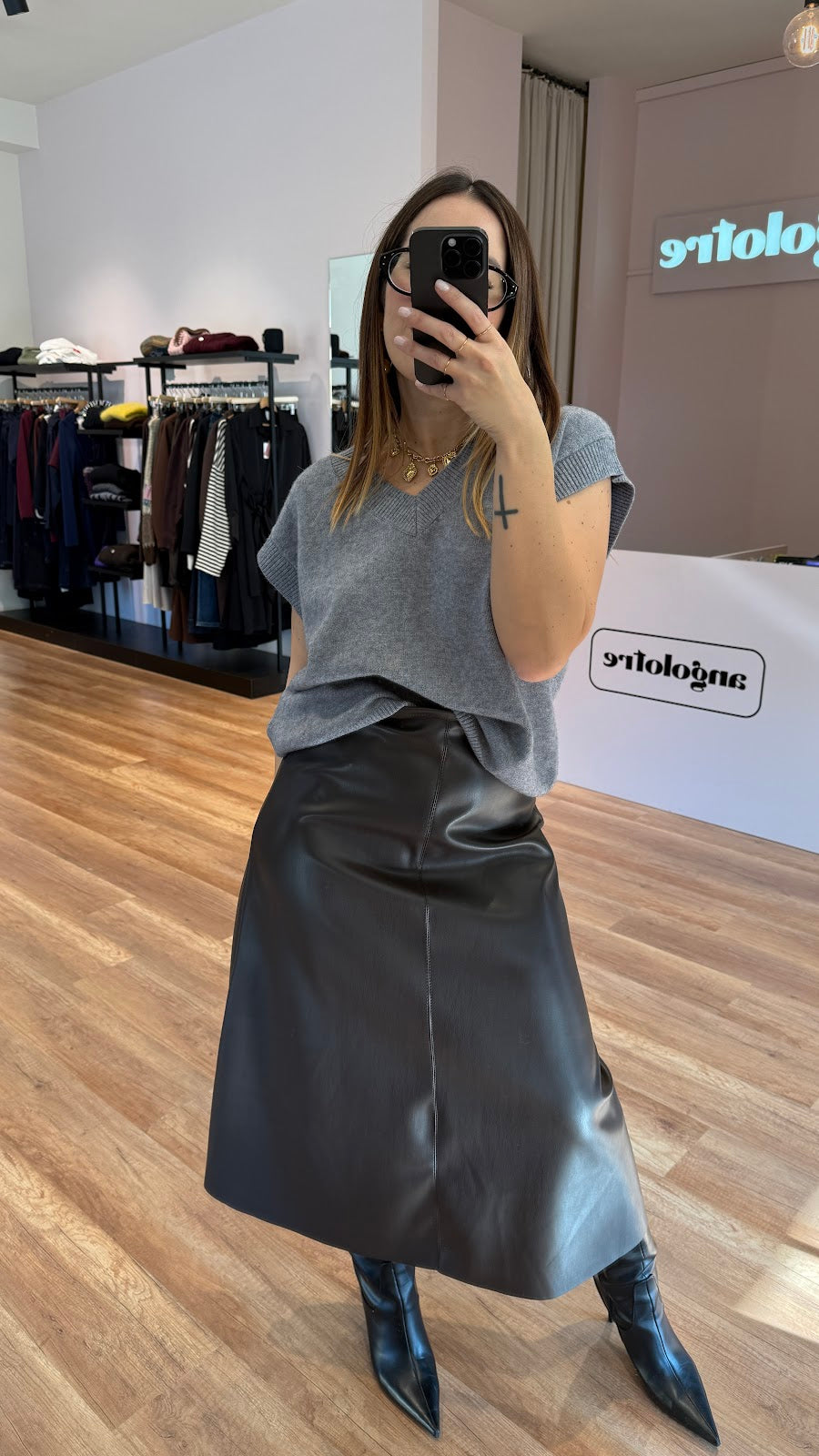 Gonna midi in ecopelle a campana, chiusura con zip laterale. Greta indossa la taglia S.