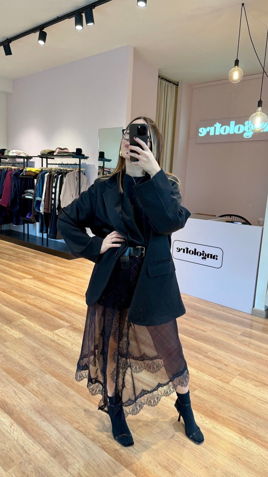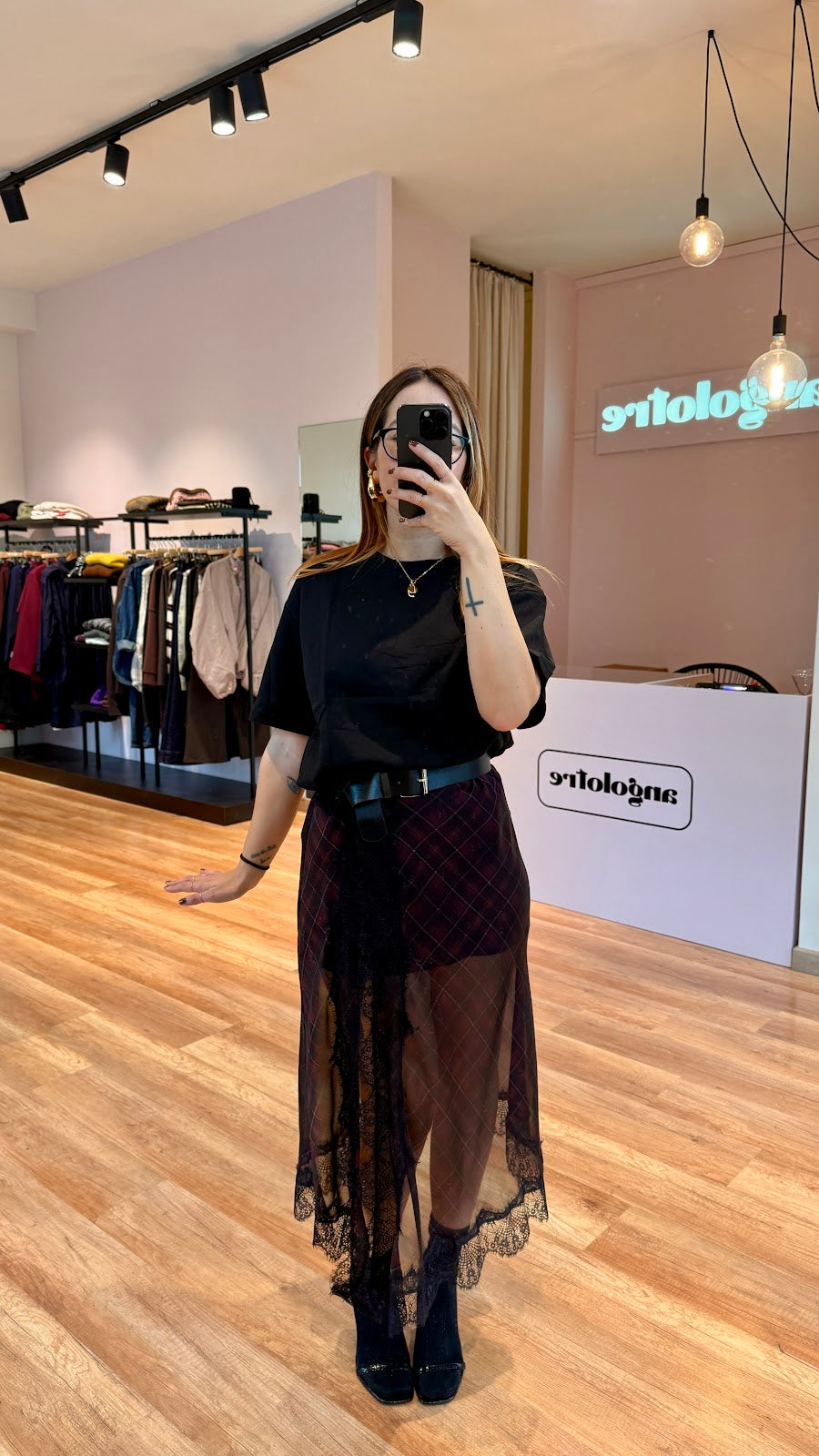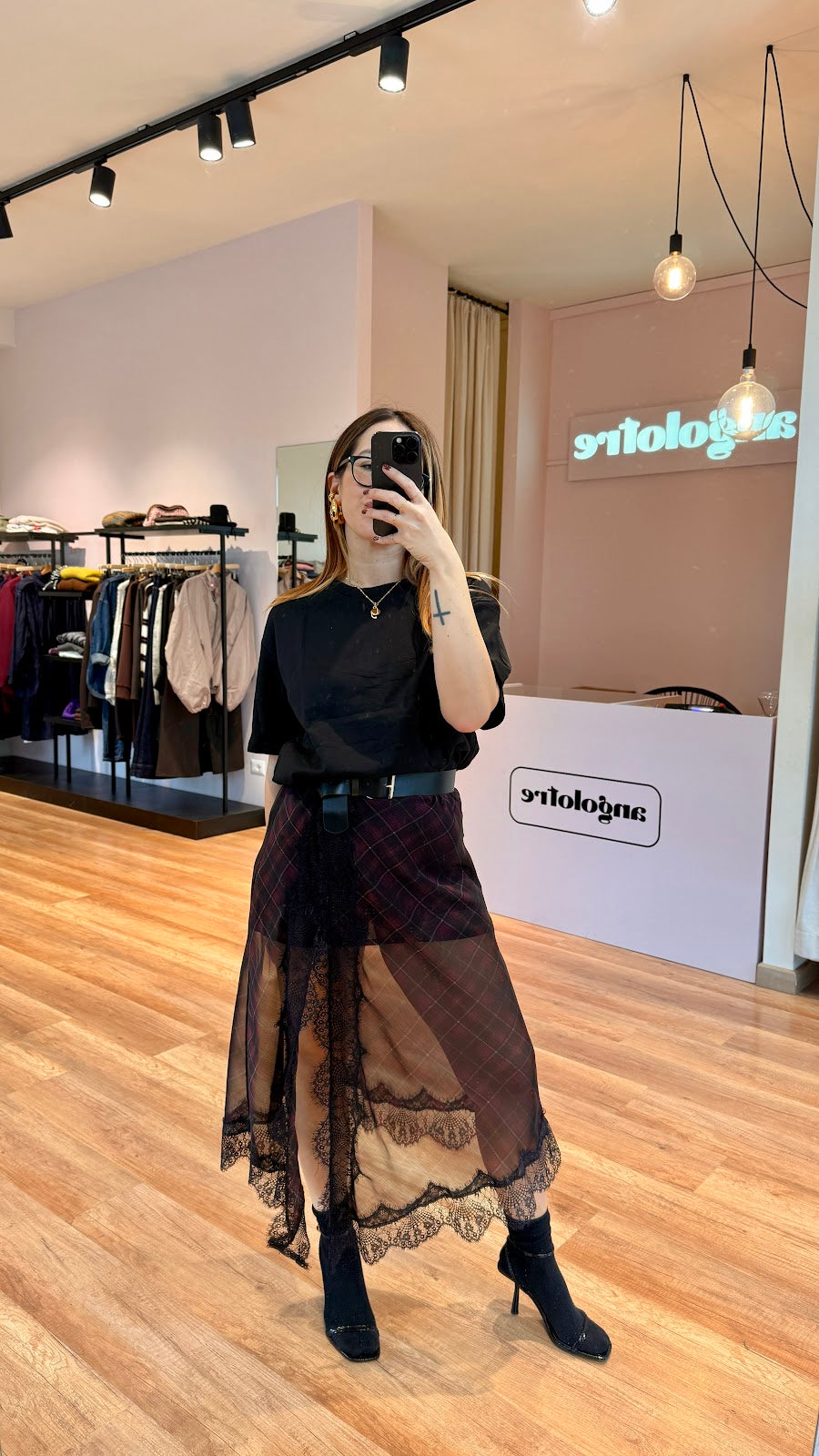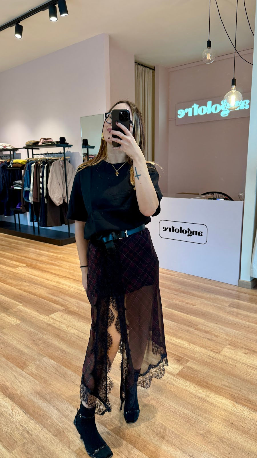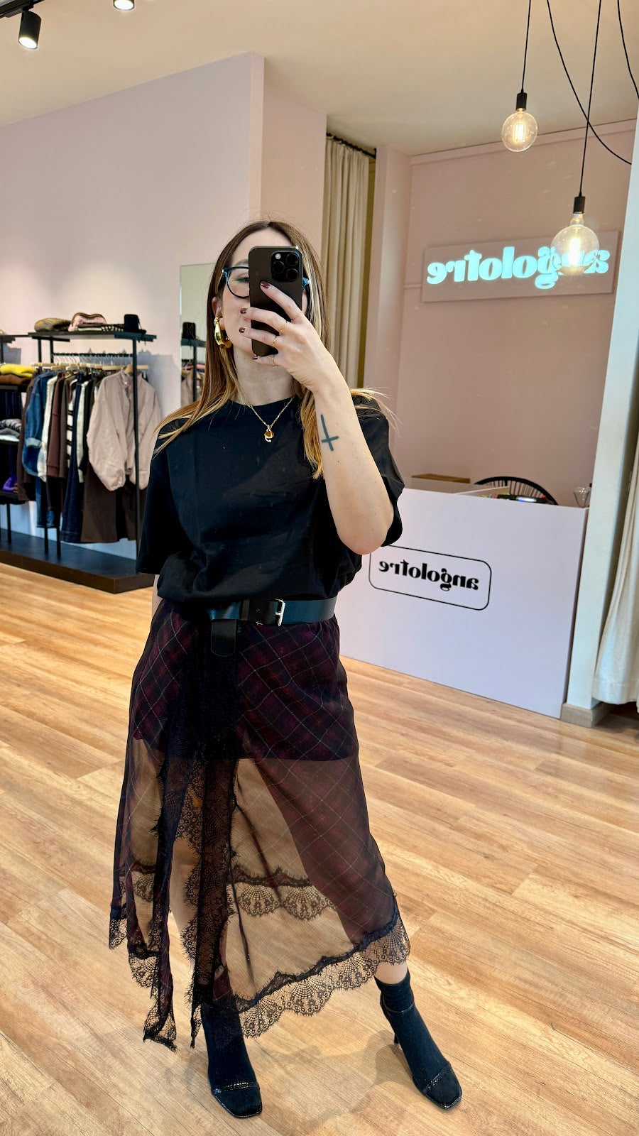 Gonna Lumina midi a doppio strato con stampa a scacchi e tulle. Presenta pizzo e spacco anteriore. Vita elasticizzata. Greta indossa una taglia S/M.