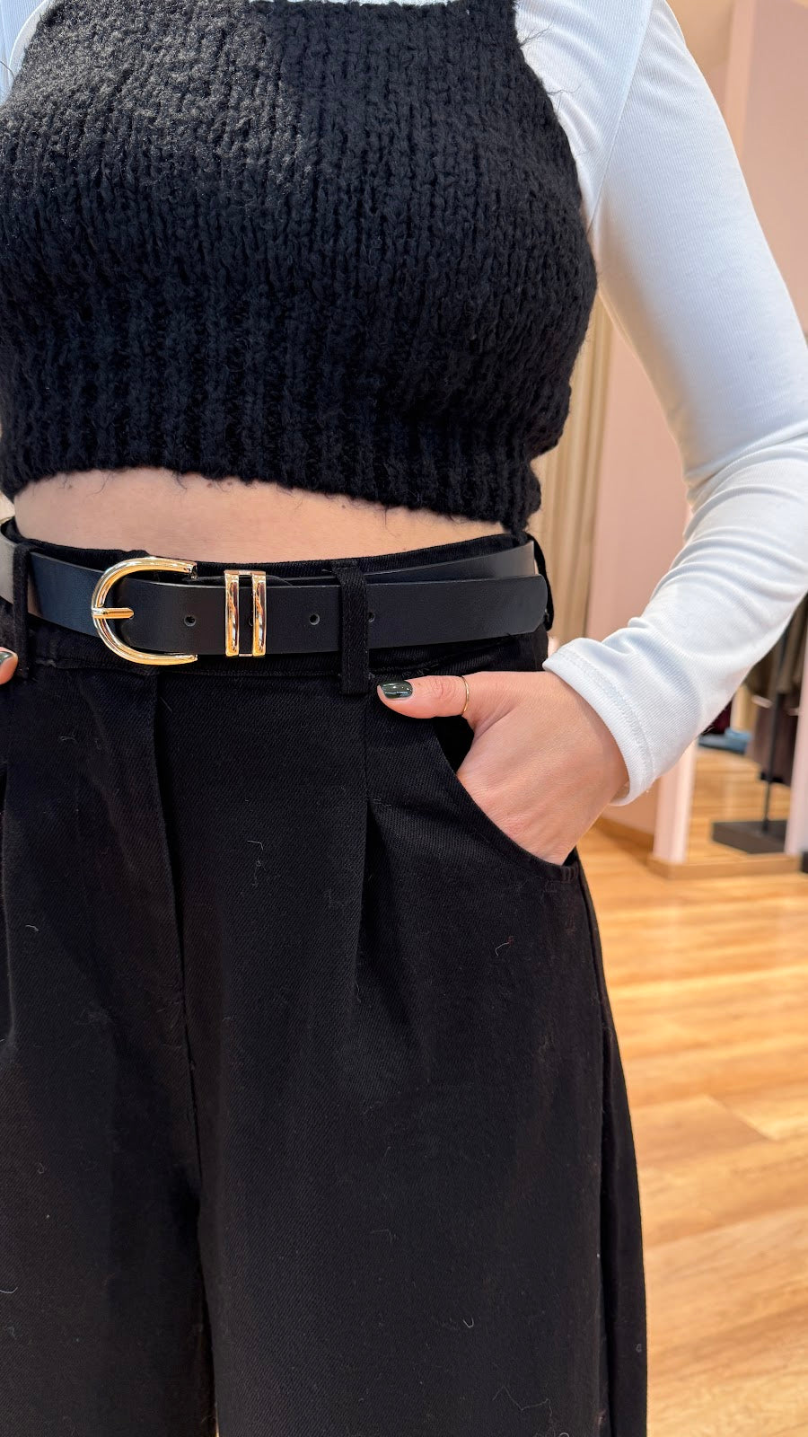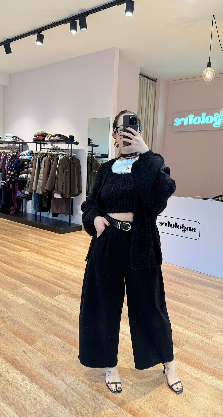 Jeans baggy nero, con elastico dietro e pinces sul davanti. Greta indossa la taglia S/M.