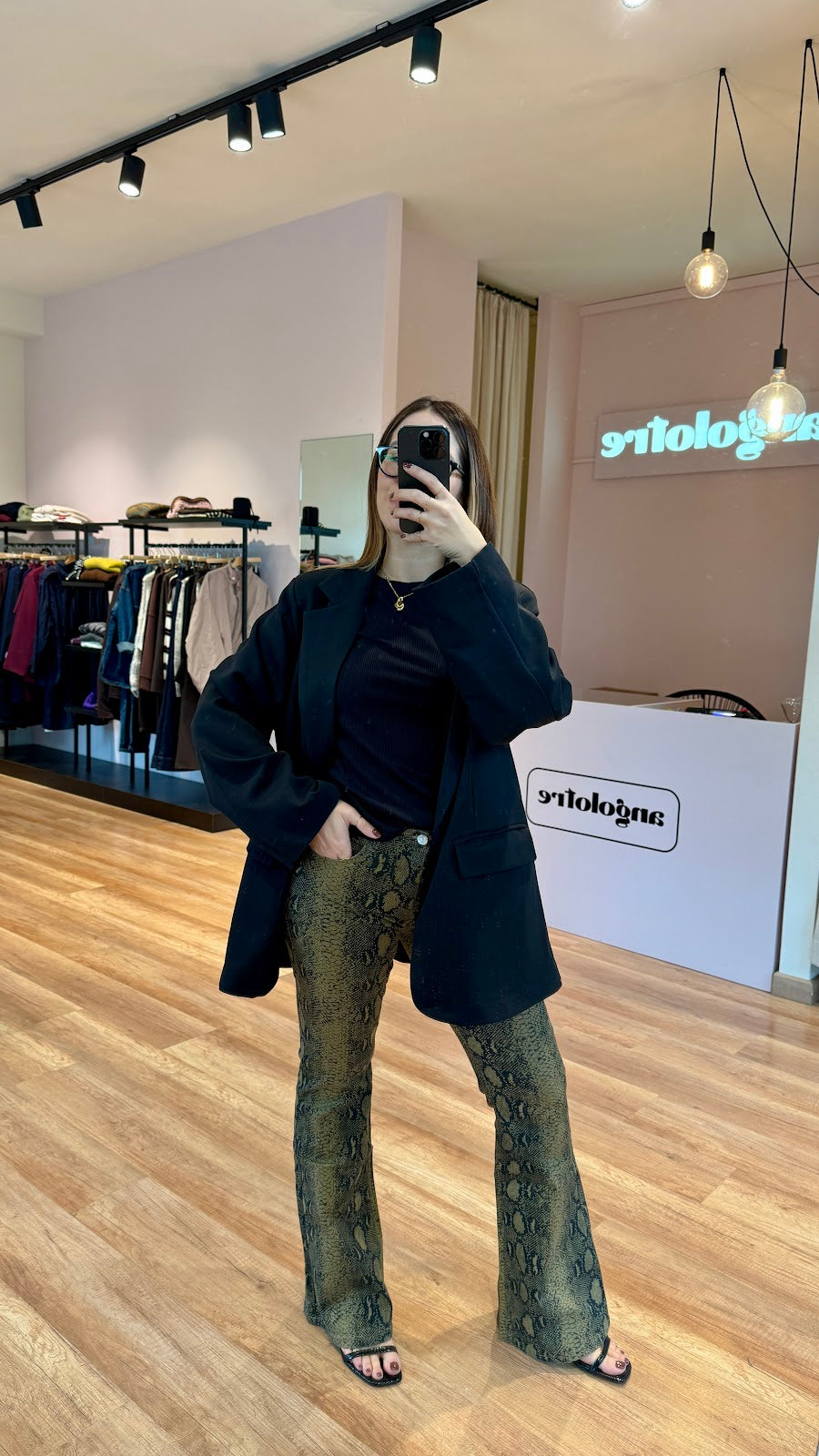 Jeans cinque tasche a zampa, elasticizzato, fantasia pitonata. Greta indossa una taglia M.