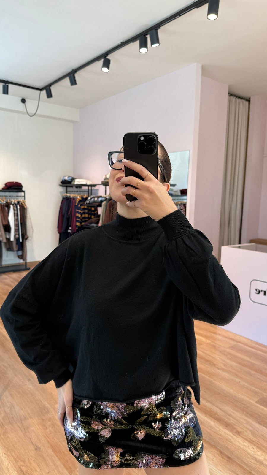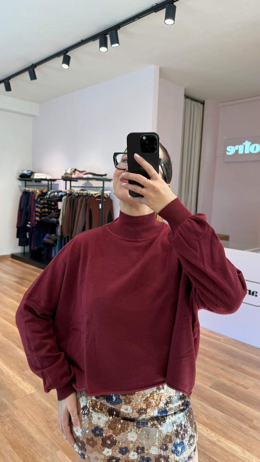 Maglia KikiSix crop a scatolina, mezzo collo in misto viscosa. Greta veste una taglia 40/42.