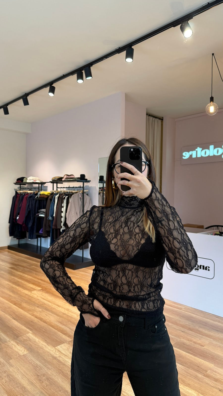Maglia Lumina in pizzo semitrasparente, manica lunga a guanto, con mezzo collo. Greta indossa una taglia S/M.