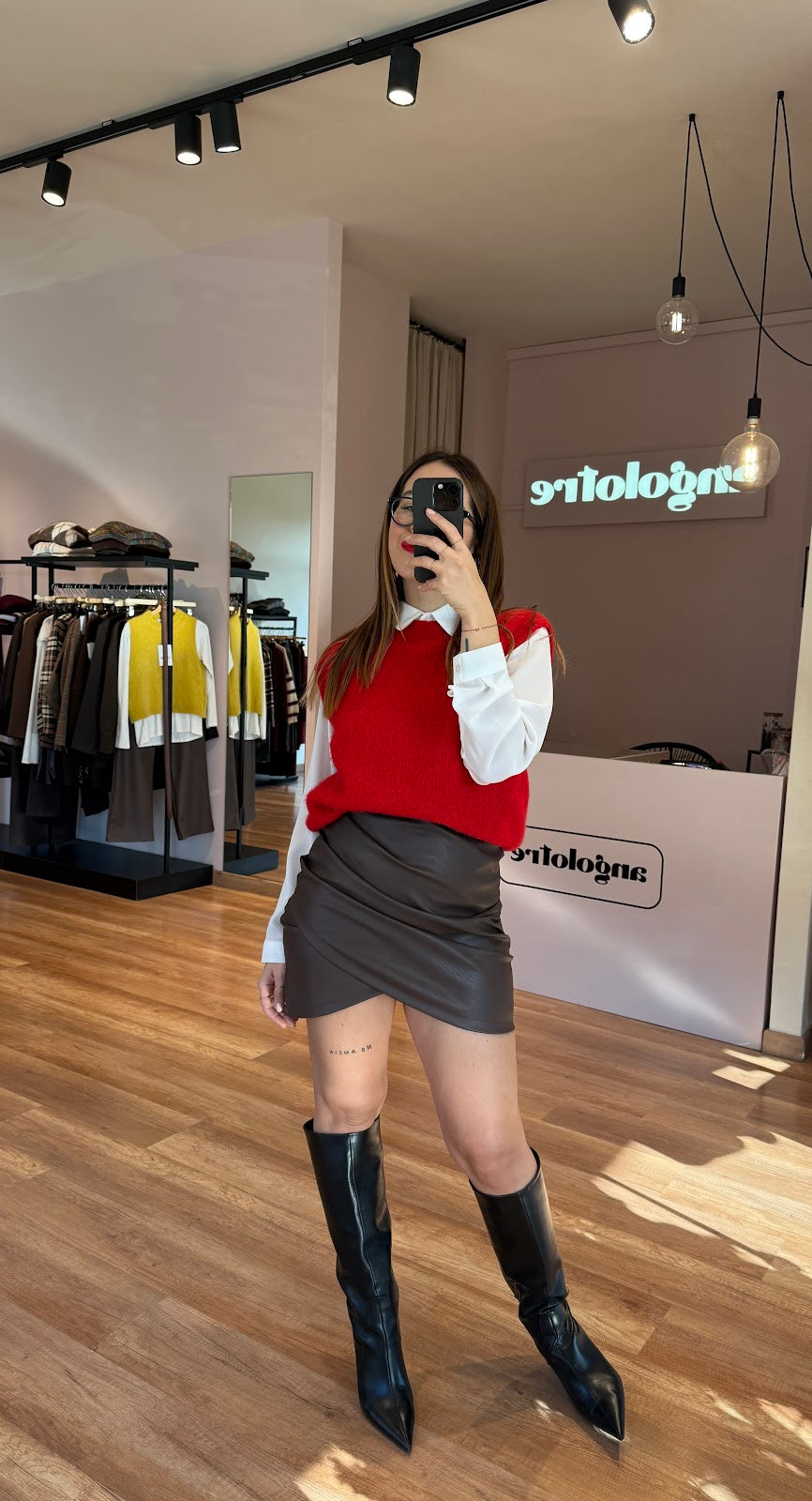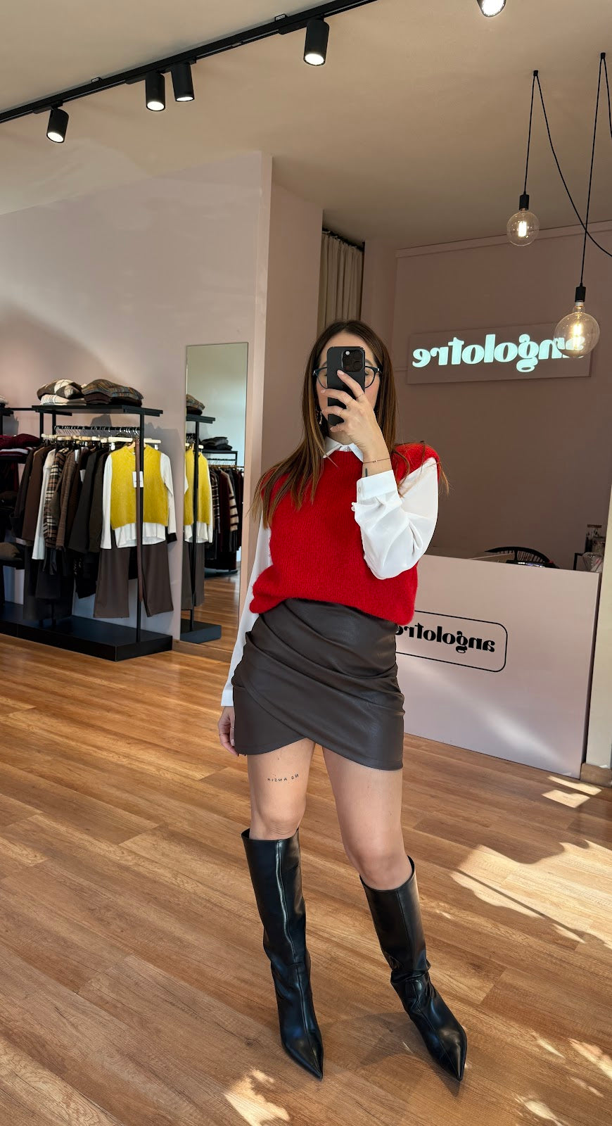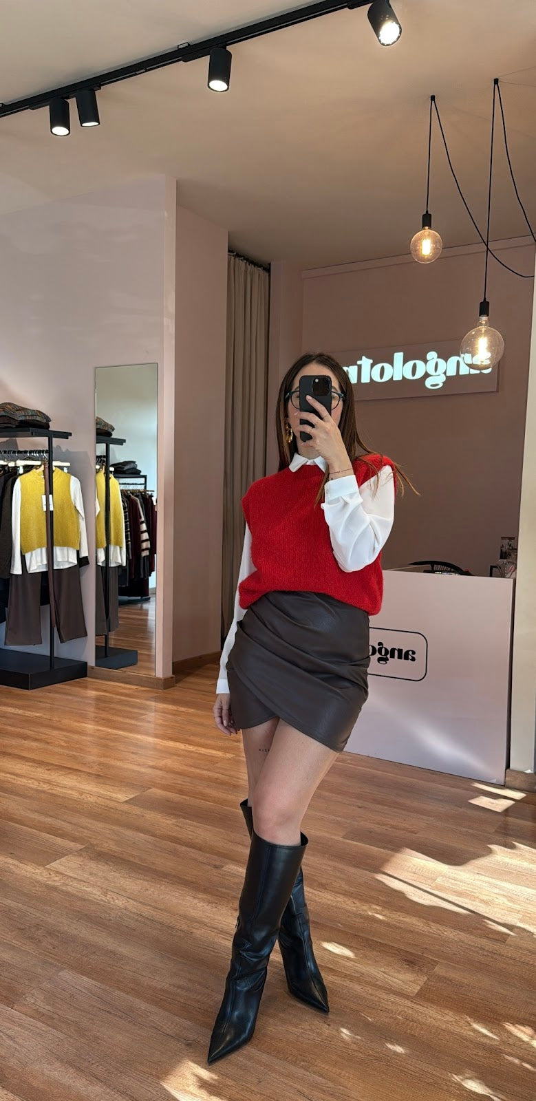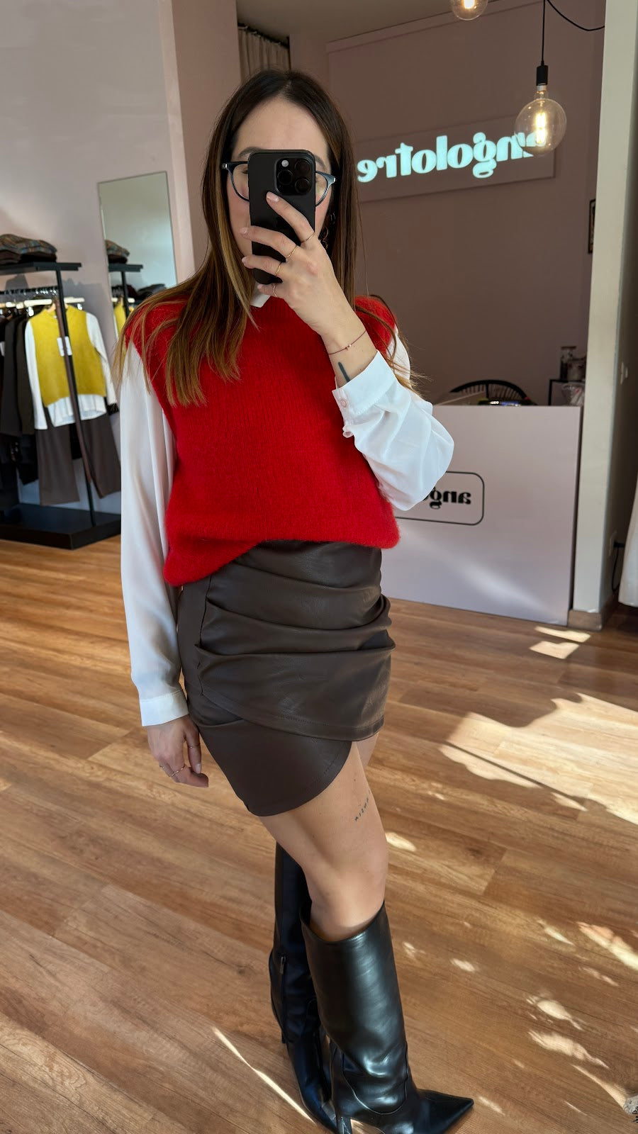 Mini in ecopelle con drappeggio laterale. Chiusura con zip. Greta indossa la taglia M.
