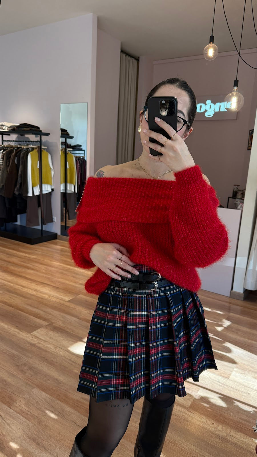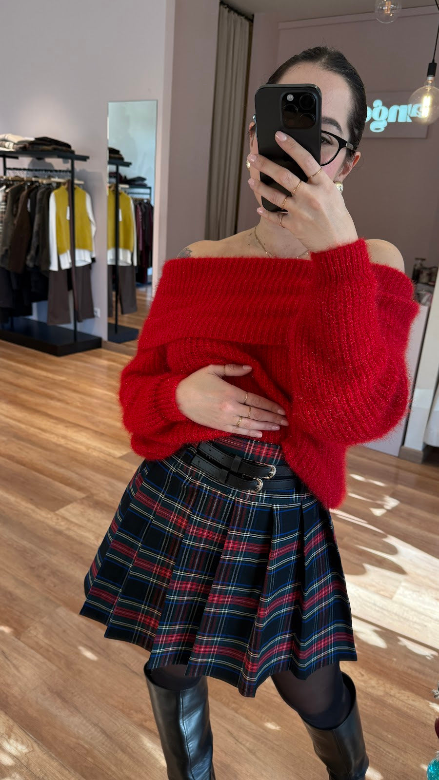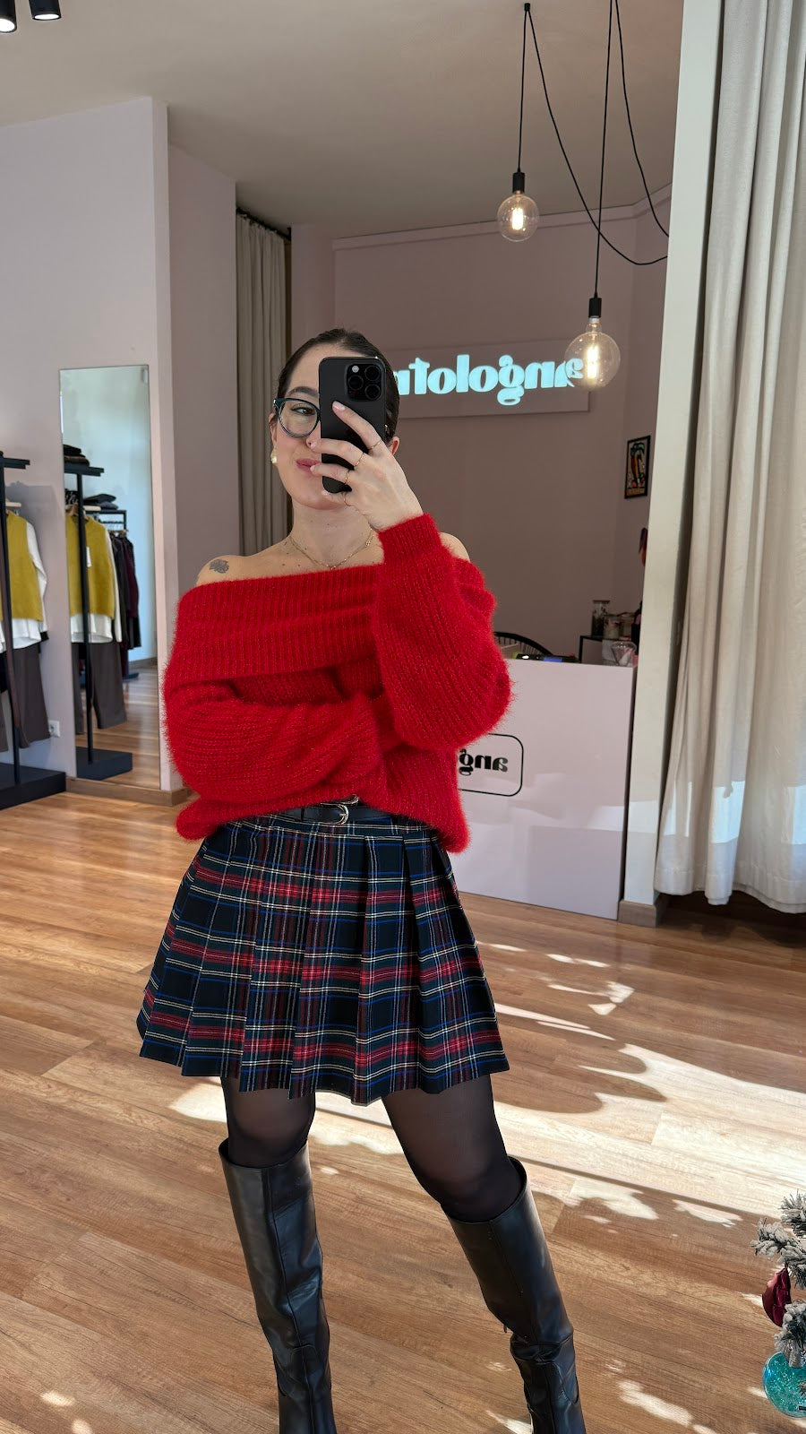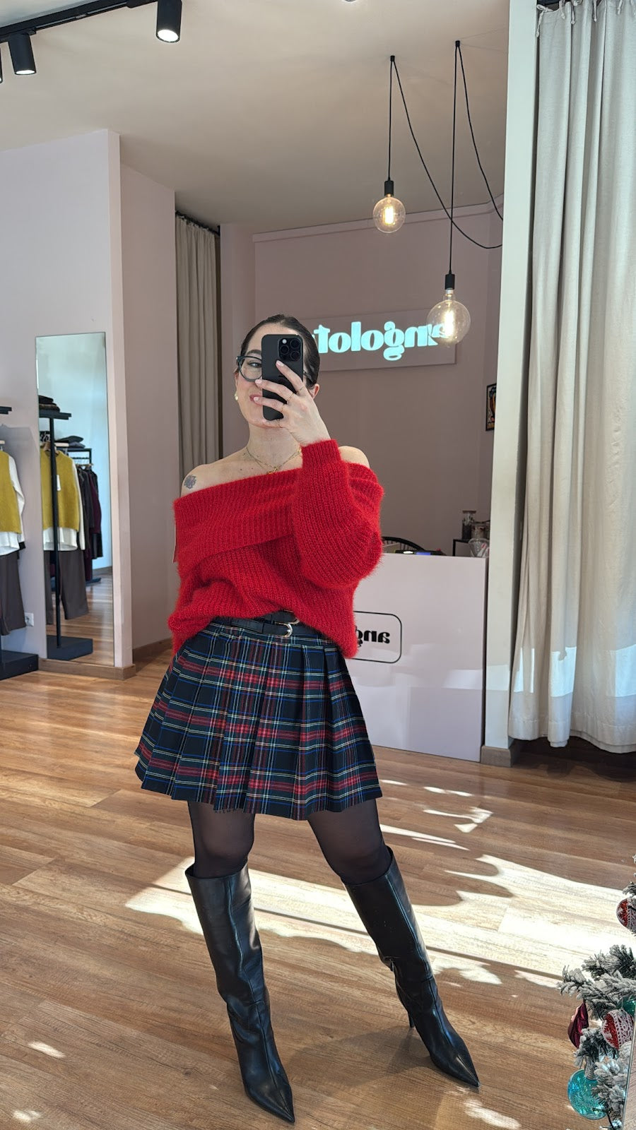 Mini fantasia tartan a pieghe, con doppio passante e doppia cinta compresa, chiusura con zip laterale. Greta veste una taglia 40/42.