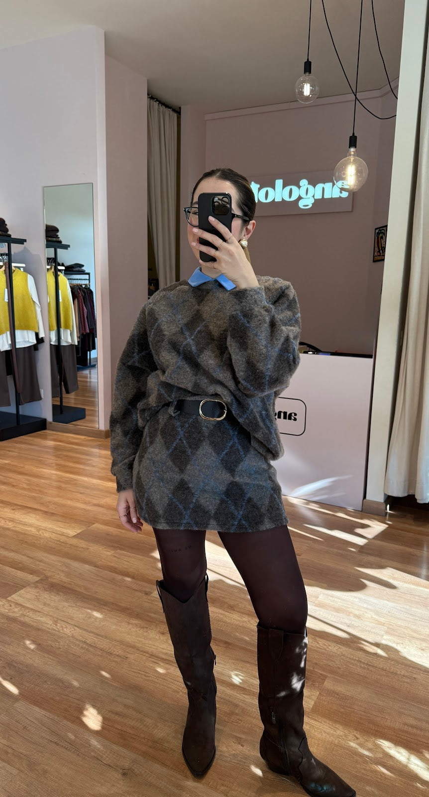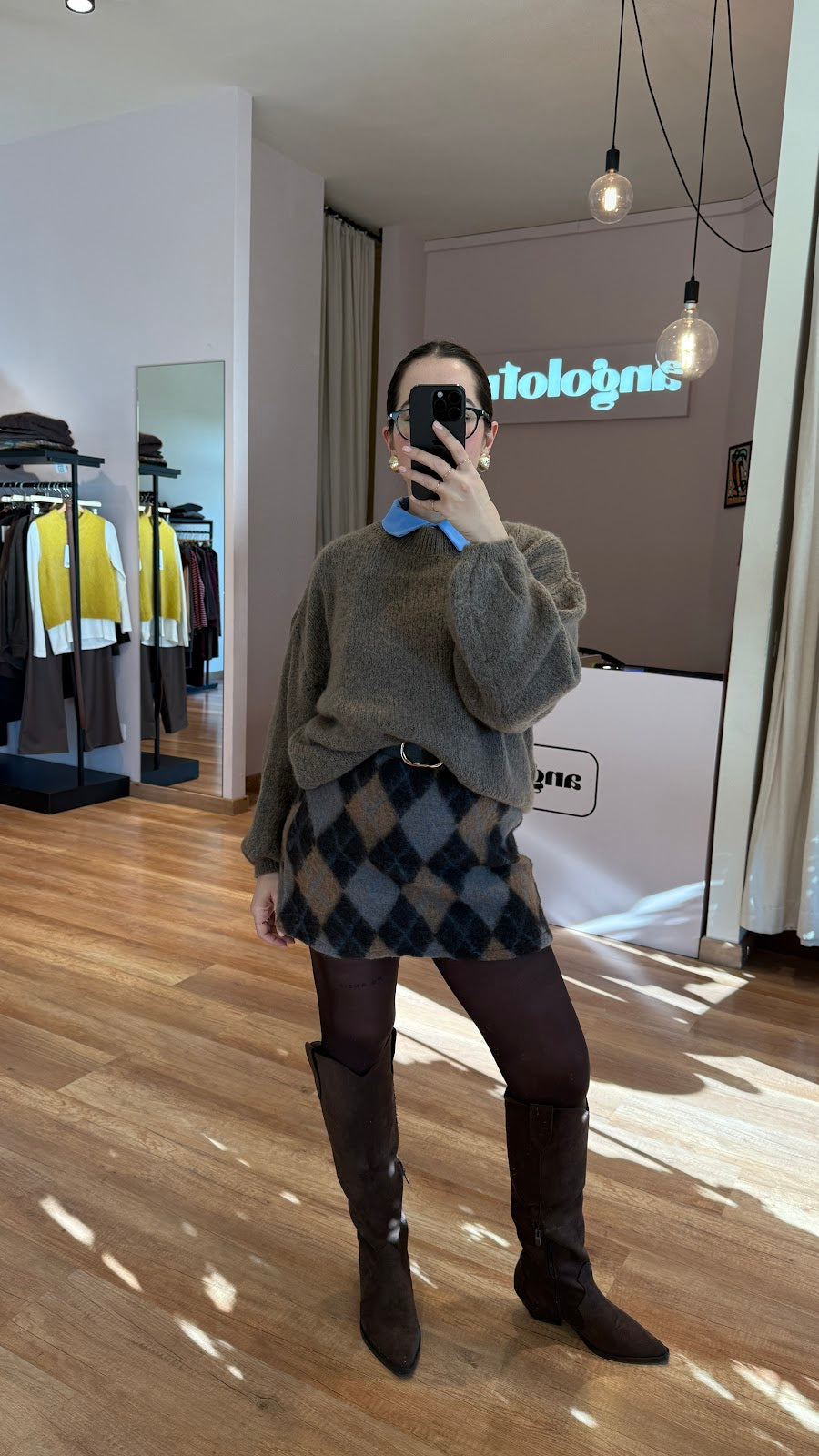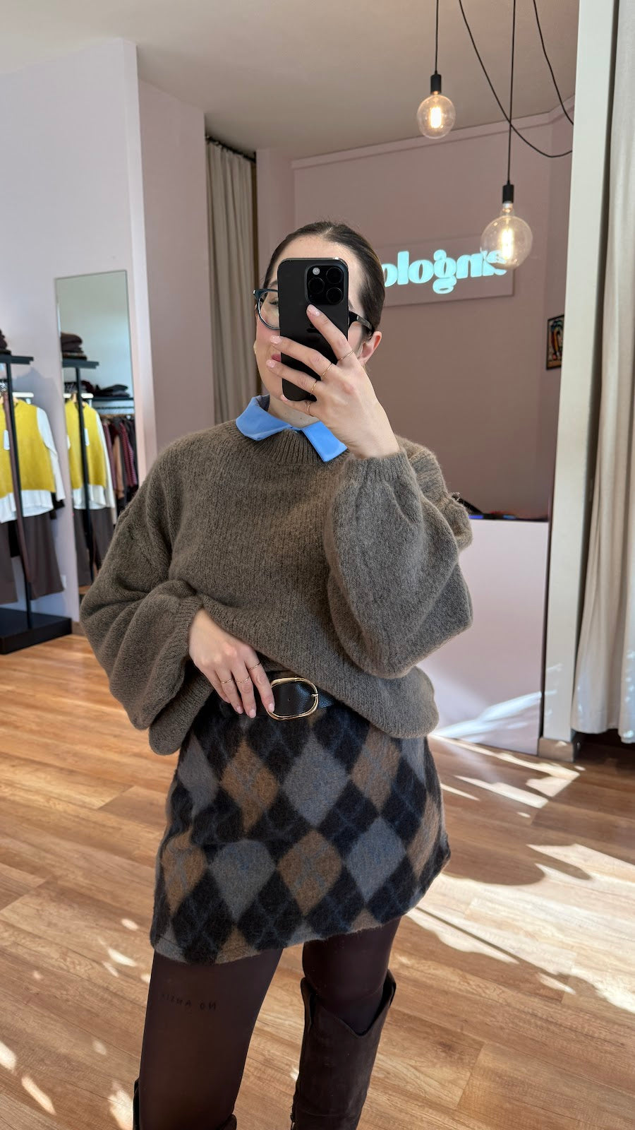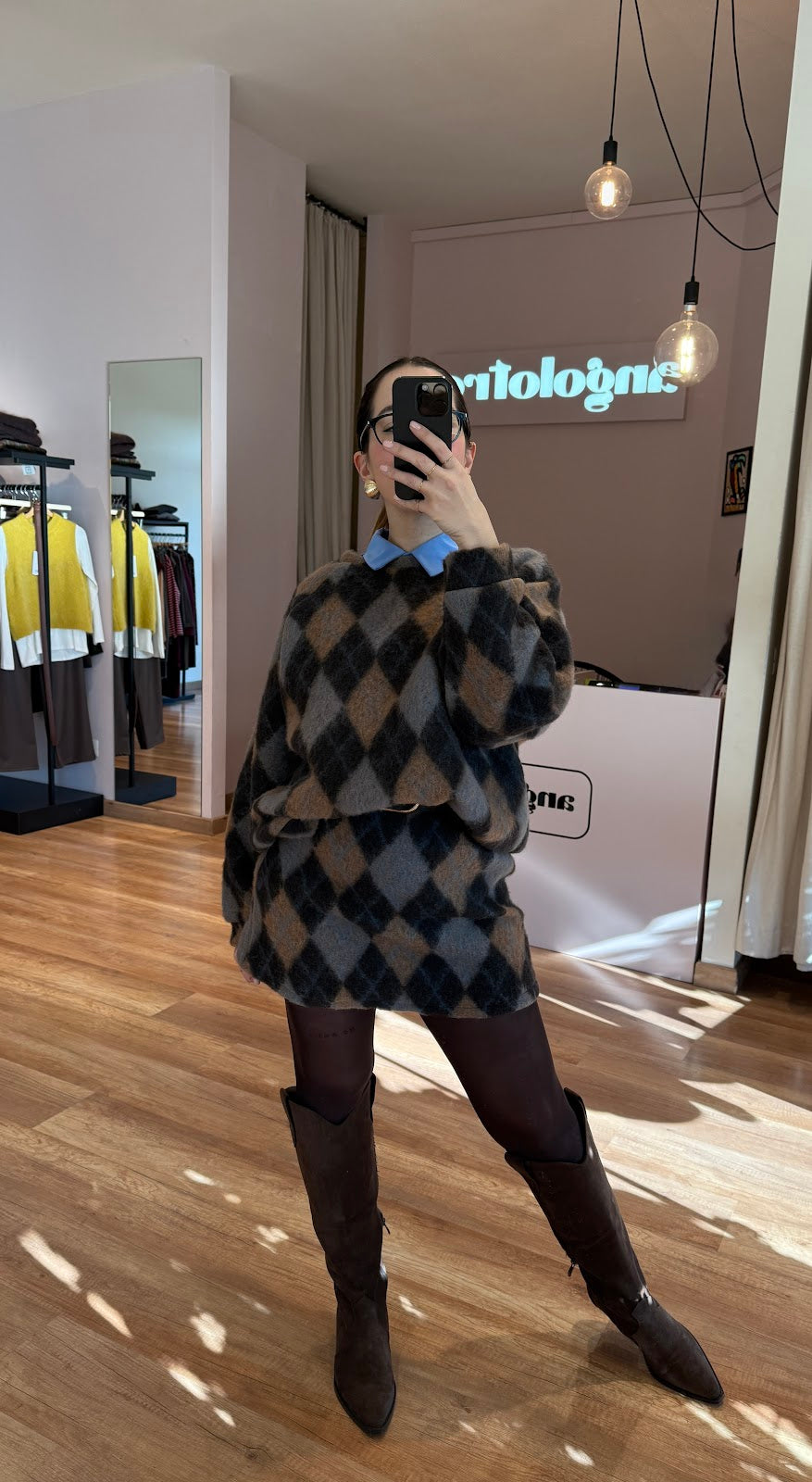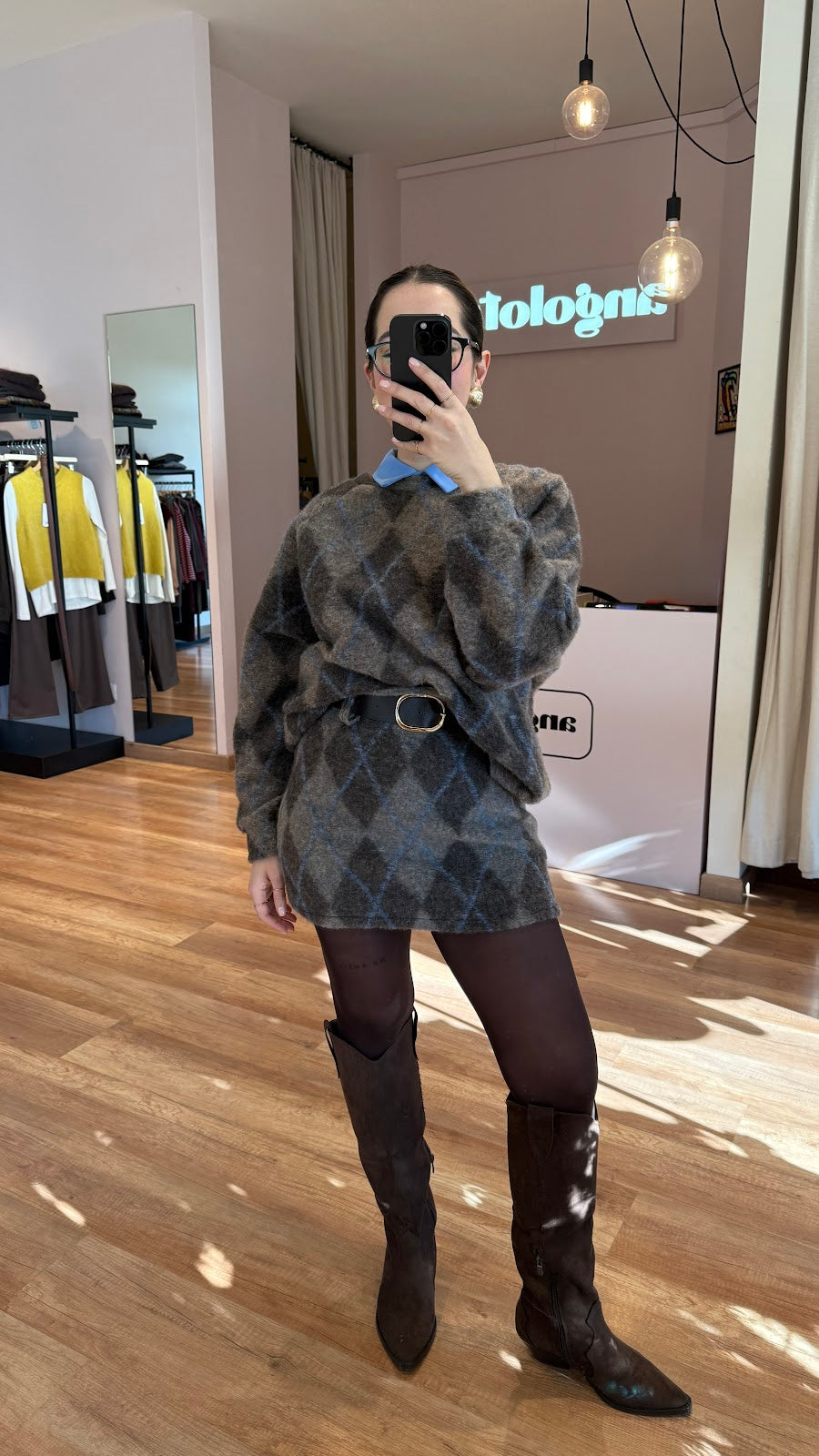 Mini in lana cotta fantasia rombi, con cintura in vita più passanti. Greta veste una taglia 40/42.