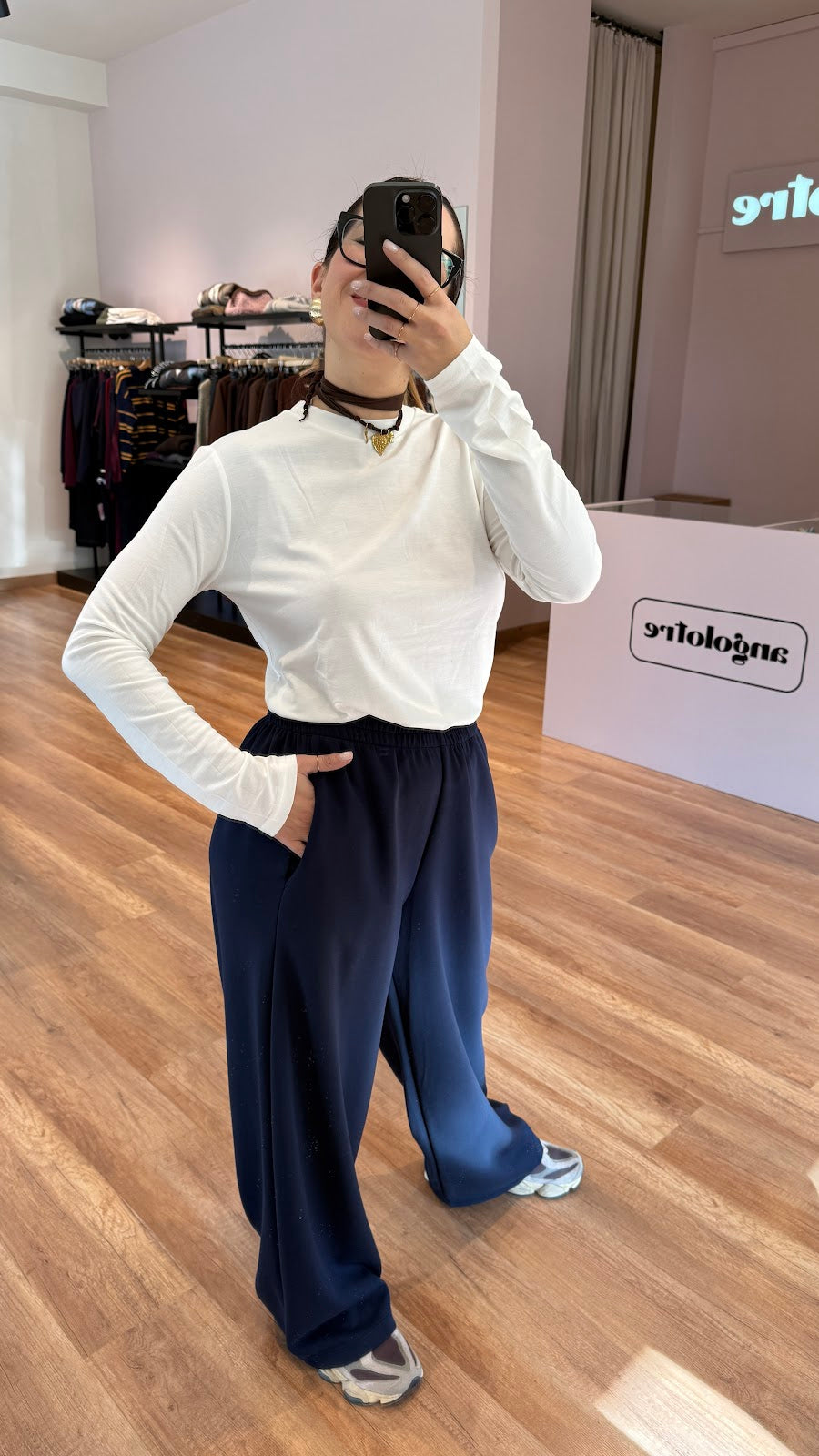 Pantalone jogger a palazzo, elastico in vita in tessuto scuba. Tasche a filo laterali. Taglia unica veste fino a una 46. Greta veste una taglia 40/42.