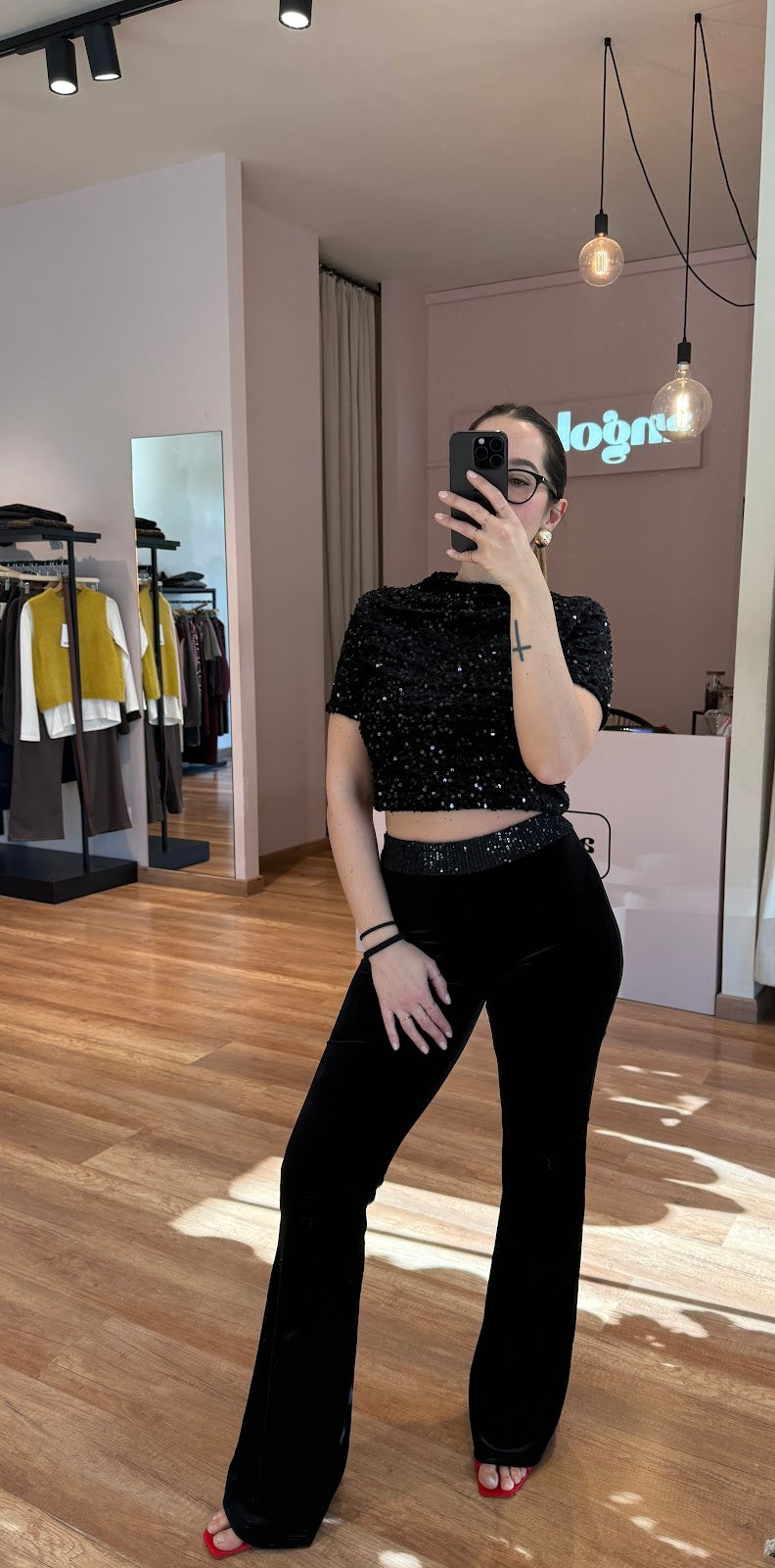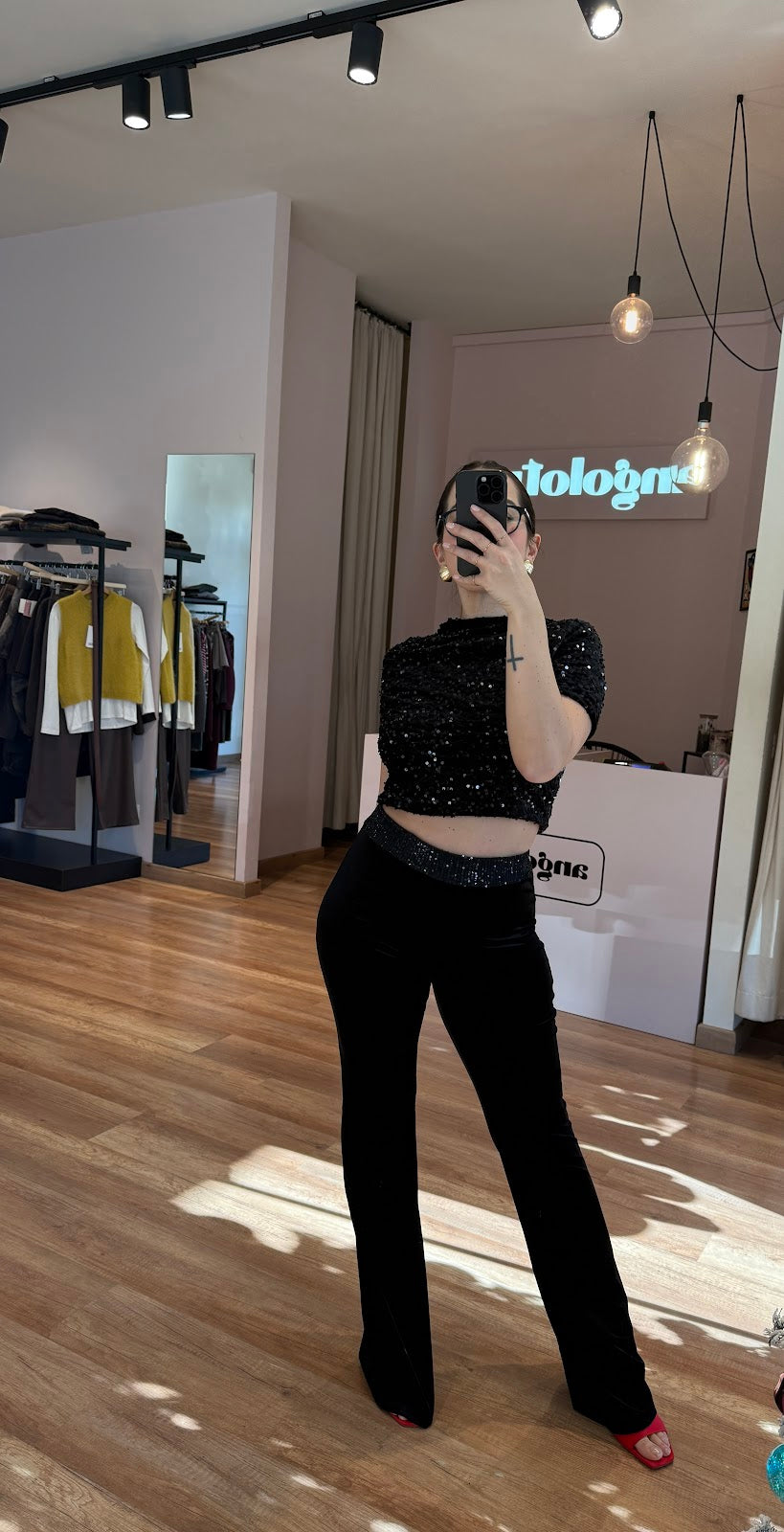 Pantalone a zampa in ciniglia, con fascia di paillettes in vita. Elastico in vita. Greta veste una taglia 40/42.