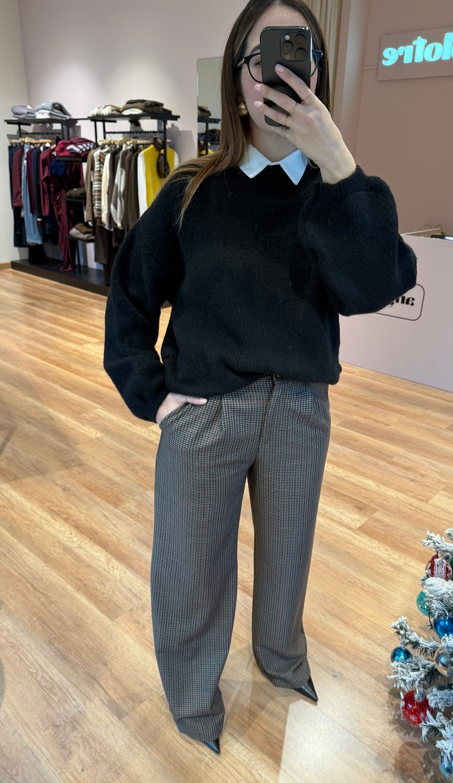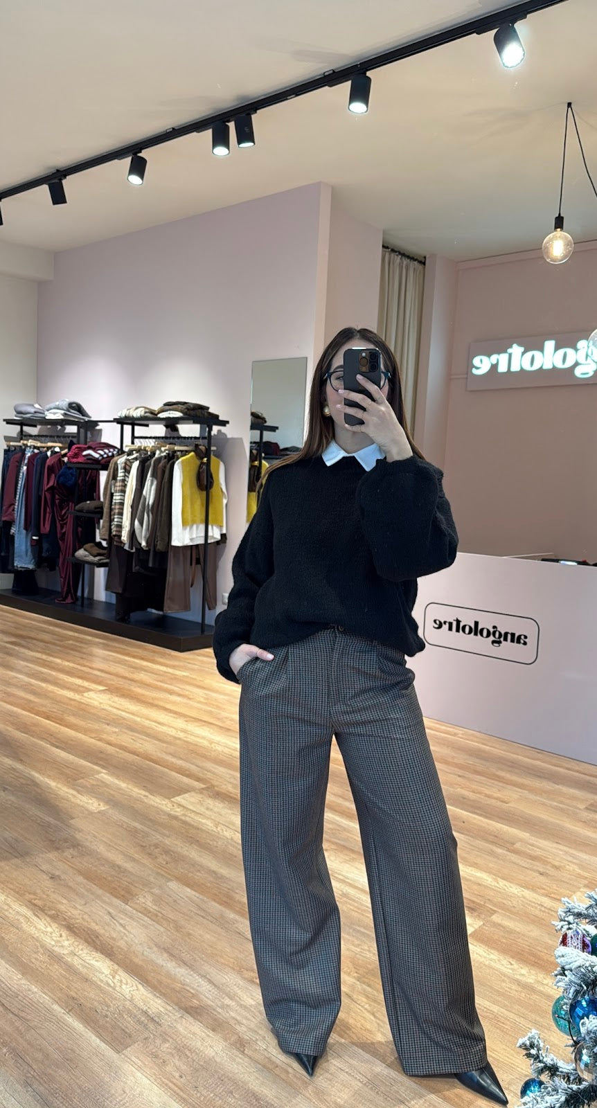 Pantalone palazzo, fantasia pied de poule, con tasche a filo laterali e posteriori, pinces sul davanti. Greta indossa la taglia M.