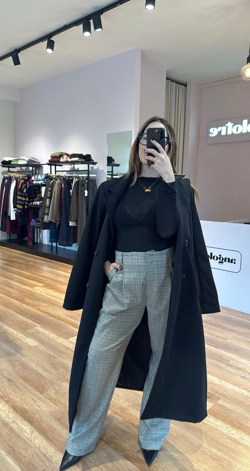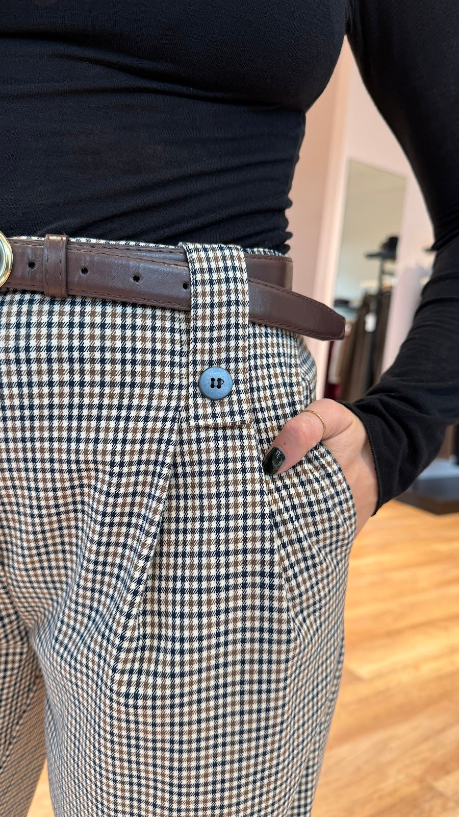 Pantalone dritto pied de poule, pinces sul davanti, chiusura con bottone nascosto e zip, dettaglio passanti. Greta indossa la taglia M.