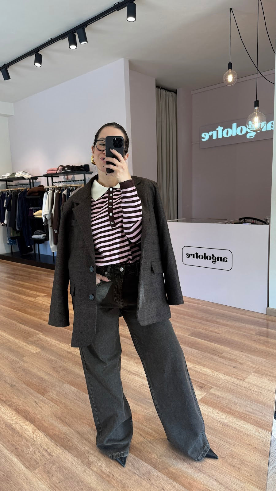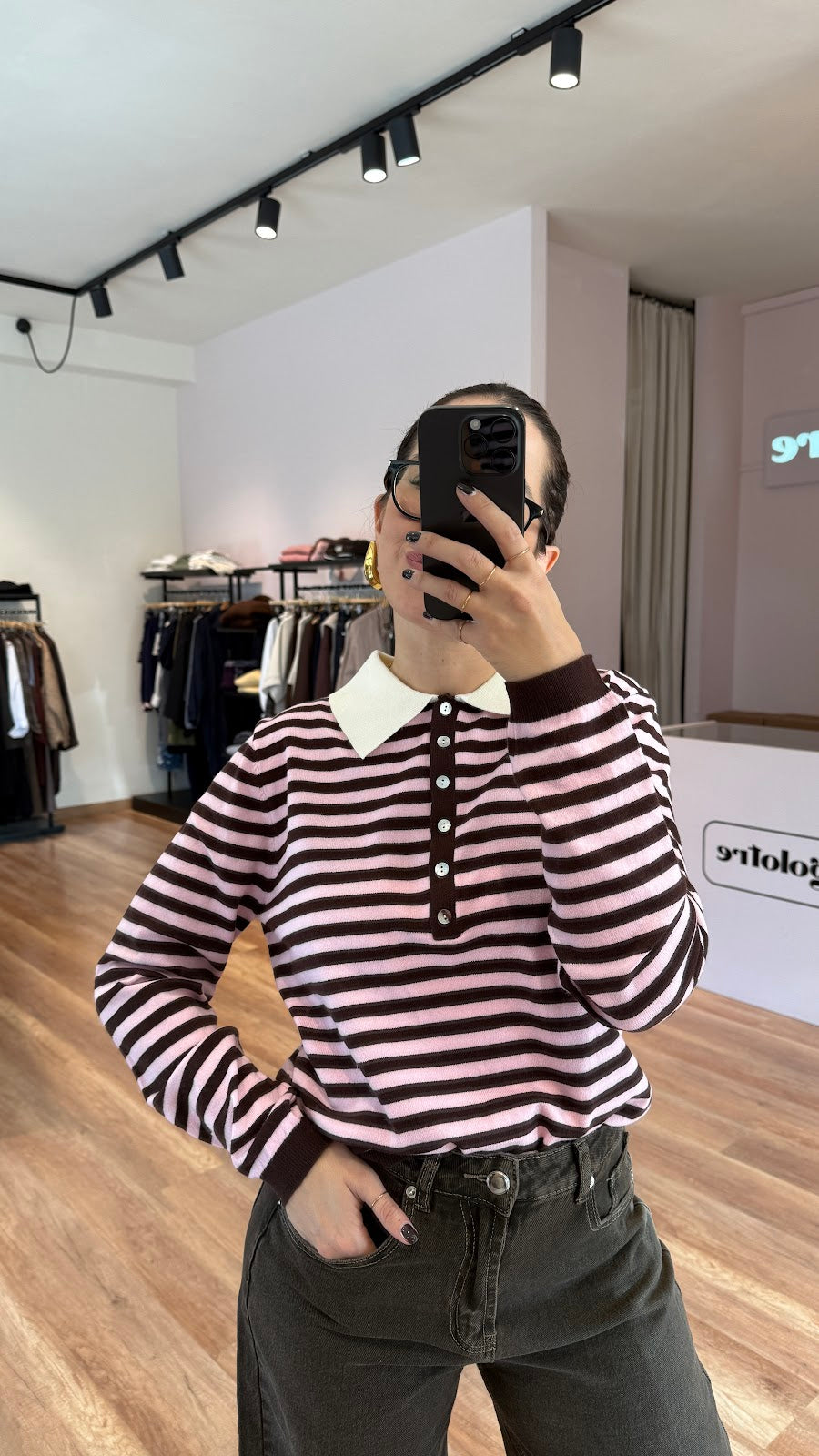 Polo misto viscosa, a righe. Vestibilità regolare. Greta veste una taglia 40/42.