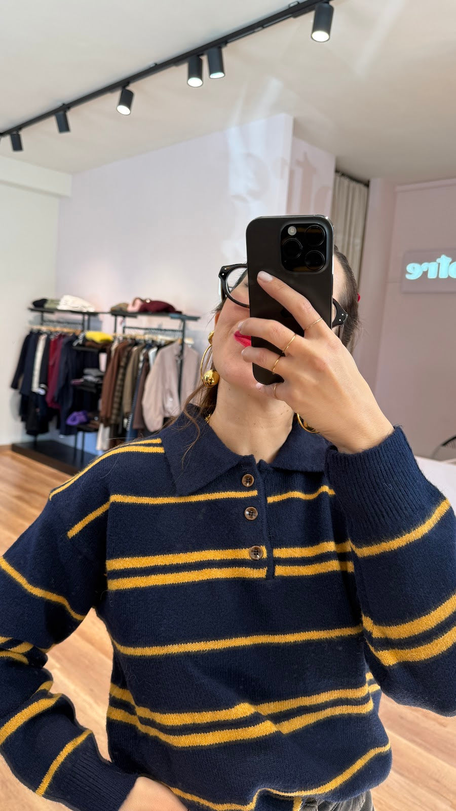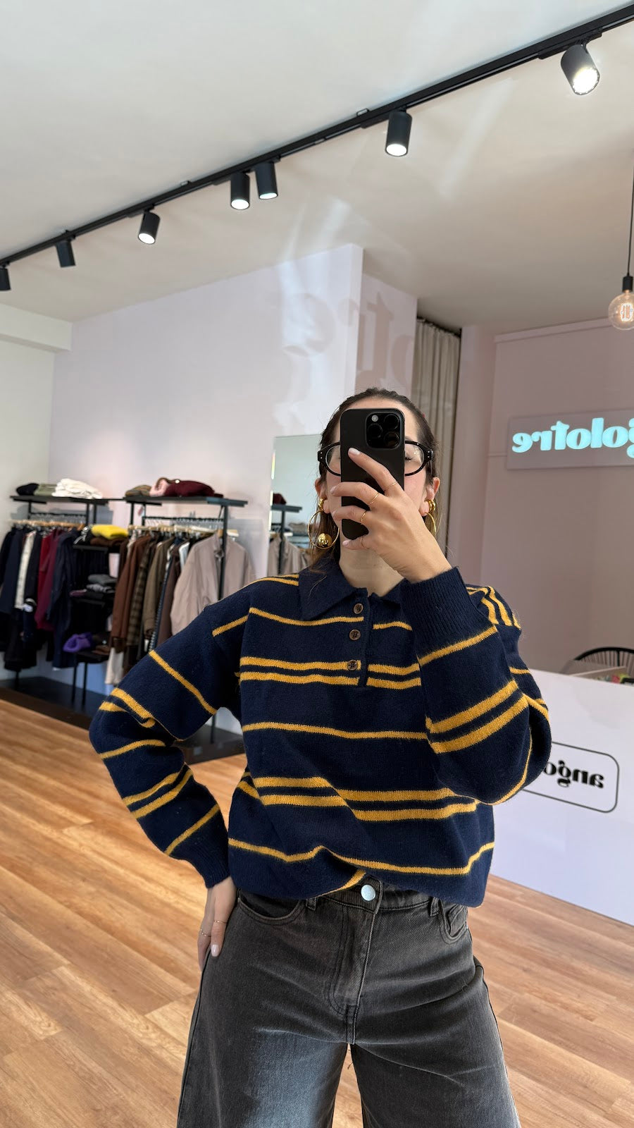 Polo in maglia a righe, spalla scesa, vestibilità regolare. Greta veste una taglia 40/42.