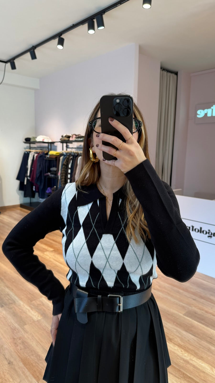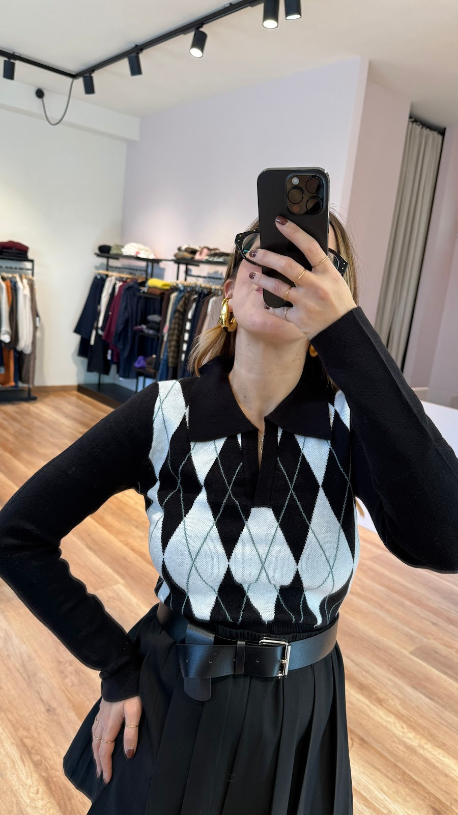 Polo crop, fantasia rombi in misto viscosa. Greta indossa la taglia S|M.