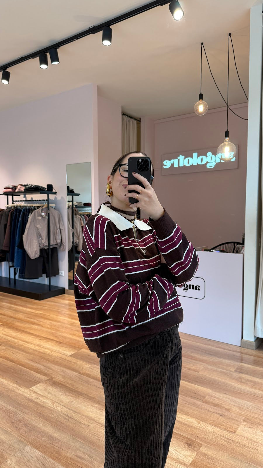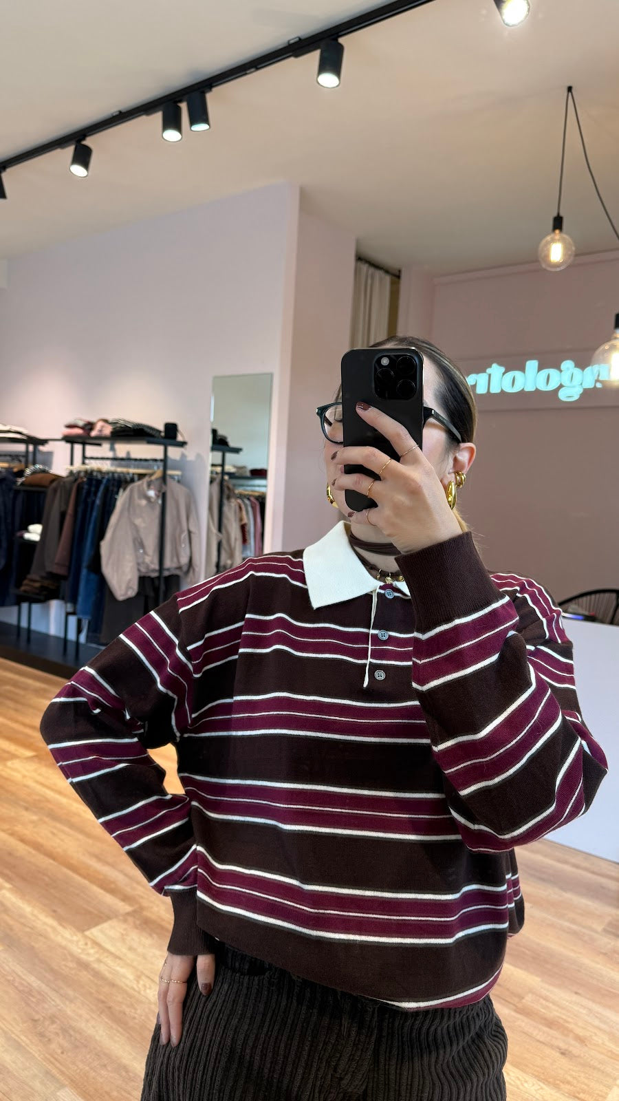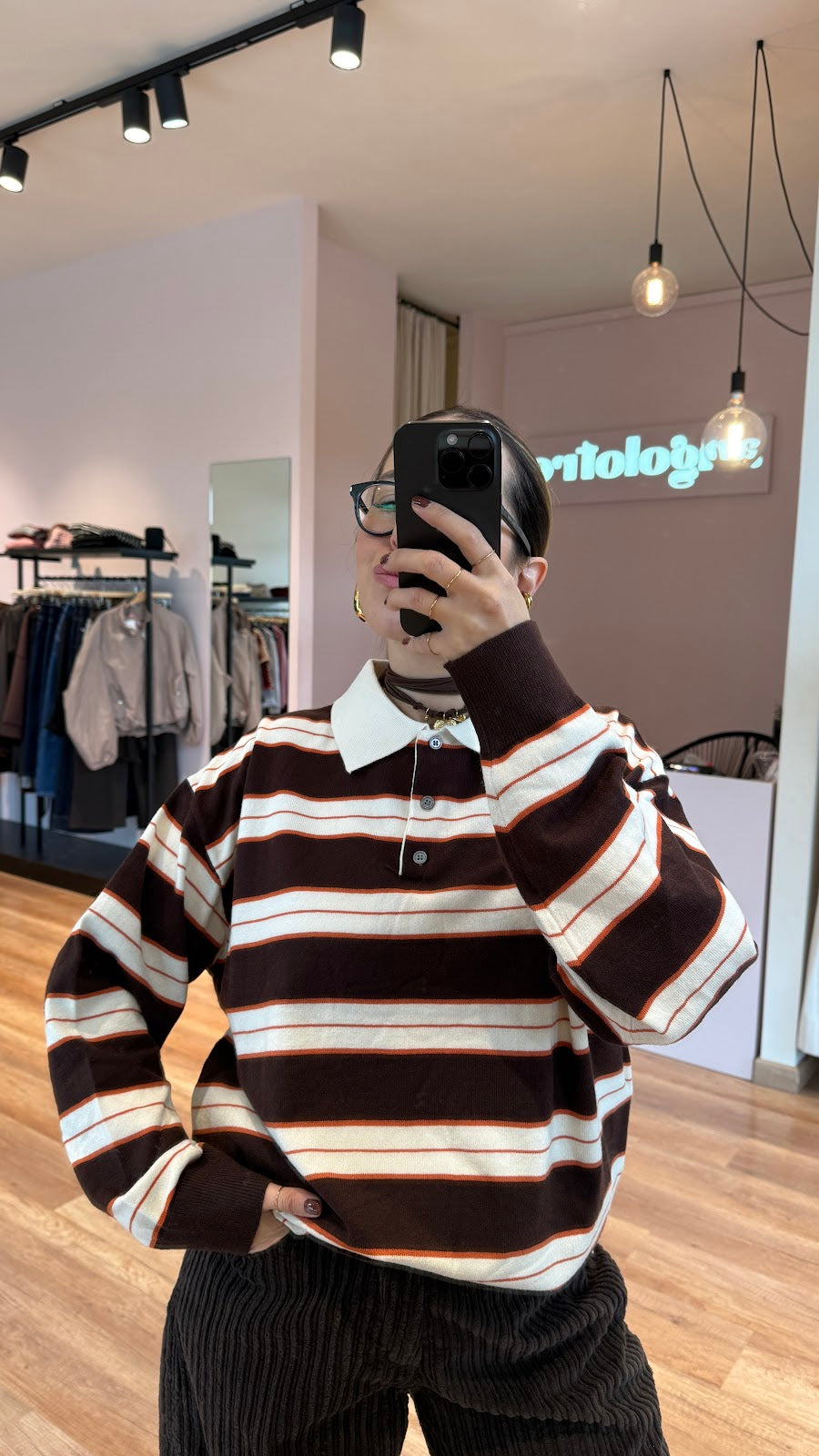 Polo in maglia, misto viscosa a righe, spalla scesa, vestibilità morbida. Greta veste una taglia 40/42.