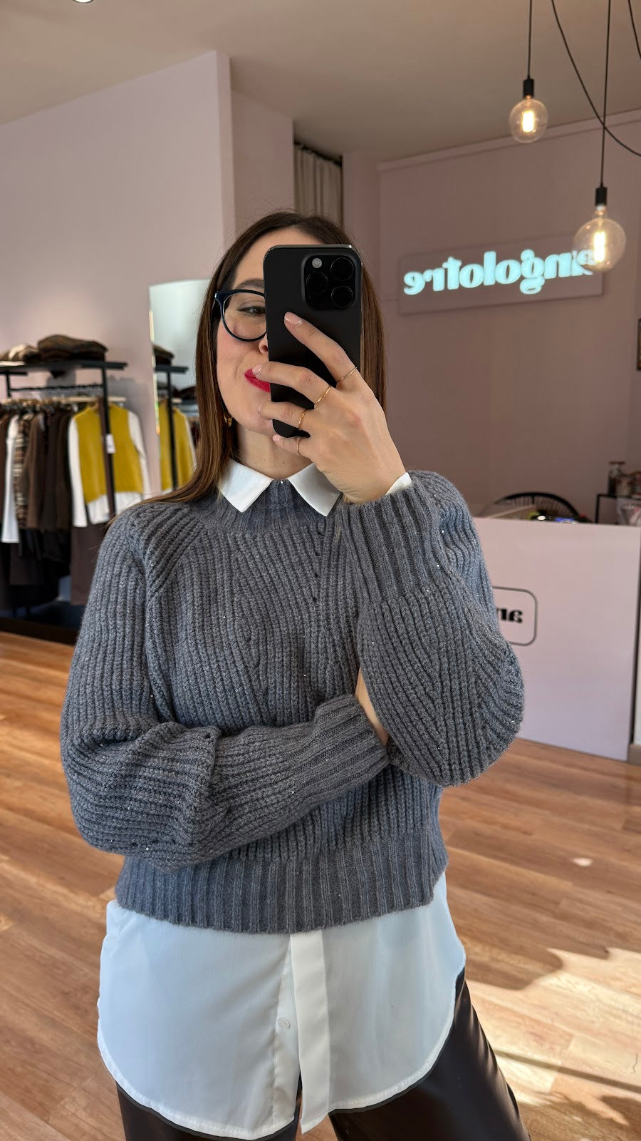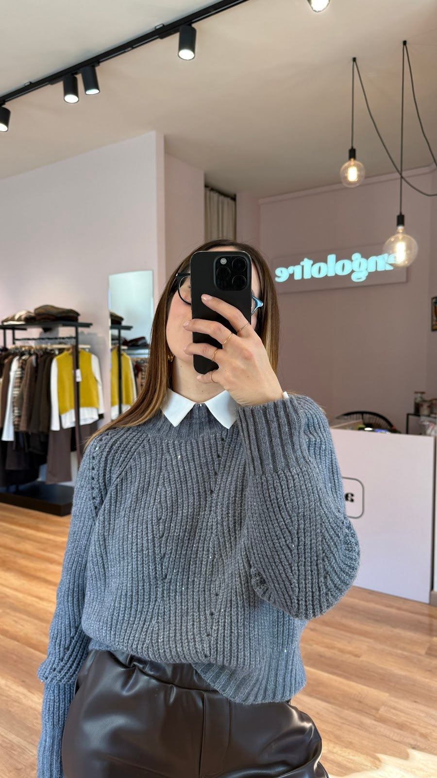 Pull girocollo in maglia a trecce con micro paillettes. Greta veste una taglia 40/42.