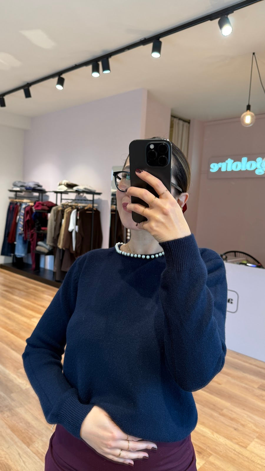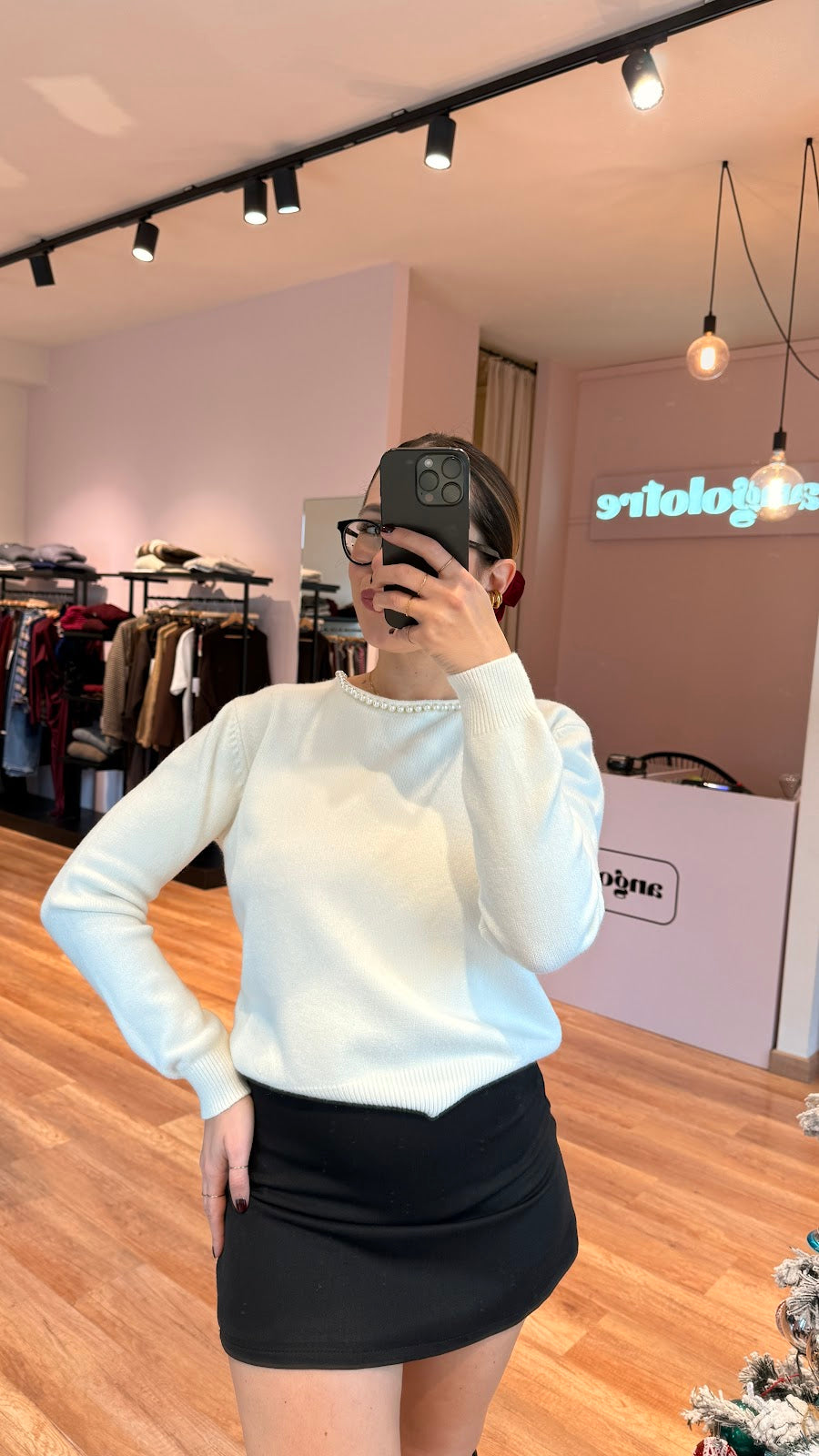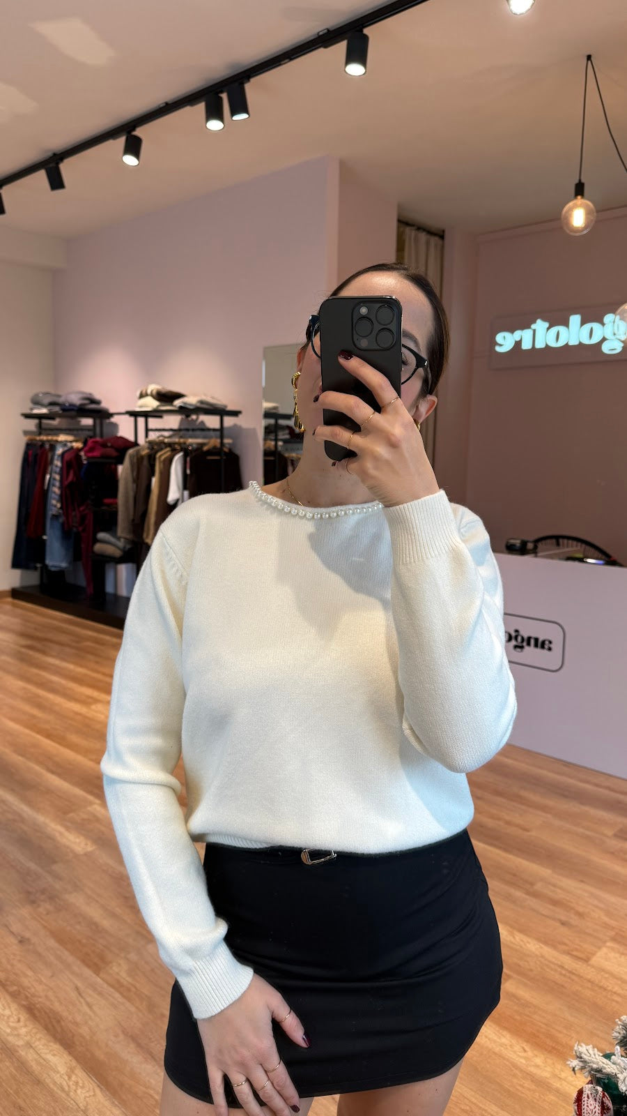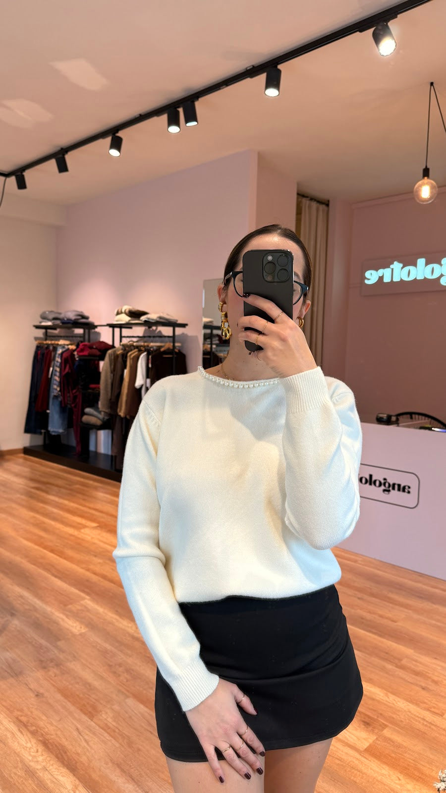 Pull girocollo con perline e scollo a goccia nella parte posteriore, rifinito da perline. Vestibilità regolare. Greta veste una taglia 40/42.