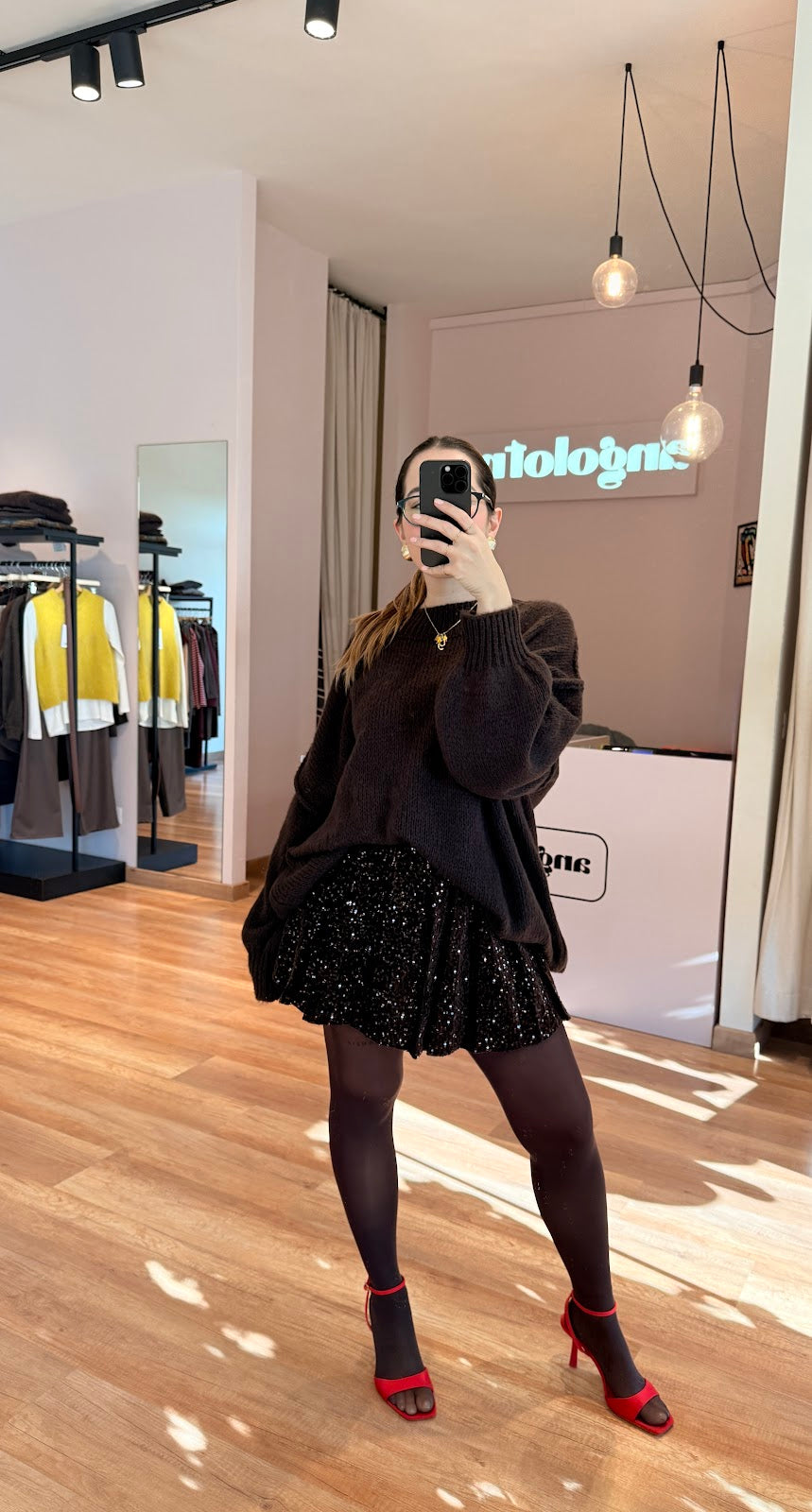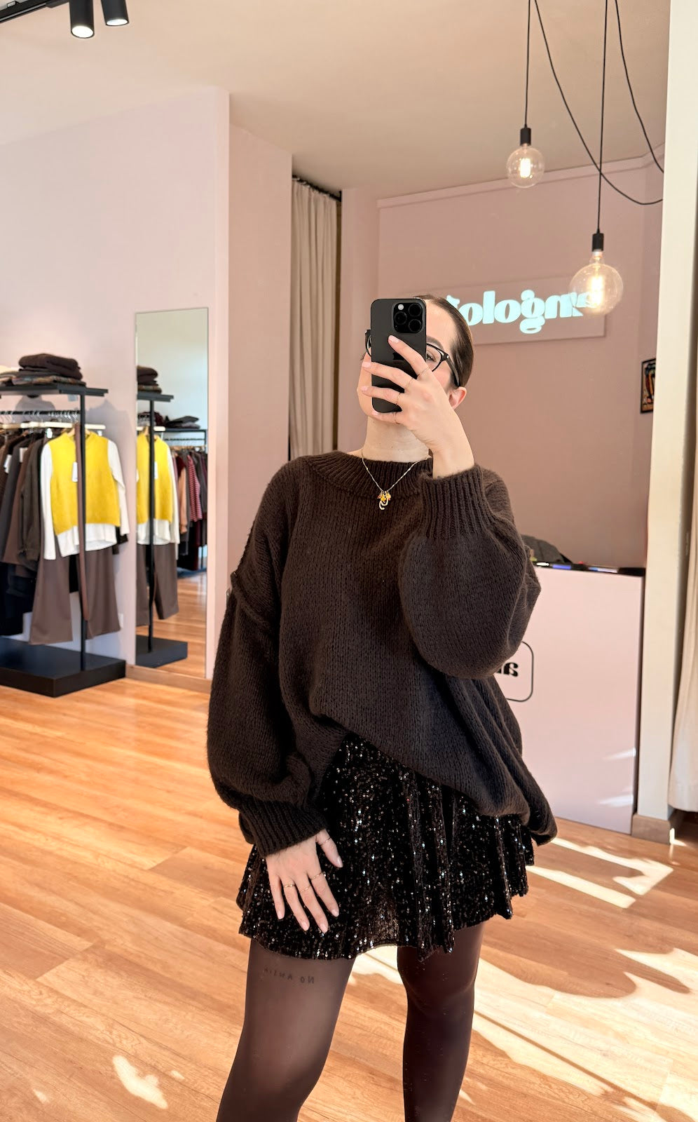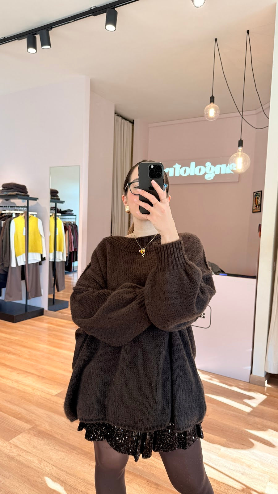 Pull over girocollo, spalla scesa, manica leggermente a palloncino, 10% lana. Taglia Unica, veste fino ad una 46. Greta veste una taglia 40/42.