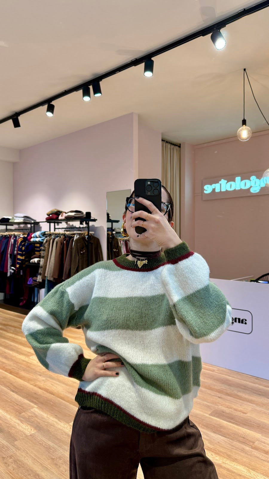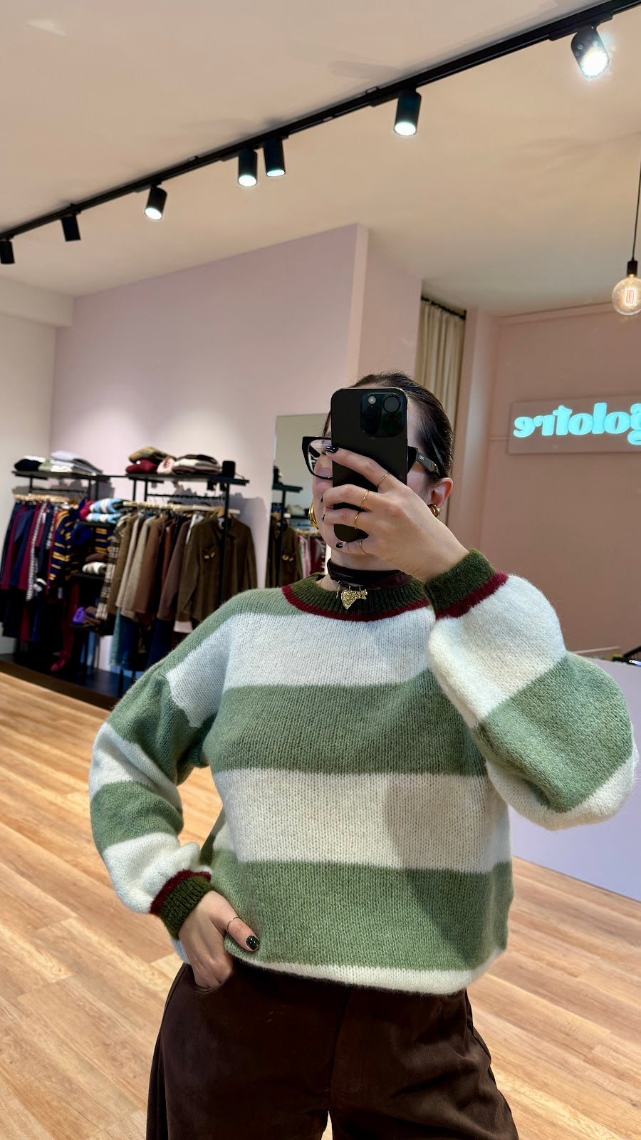 Pull gircollo a righe, spalla scesa, vestibilità morbida, manica a palloncino,10% lana. Greta veste una taglia 40/42.