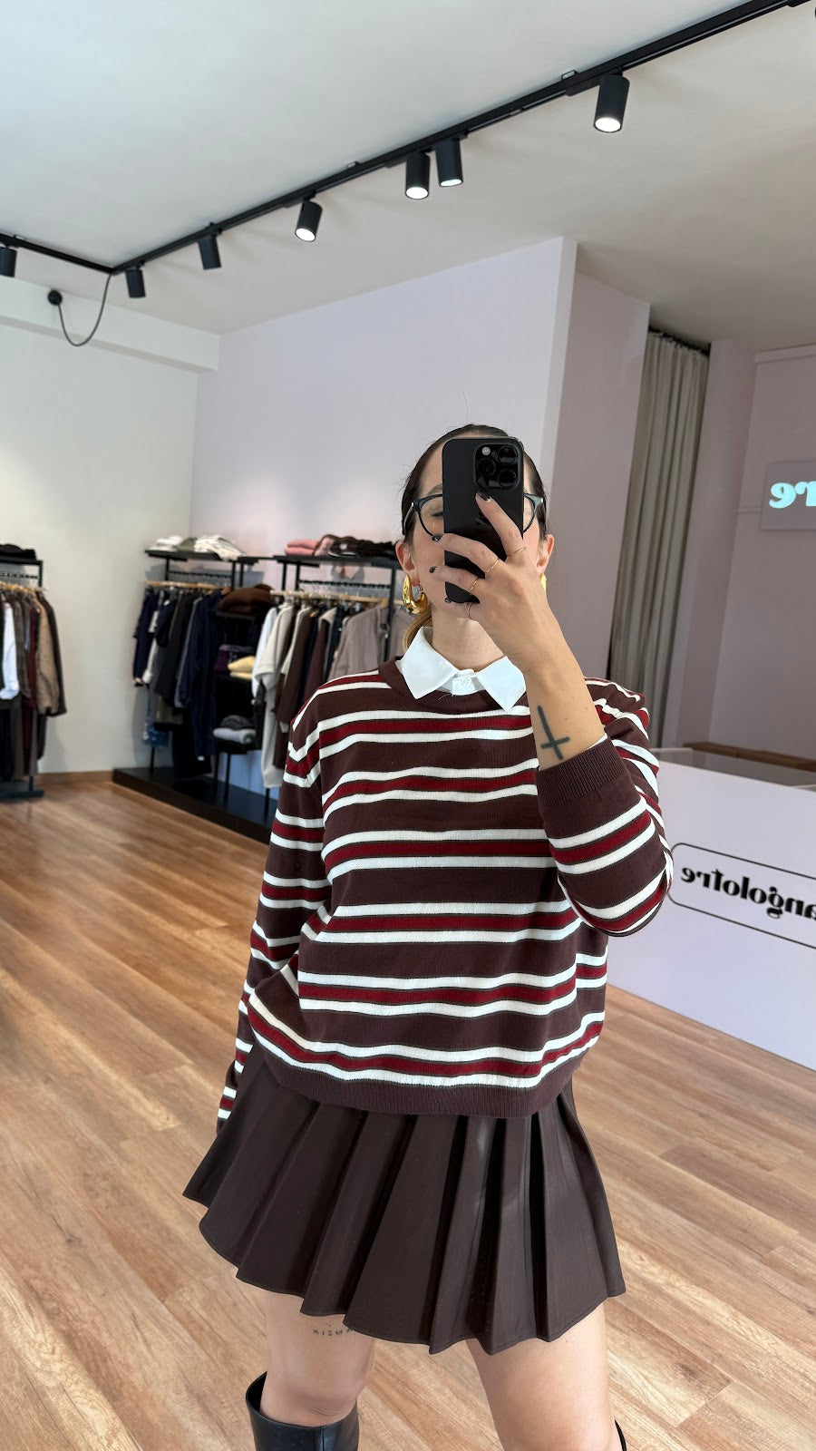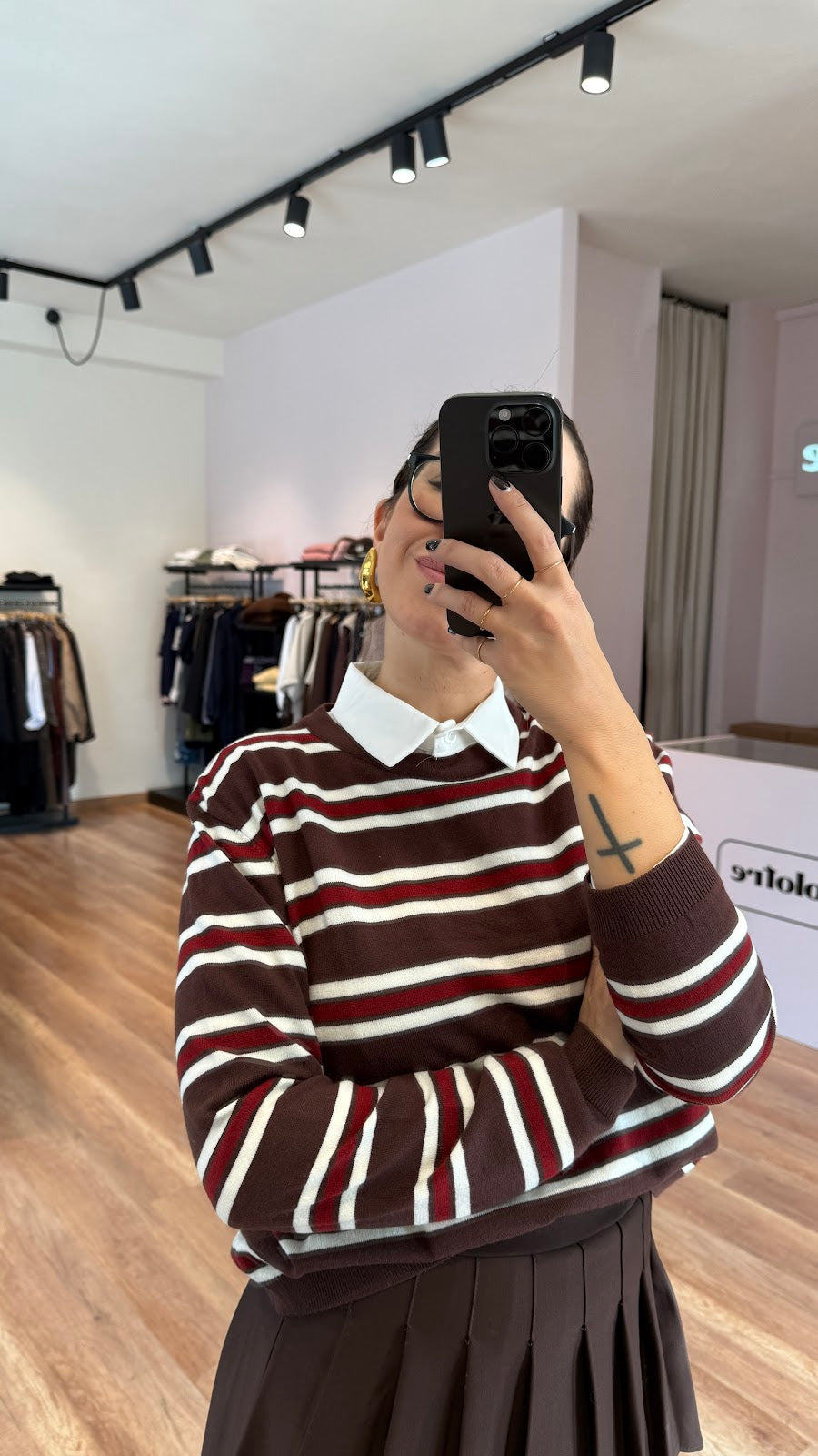 Pull misto viscosa girocollo, a righe. Vestibilità regolare. Camicia non inclusa. Greta veste una taglia 40/42.