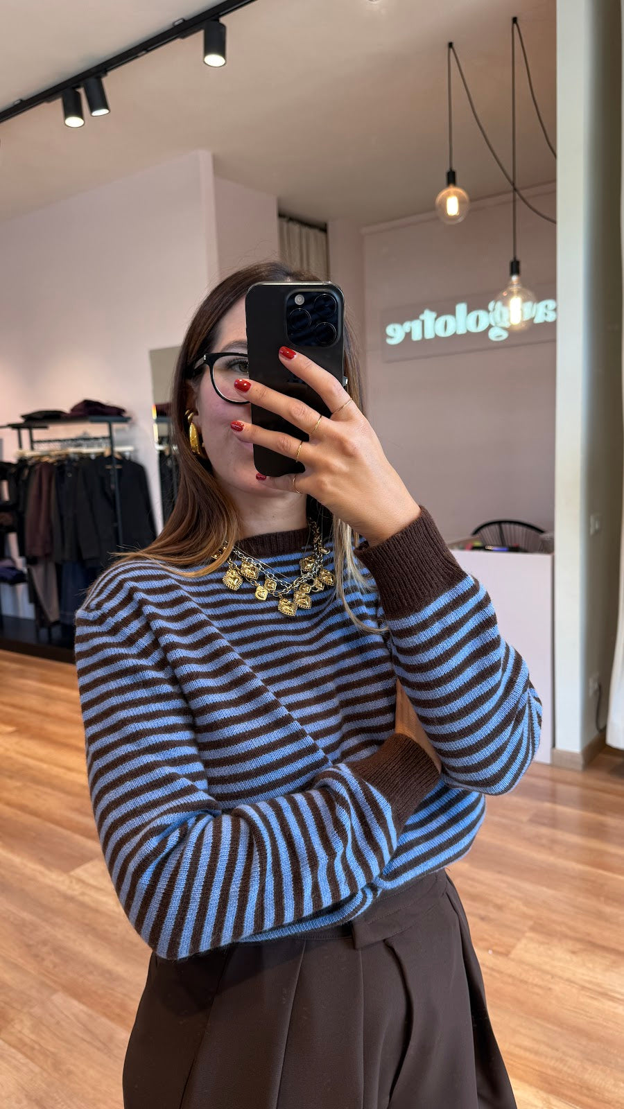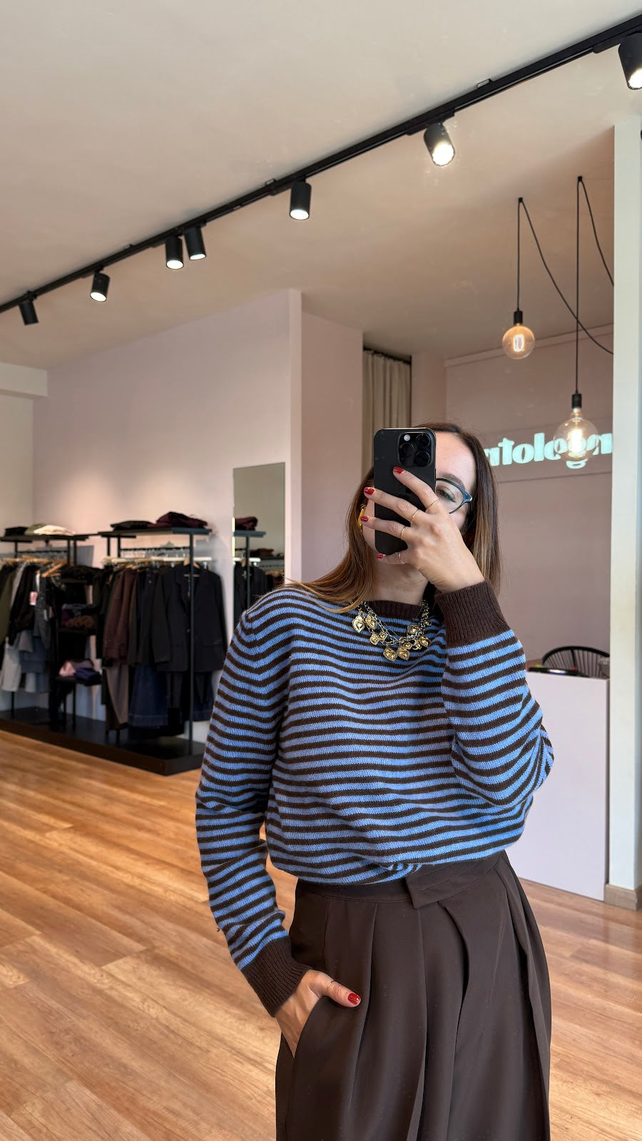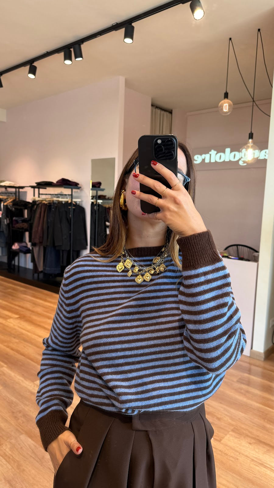 Pull a righe in misto cashmere con scollo a barchetta, vestibilità regolare. Greta veste una taglia 40/42.