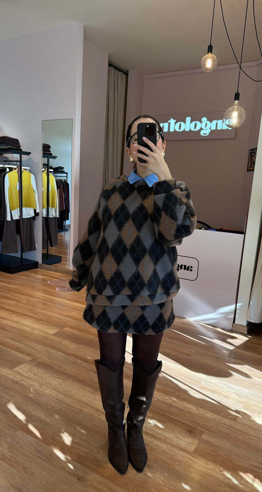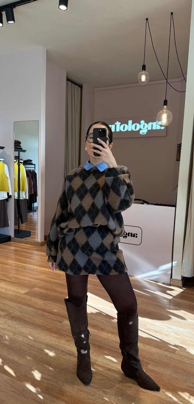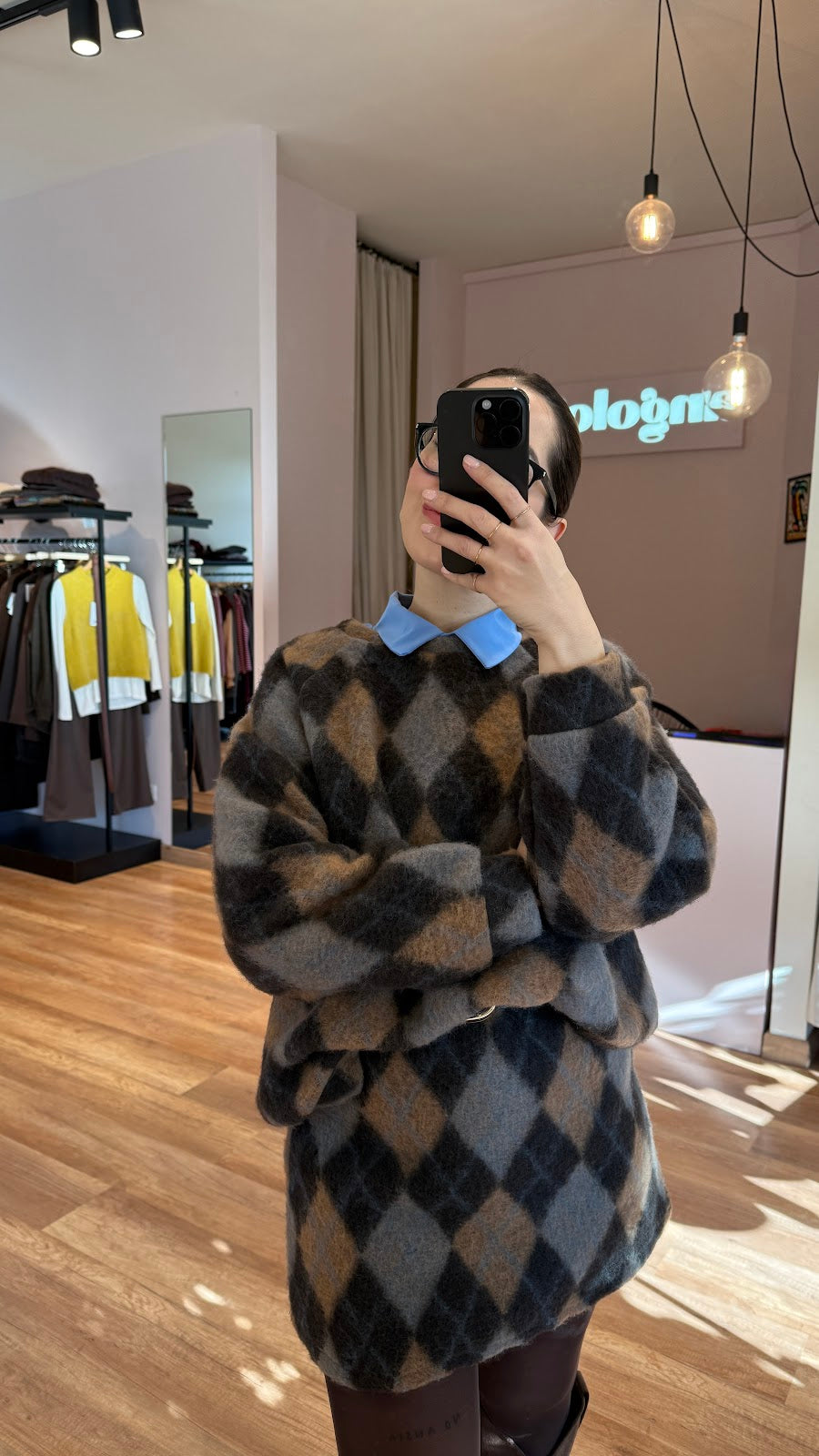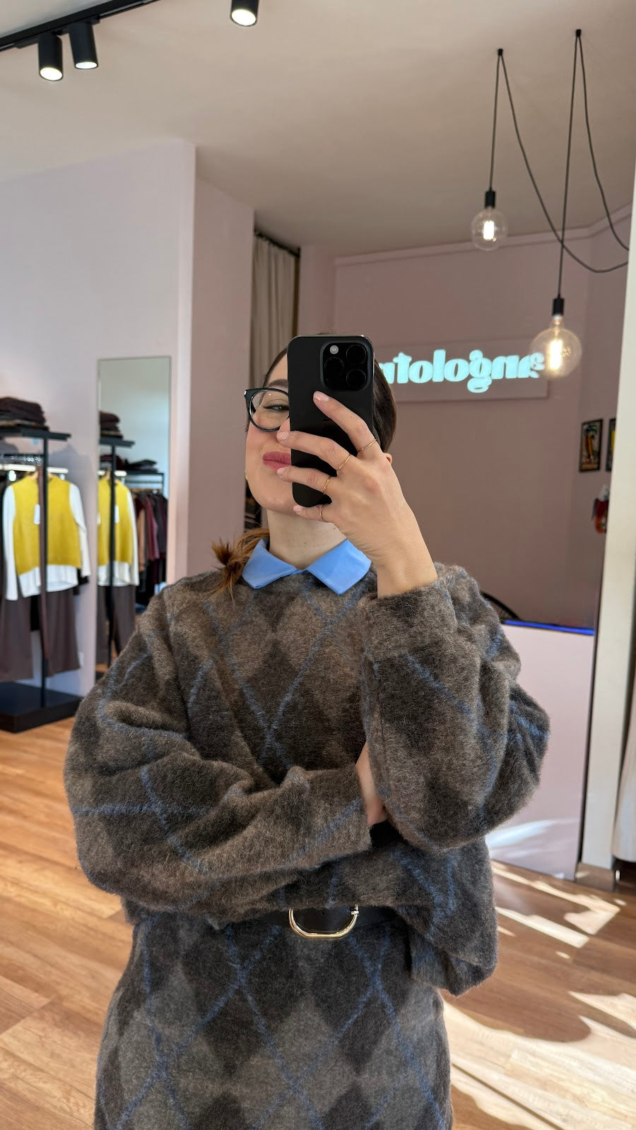 Pull girocollo in lana cotta fantasia rombi. Vestibilità over. Greta veste una taglia 40/42.