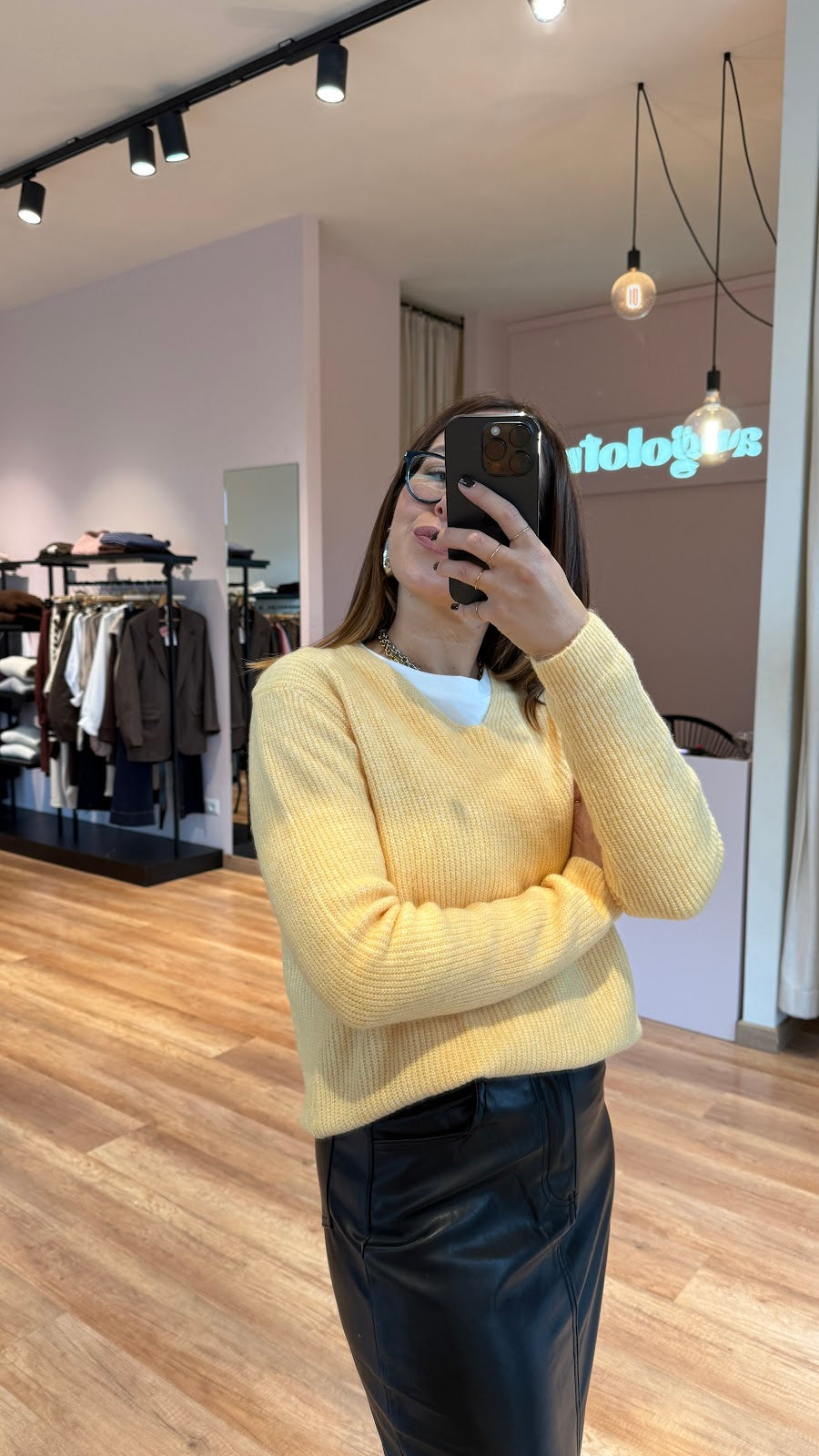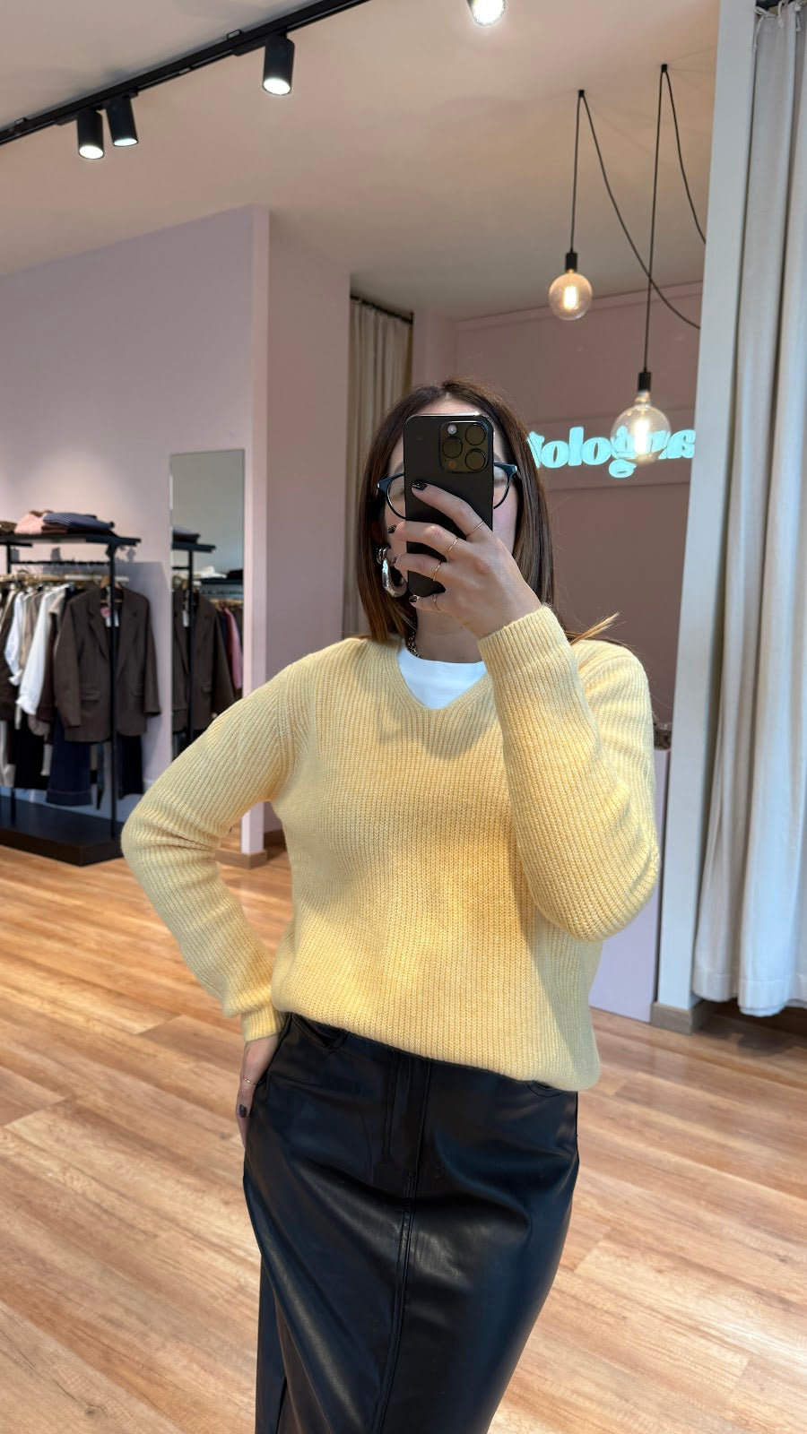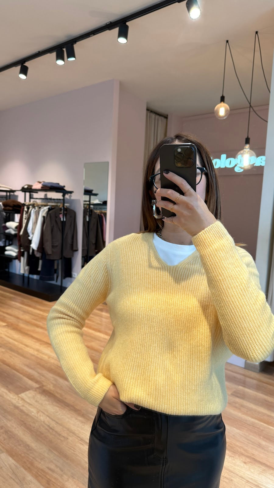 Pull con scollo a V, vestibilità regolare. 15% lana. Greta veste una taglia 40/42.