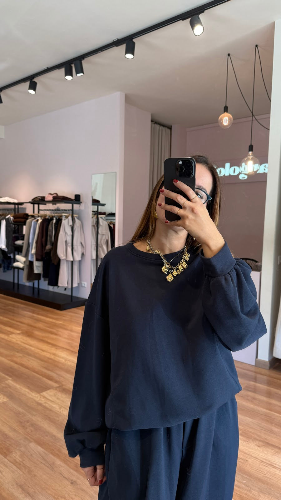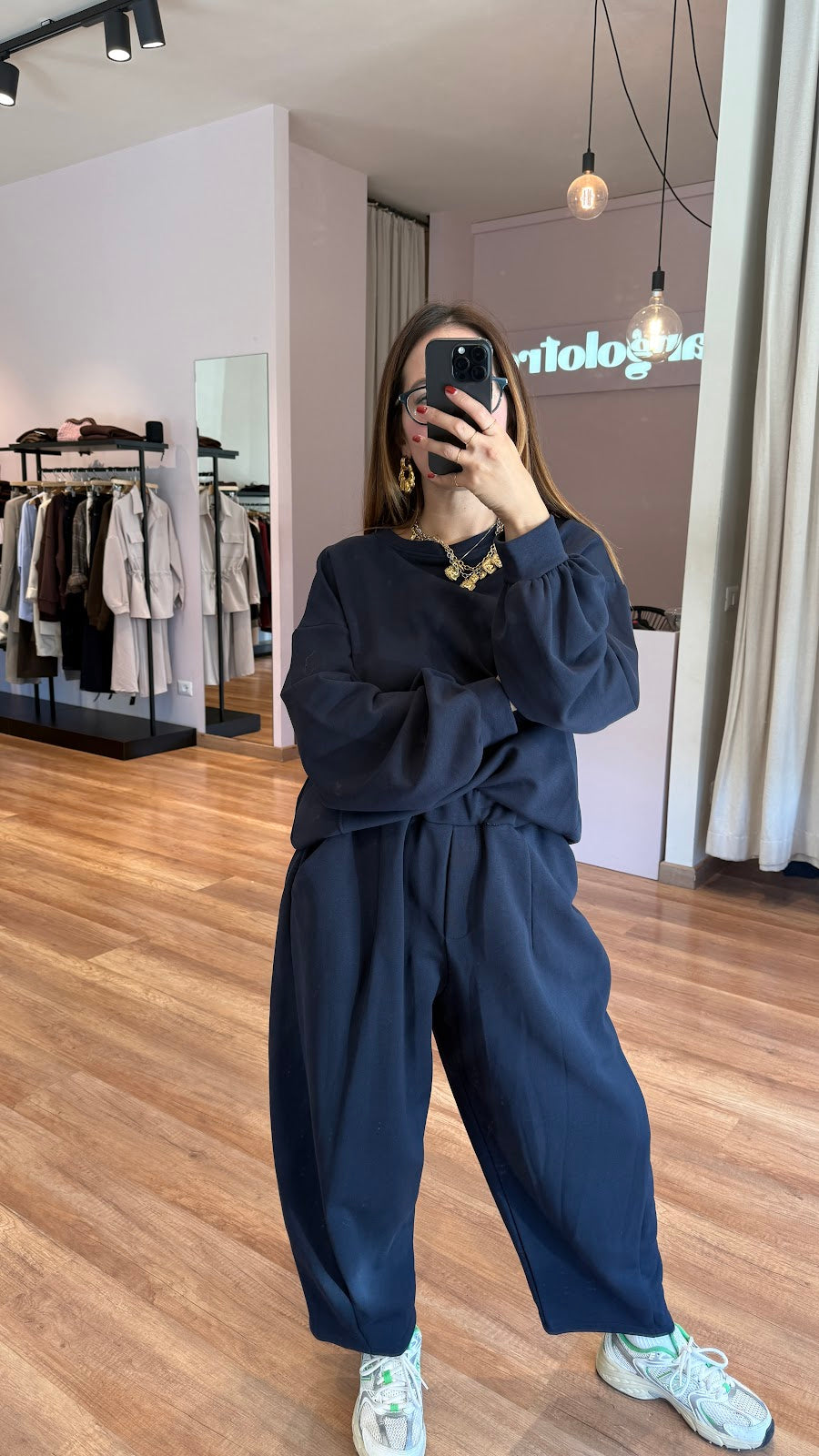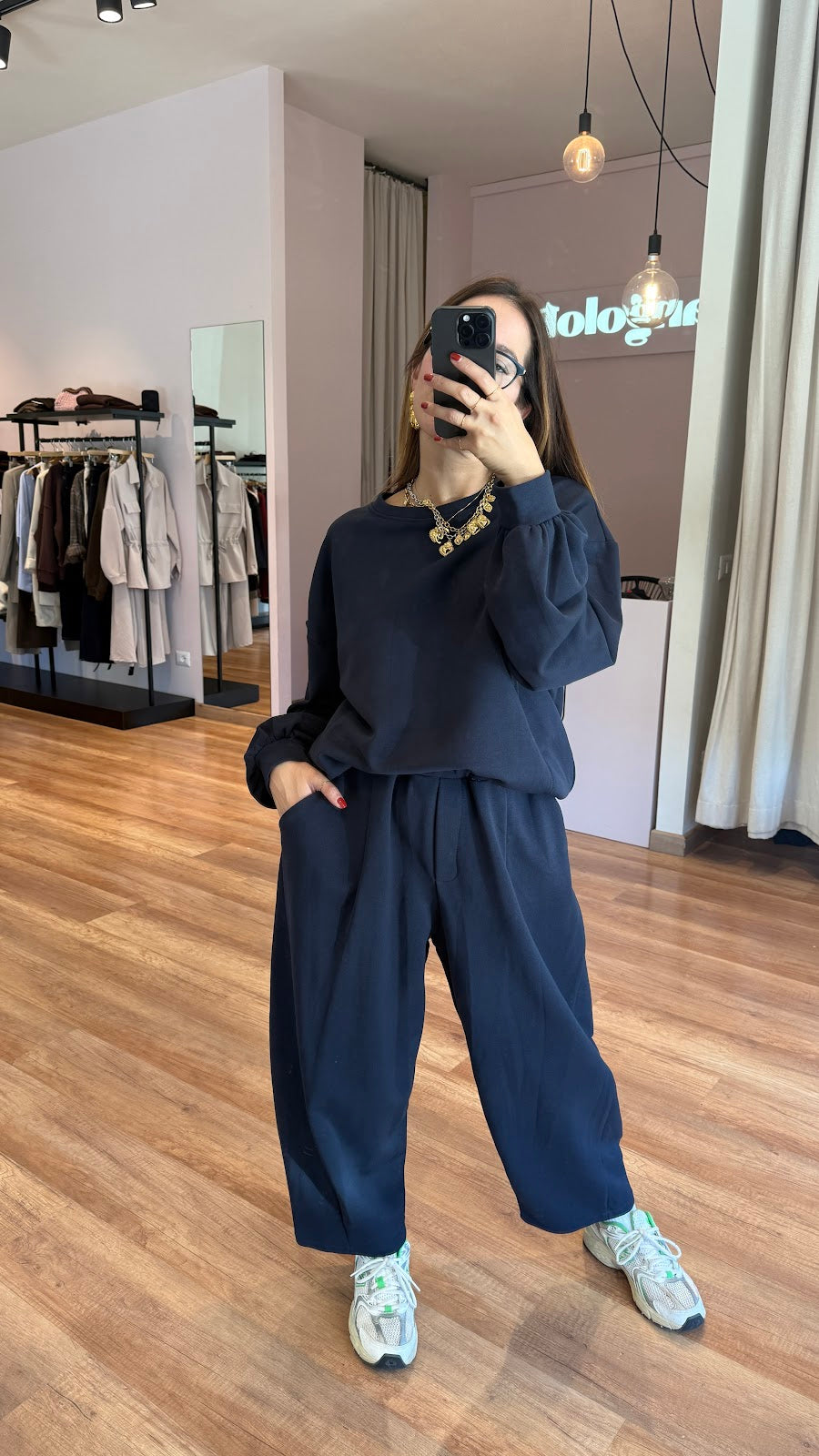 Coordinato in cotone garzato con pantalone modello carrot , con elastico in vita e tasche frontali più felpa girocollo, spalla scesa. Fit morbido. Greta veste una taglia 40/42.