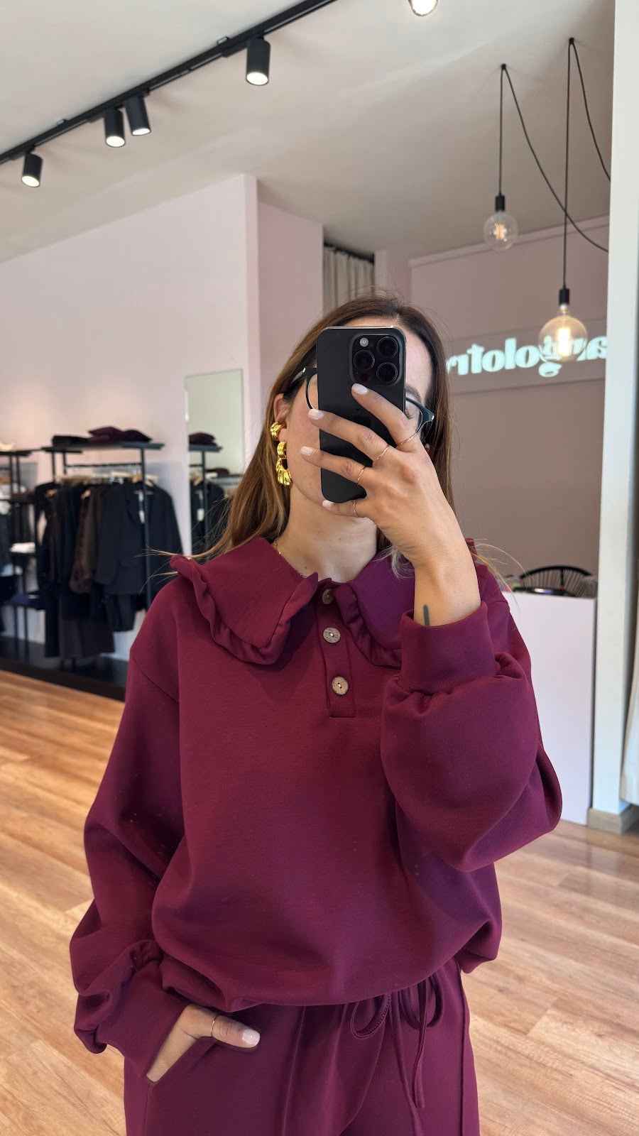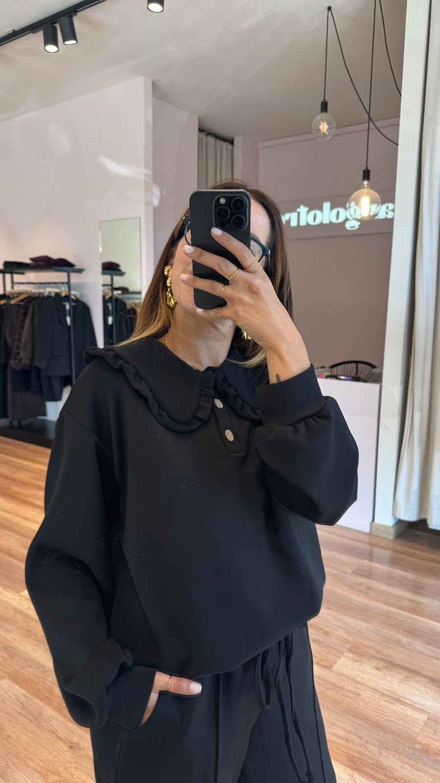 Set in tessuto scuba composto da pantalone morbido con coulisse in vita e felpa a polo, con colletto bon ton. Greta veste una taglia 40/42.