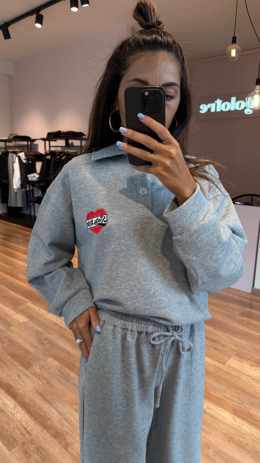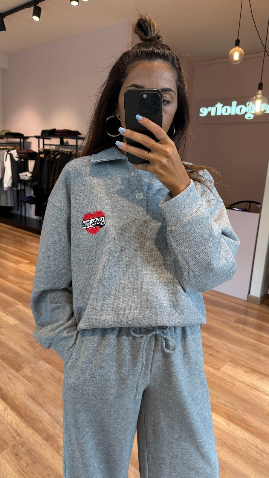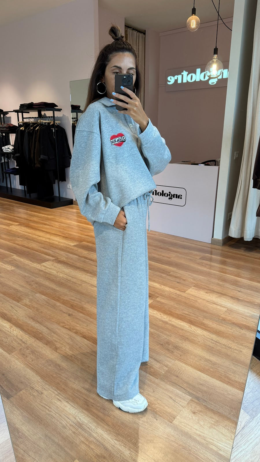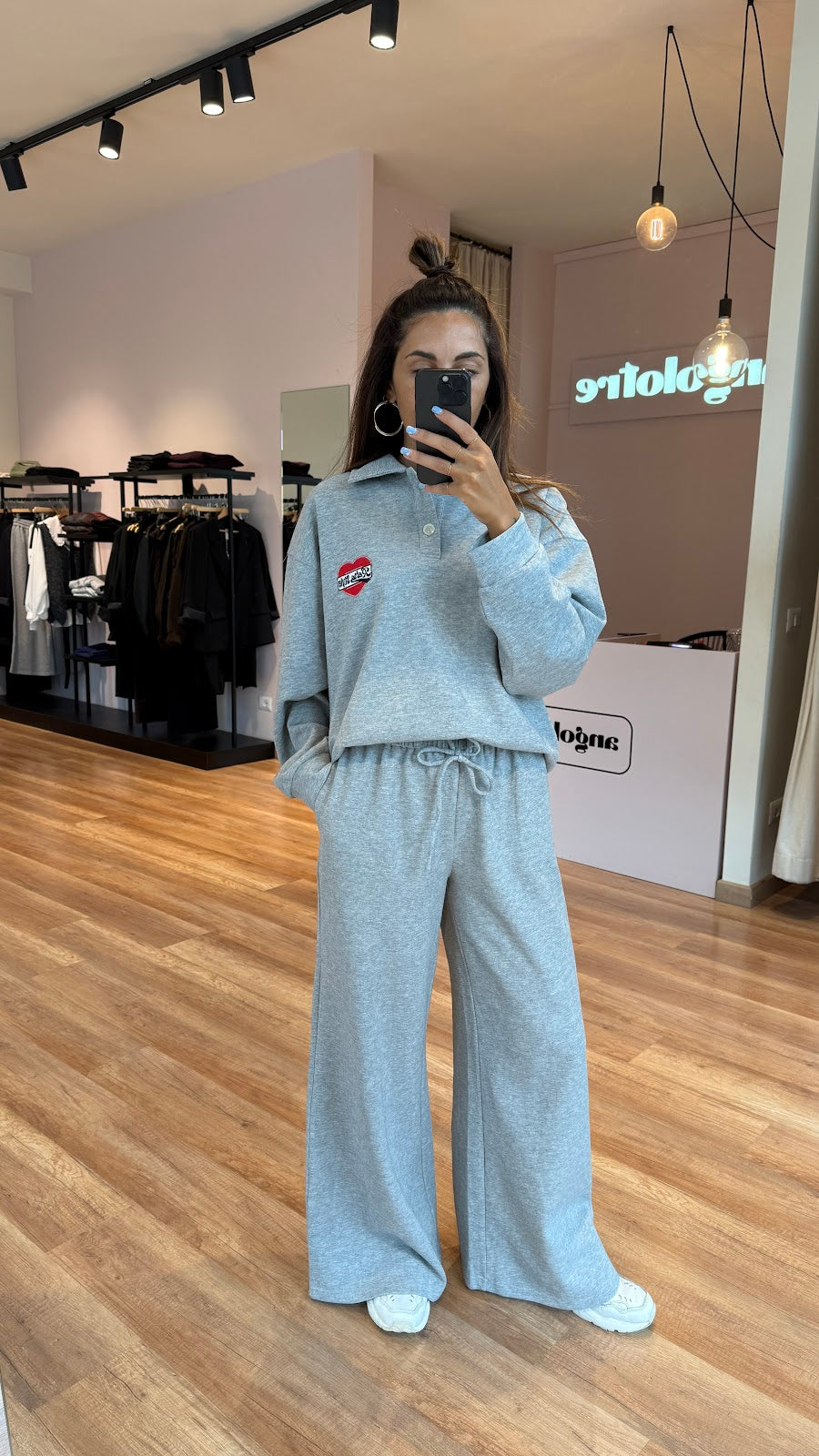 Set in tessuto garzato composto da felpa con colletto a polo con ricamo e pantalone palazzo con coulisse in vita. Jessica veste una taglia 40
