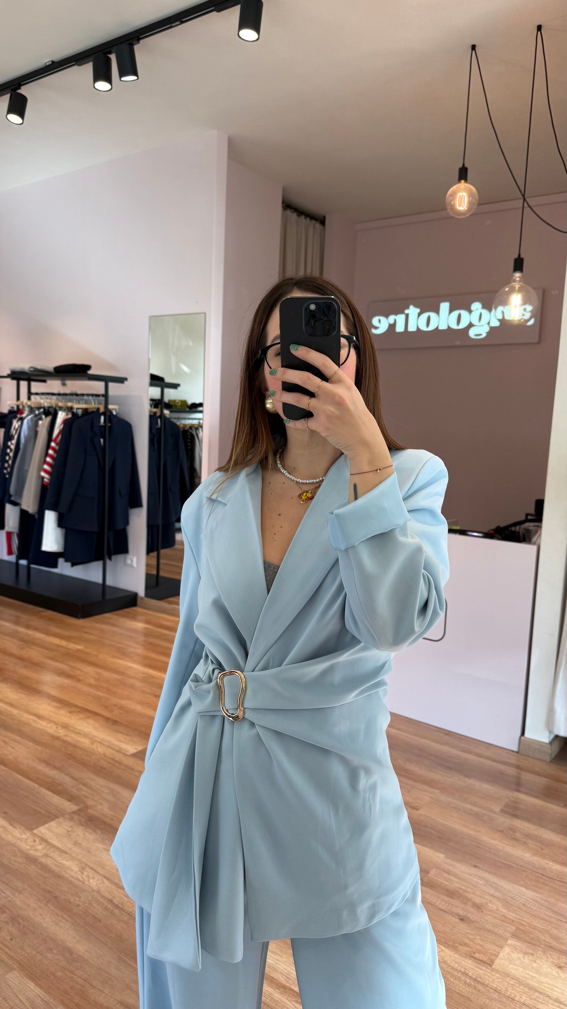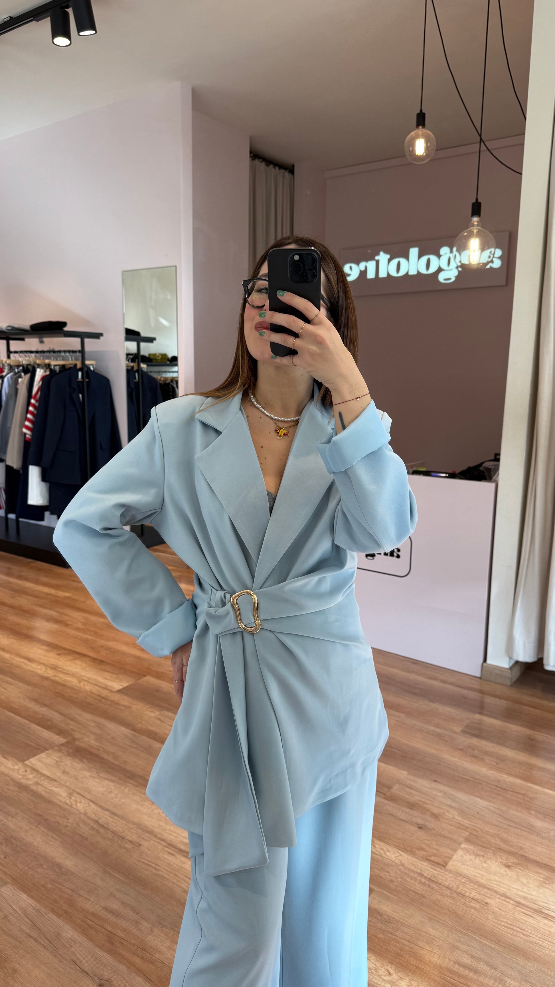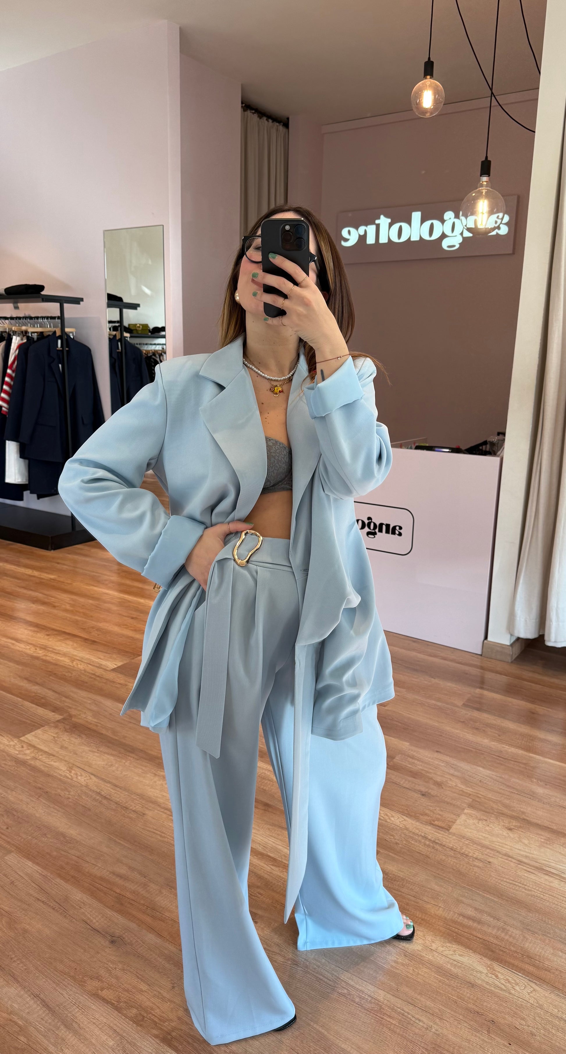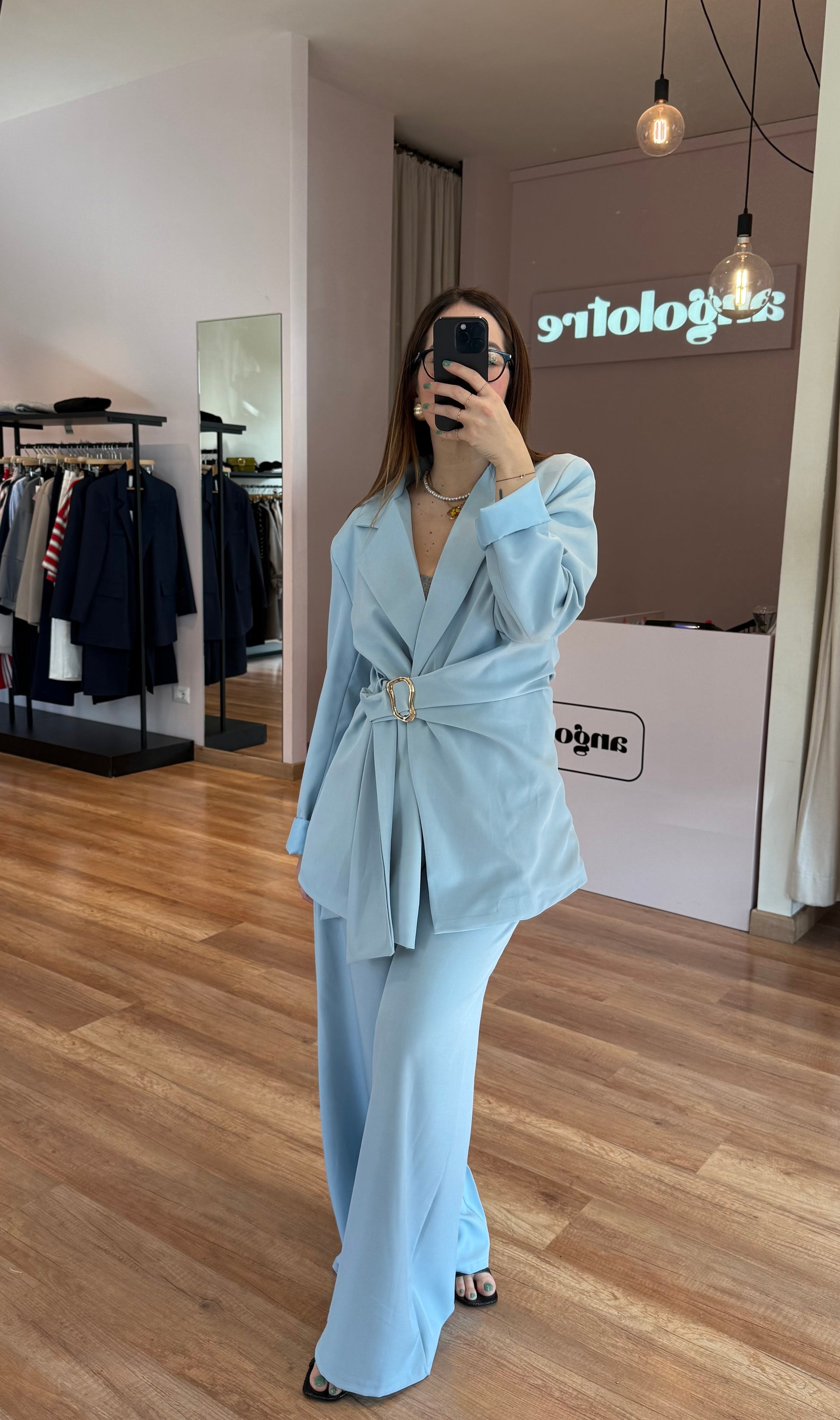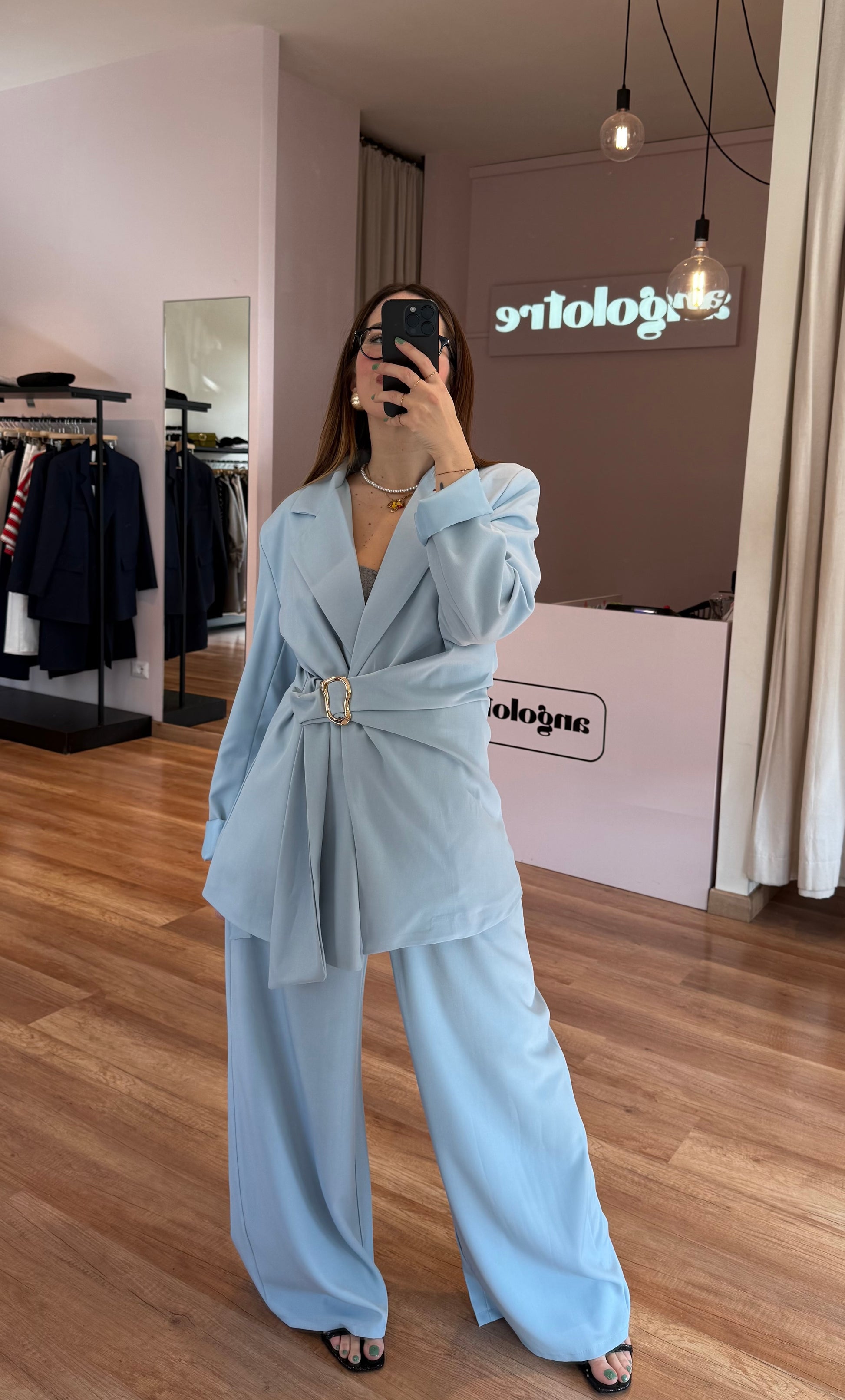 Set composto da Blazer oversize, chiusura laterale con dettaglio oro e pantalone palazzo, con elastico dietro, pinces e dettaglio stile cintina laterale.