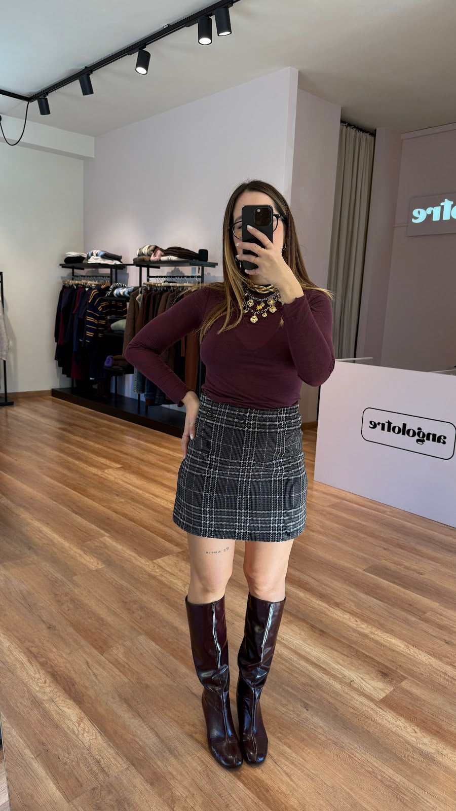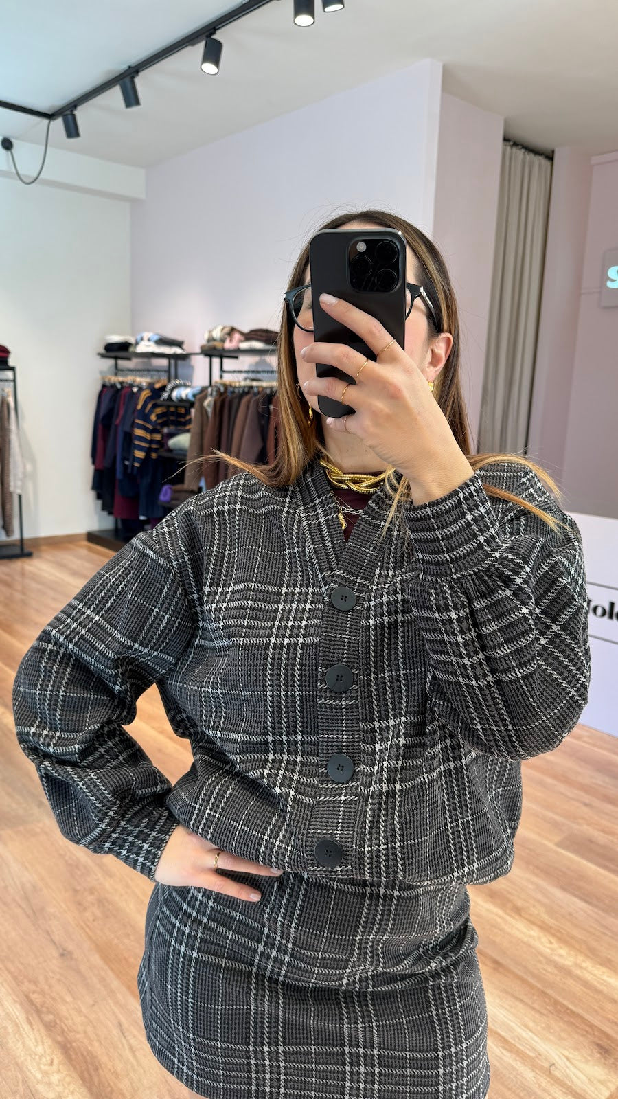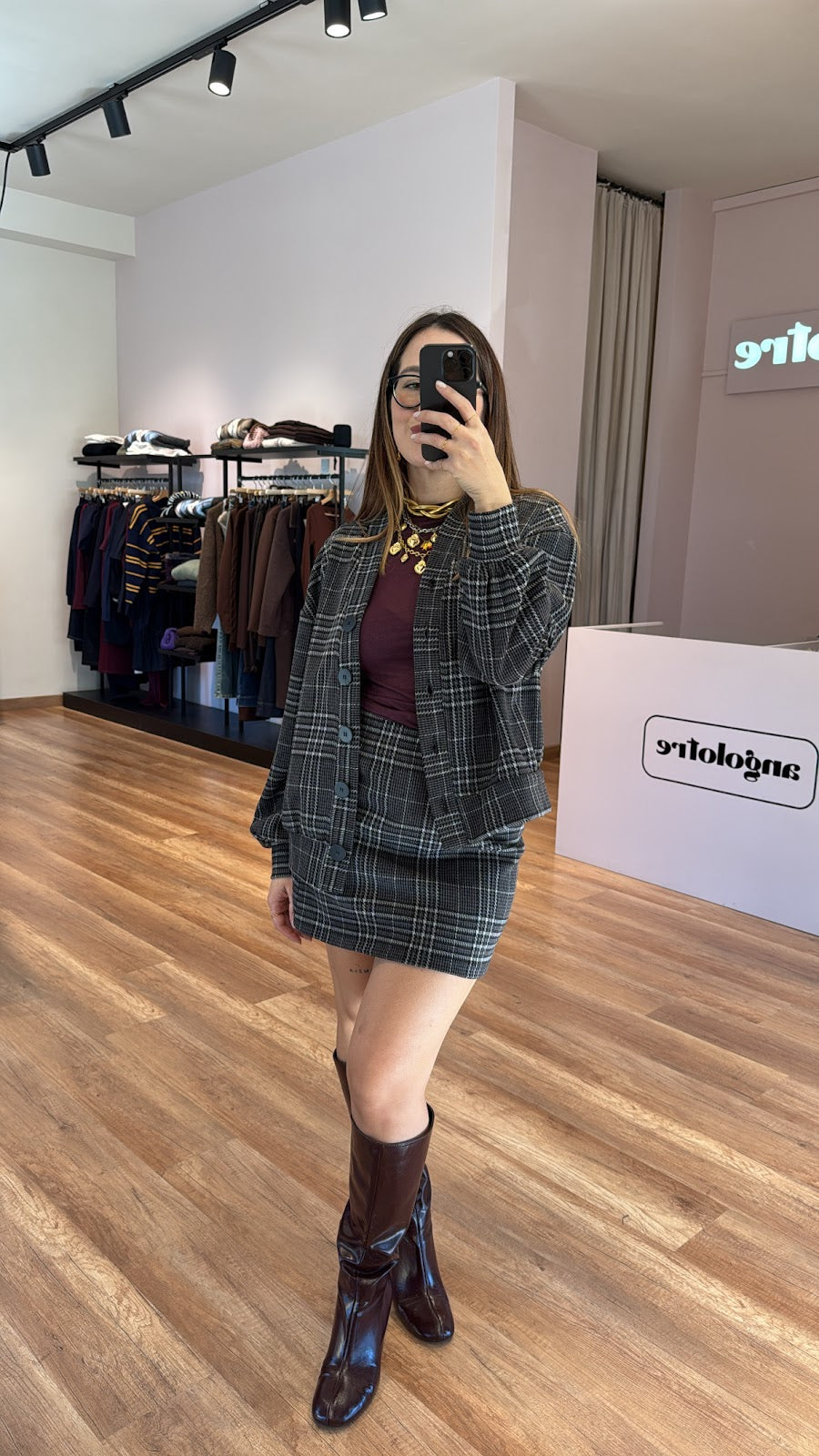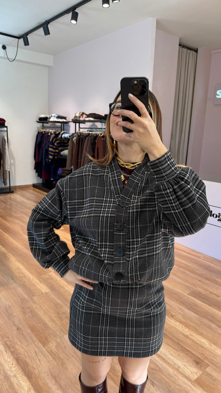 Set KikiSix a quadri composto da bomber con chiusura frontale con bottoni e mini gonna dritta, tessuto elasticizzato. Greta indossa la taglia S/M.