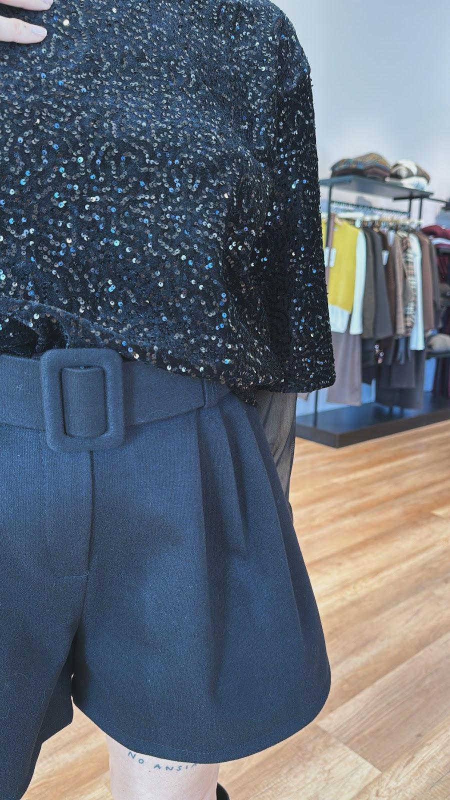 Shorts in panno, con pinces sul davanti, cintina compresa. Gamba morbida, elastico dietro. Taglia unica, veste fino ad una 46. Greta veste una taglia 40/42.