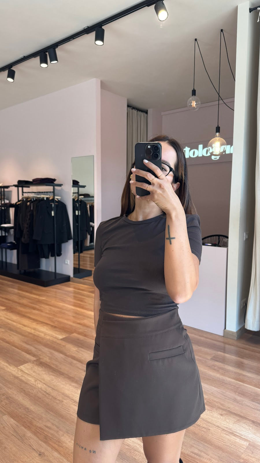 Gonna pantalone incrociata, con tasche a filo. Greta indossa una S.