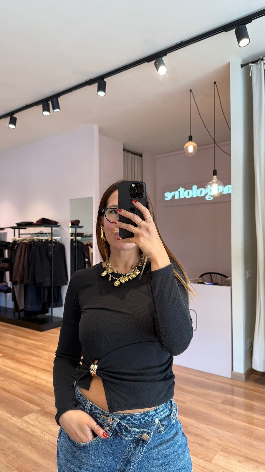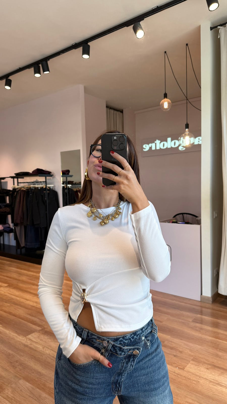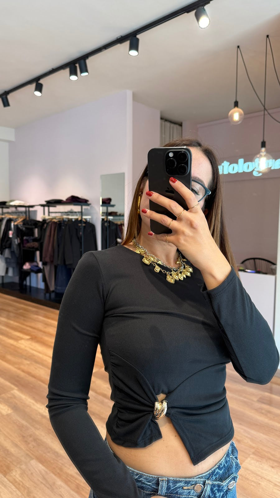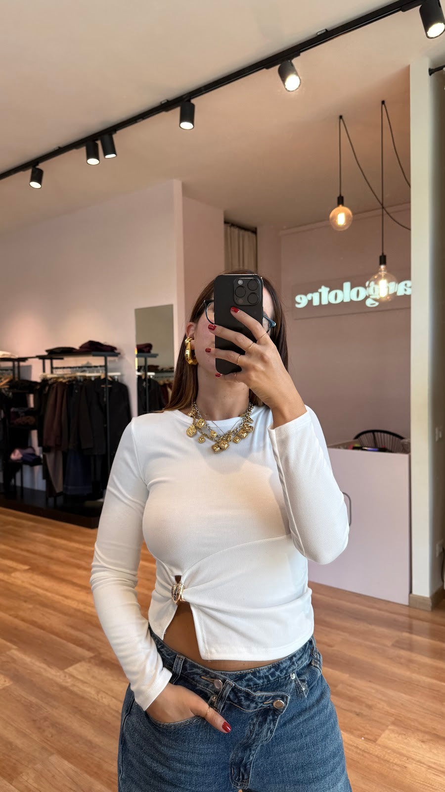 T-shirt manica lunga a costine, con dettaglio gioiello laterale. Greta veste una taglia 40/42.