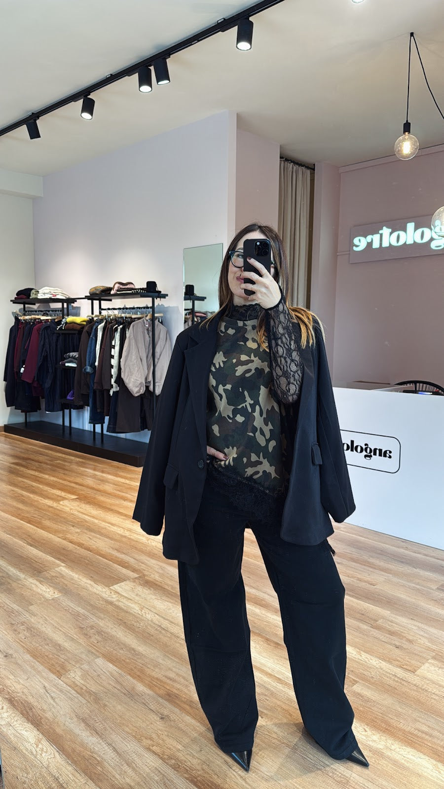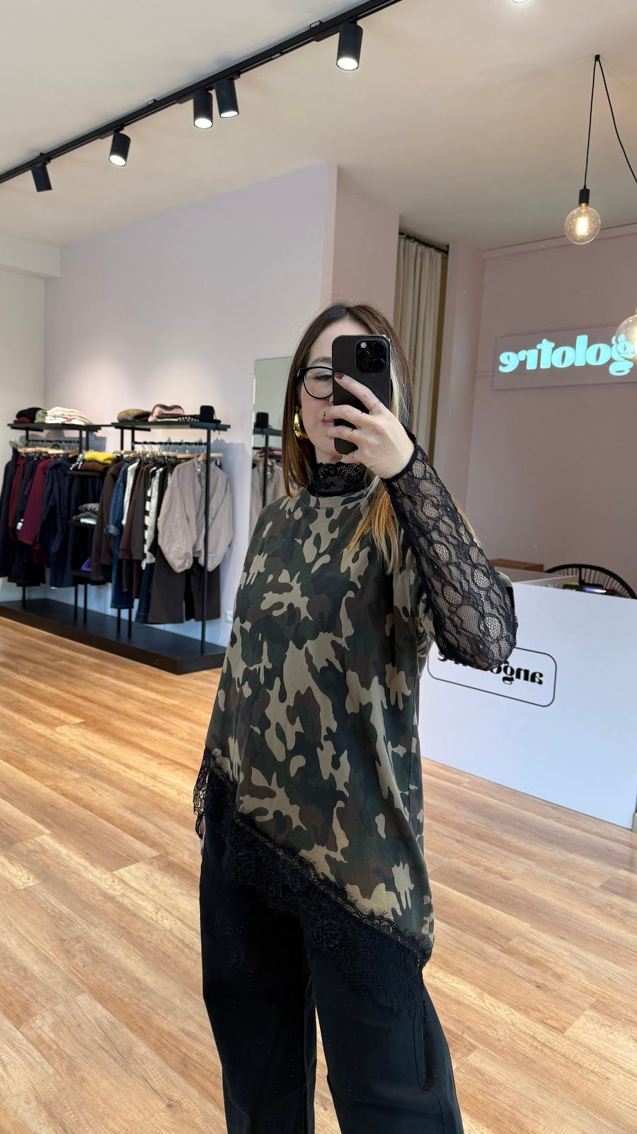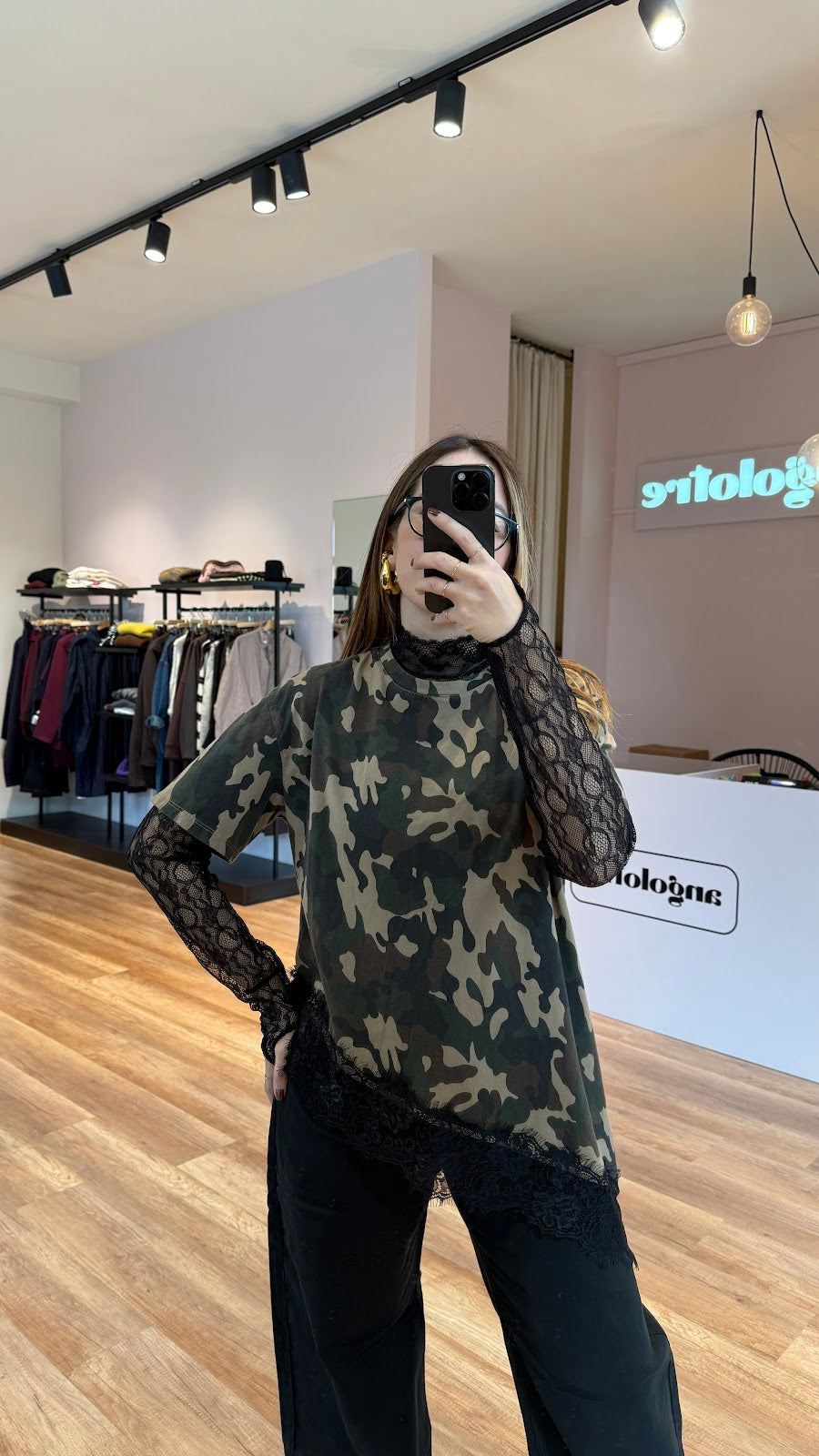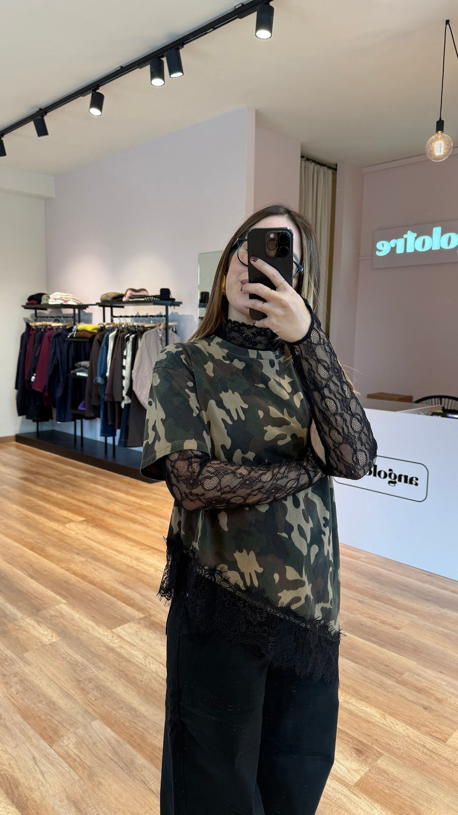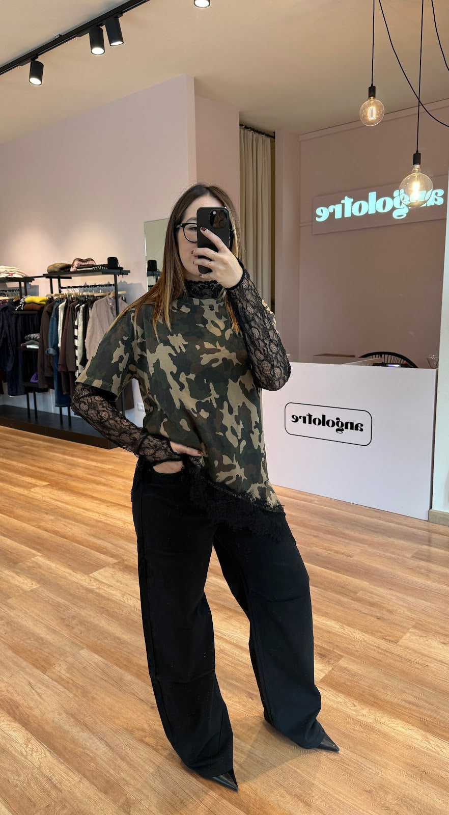 T-shirt Lumina asimmetrica 100% cotone, stampa camouflage, rifinitura orlo in pizzo. Vestibilità regolare. Greta veste una taglia 40/42.