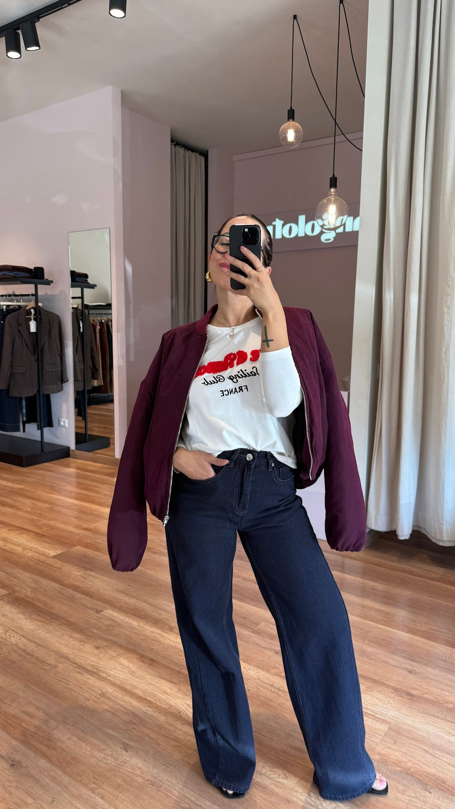 T-shirt in cotone manica lunga, con stampa in rilievo. Greta veste una taglia 40/42.