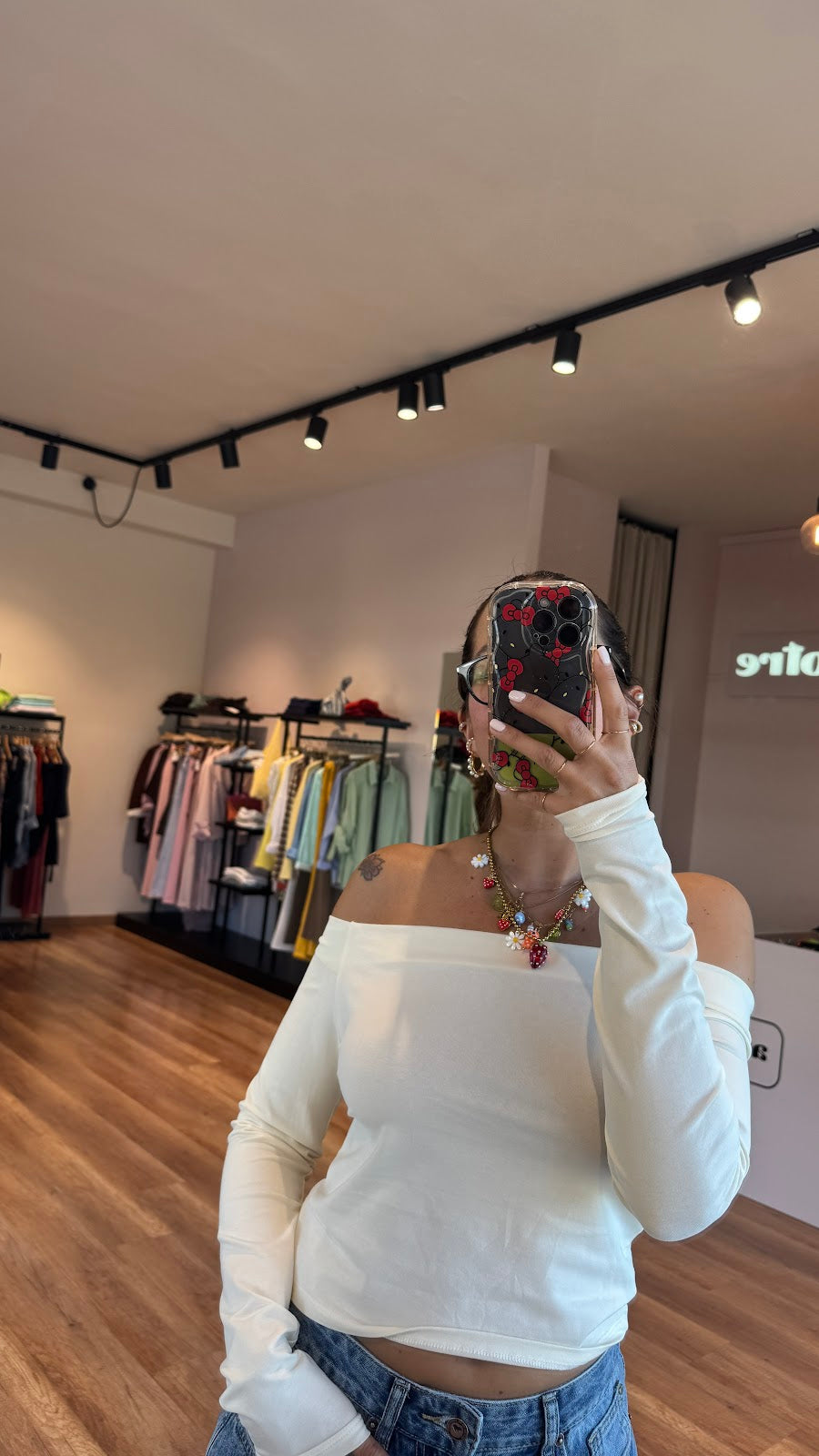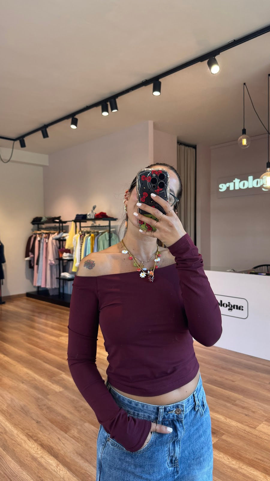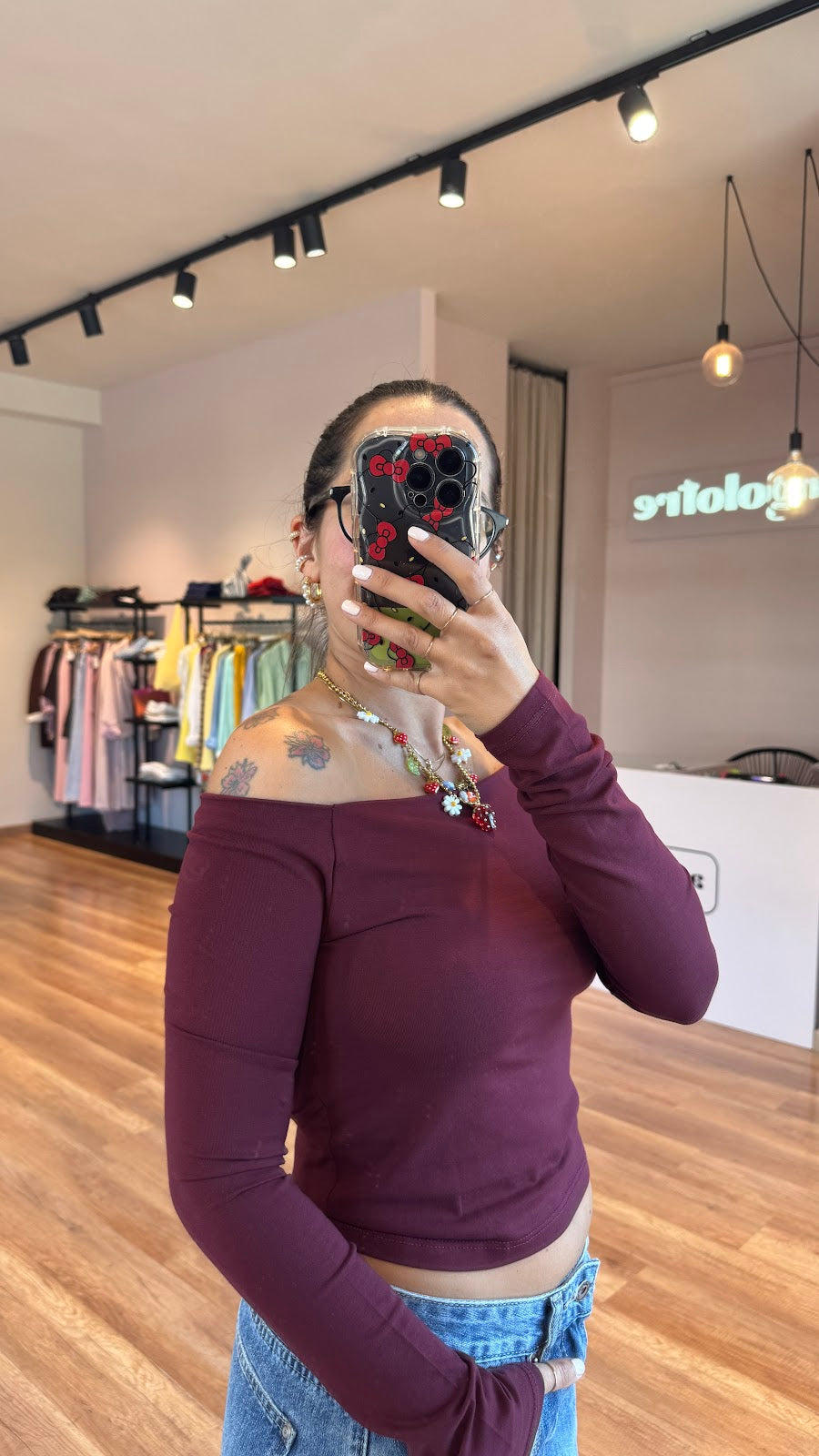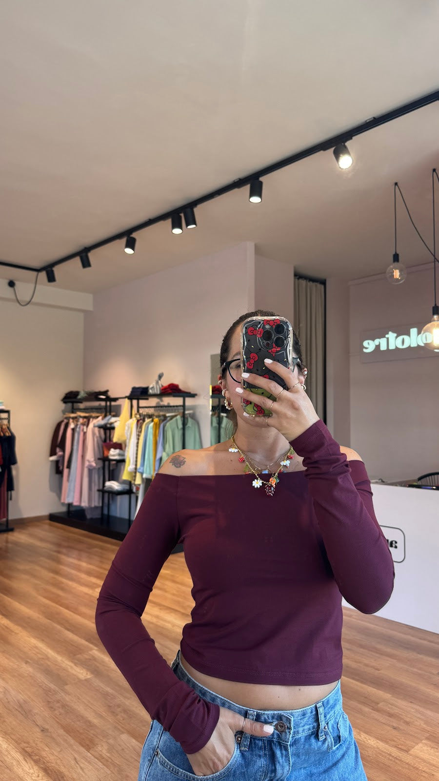 Top cropped manica lunga con scollo Bardot. Greta nella foto indossa una taglia S