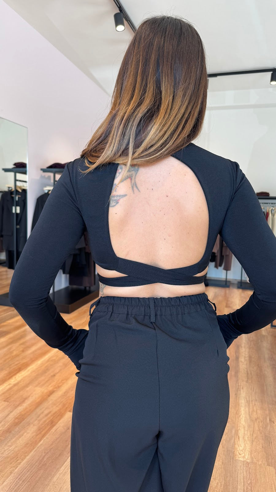 Croptop con manica a guanto e ampio scollo sulla schiena. Greta vesta una taglia 40/42.