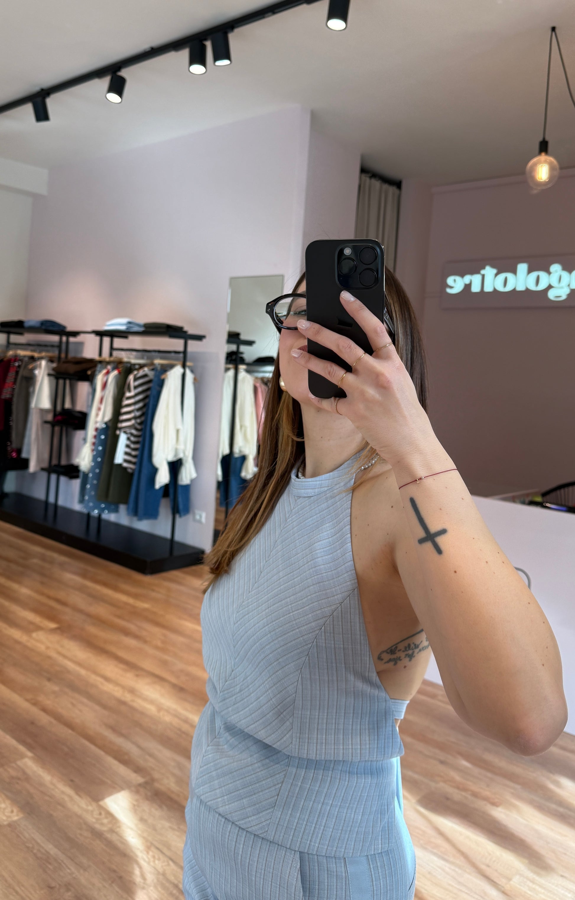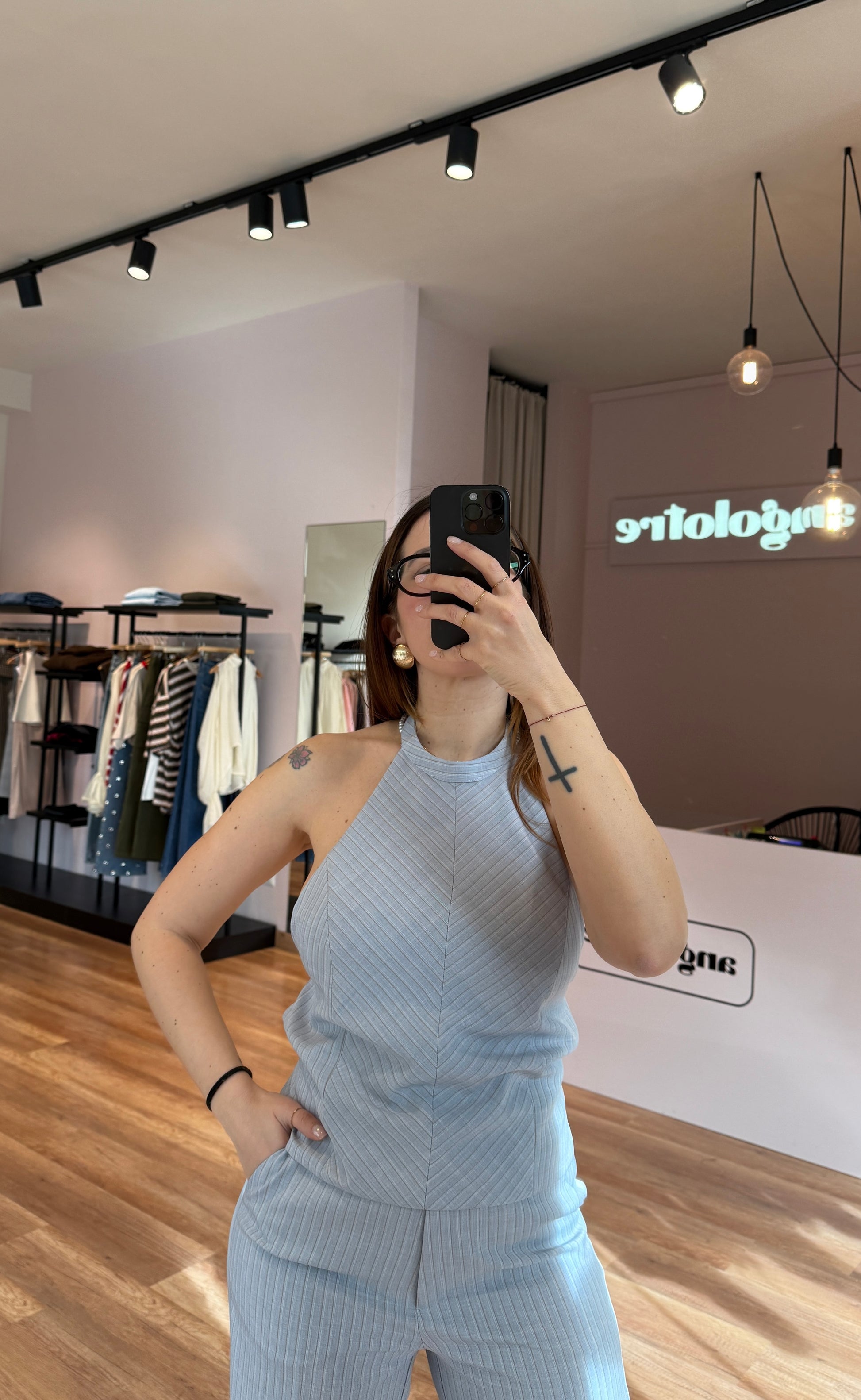 Top a righe sottili con scollo all'americana. Chiusura regolabile con laccetti sul retro.