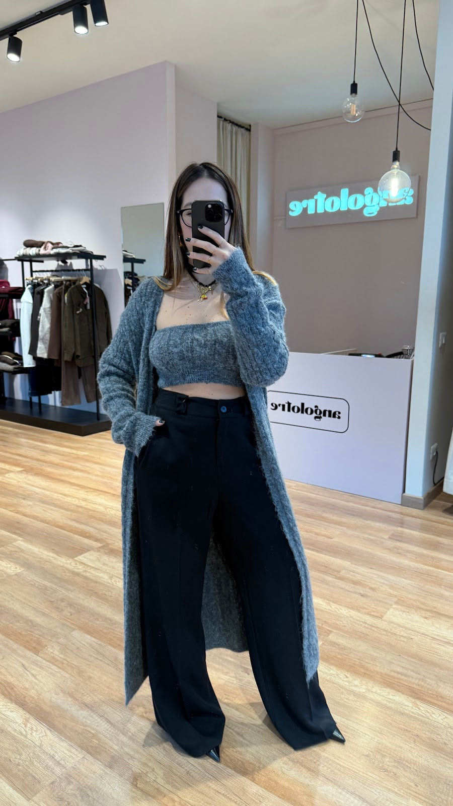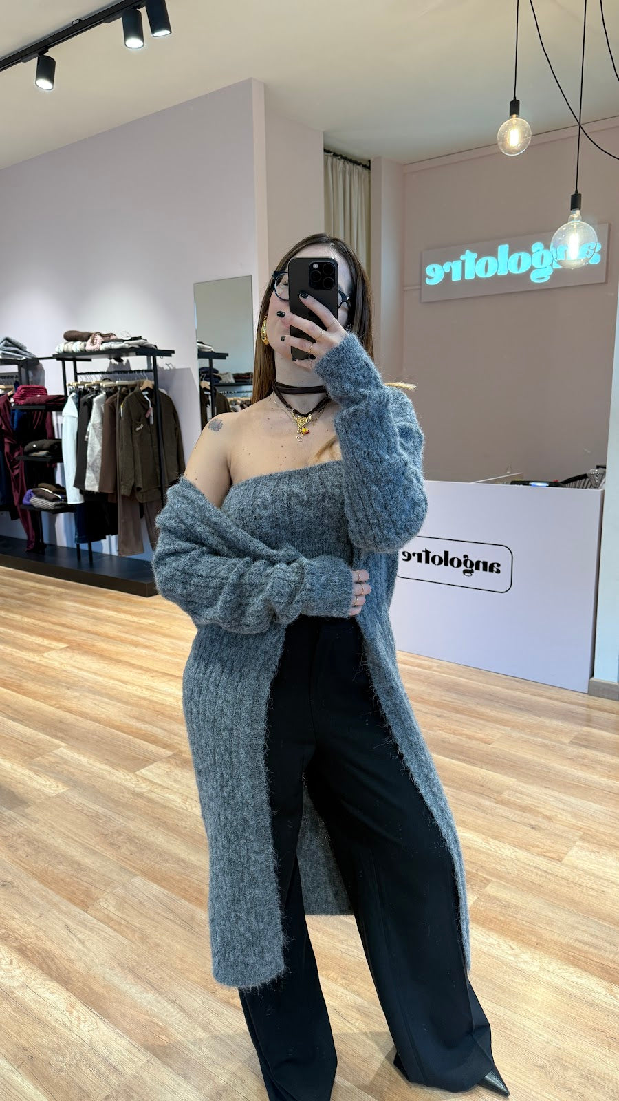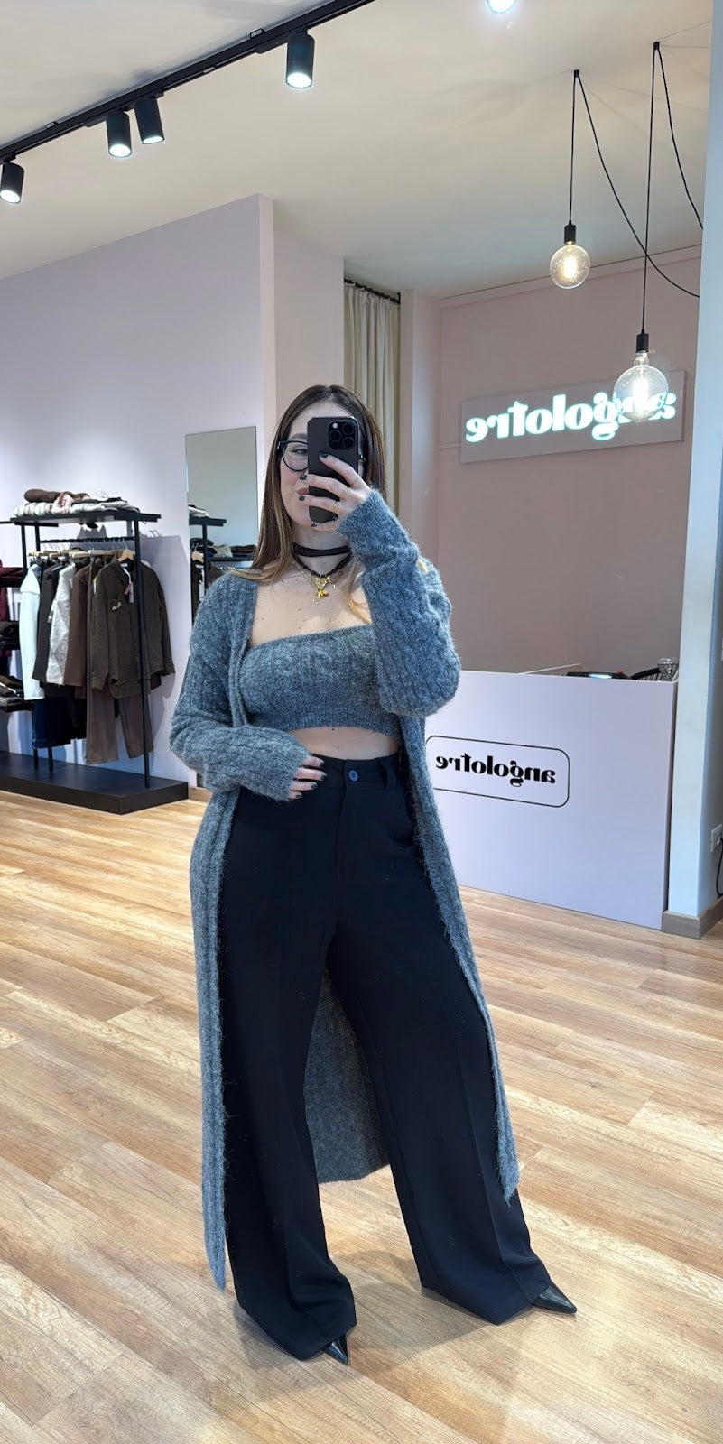 Twin-set in maglia a trecce, formato da cardigan lungo senza bottoni e toppino smanicato a fascia. Greta veste una taglia 40/42.
