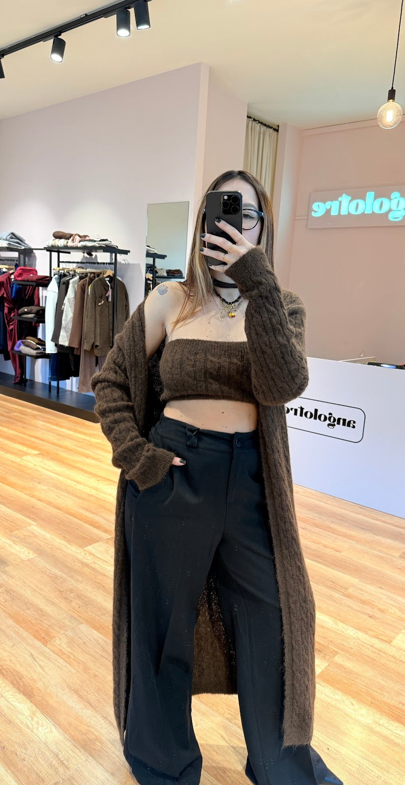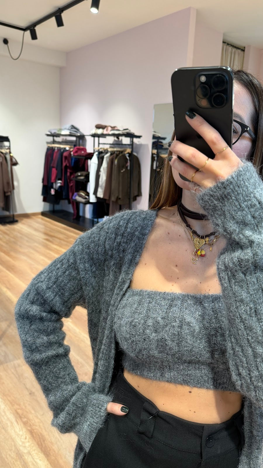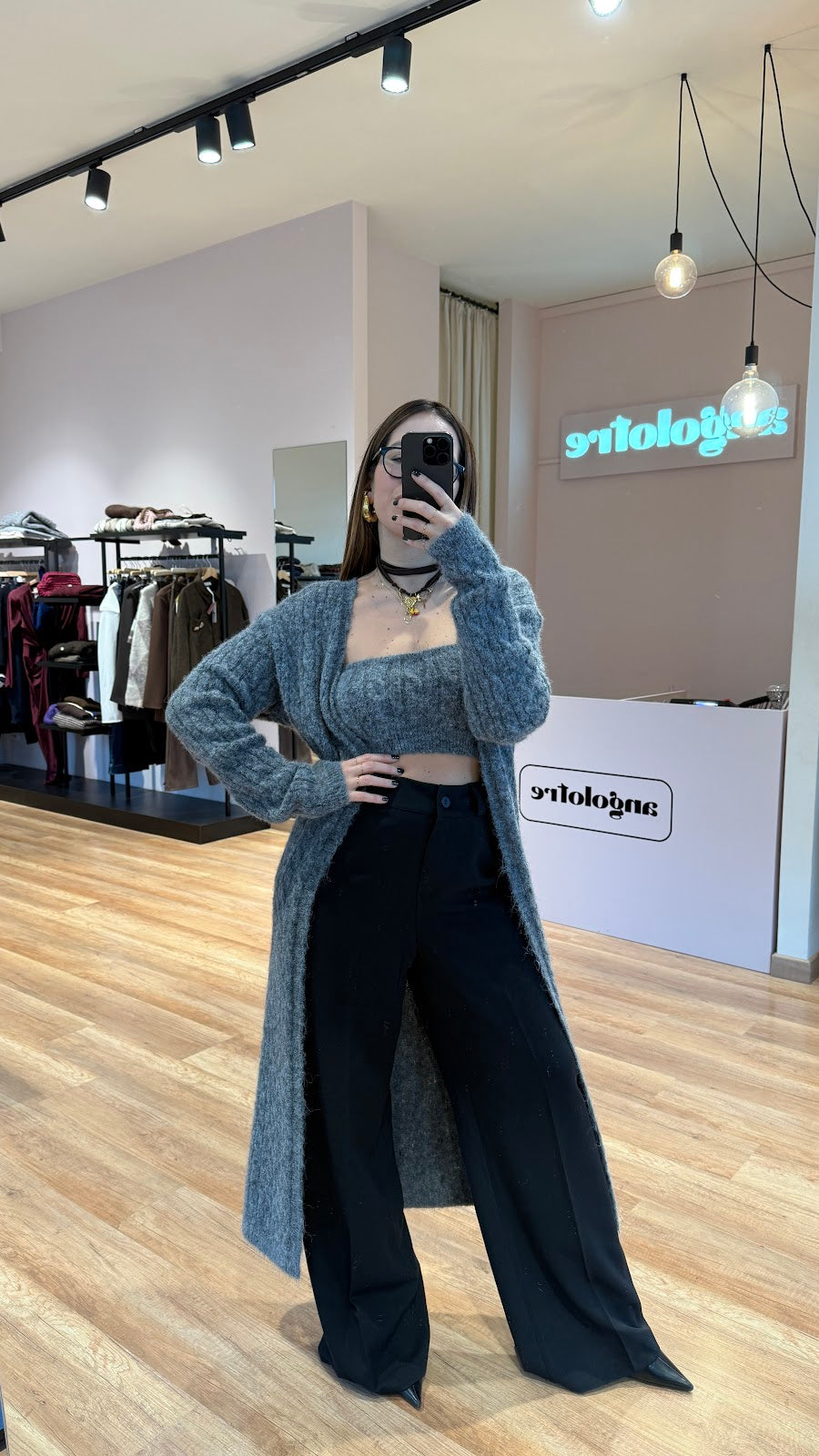 Twin-set in maglia a trecce, formato da cardigan lungo senza bottoni e toppino smanicato a fascia. Greta veste una taglia 40/42.