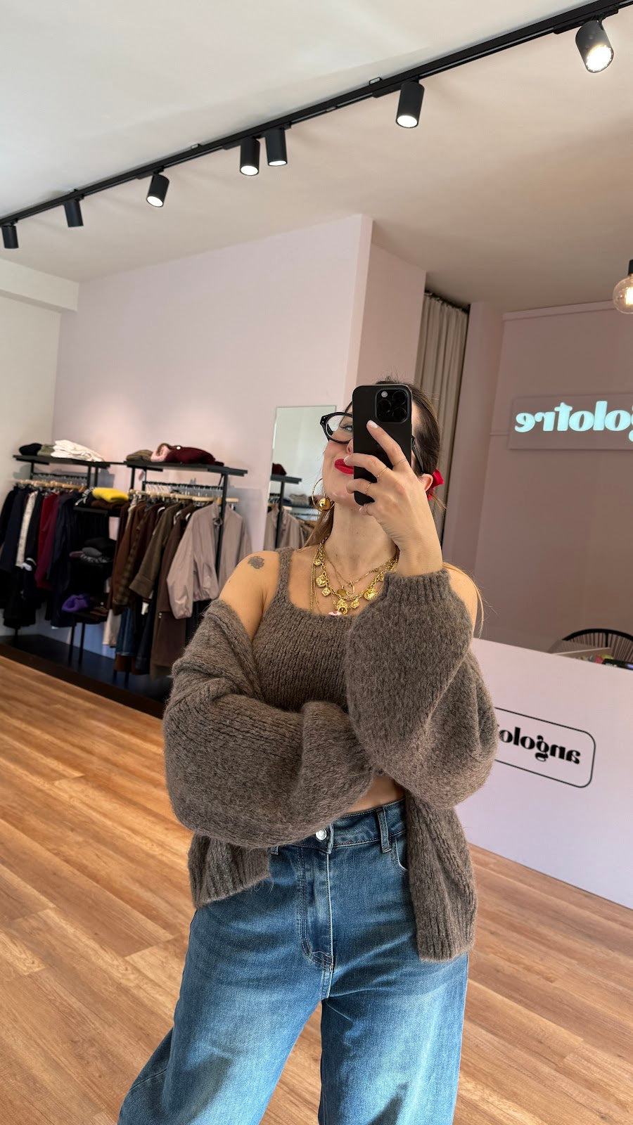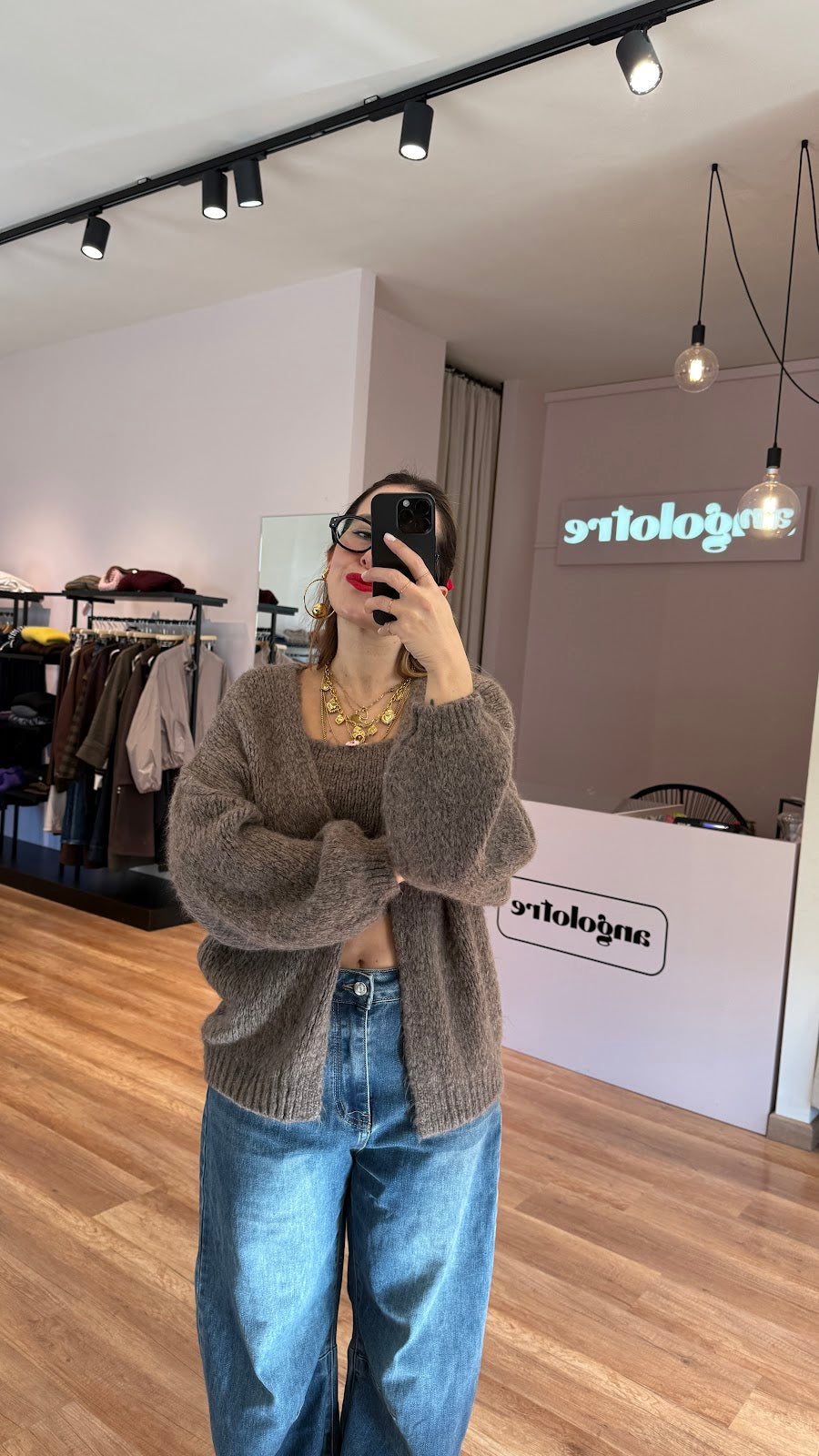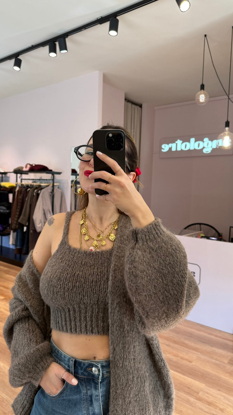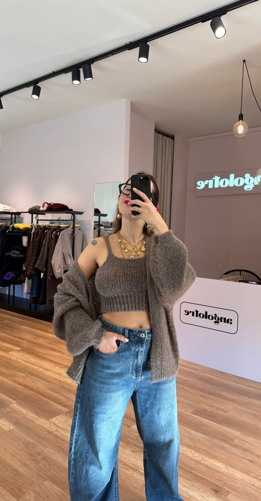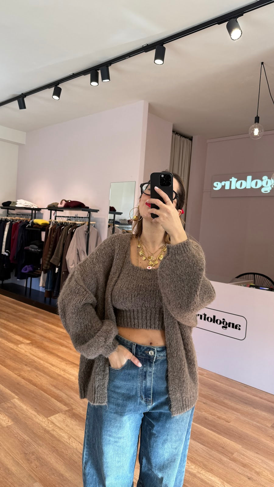 Twin-set in maglia larga, composto da top crop e cardigan senza bottoni over. Taglia unica, veste fino ad una taglia L. Greta veste una taglia 40/42.